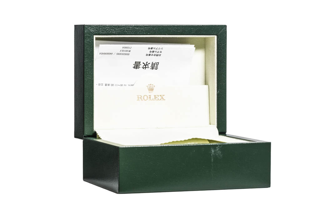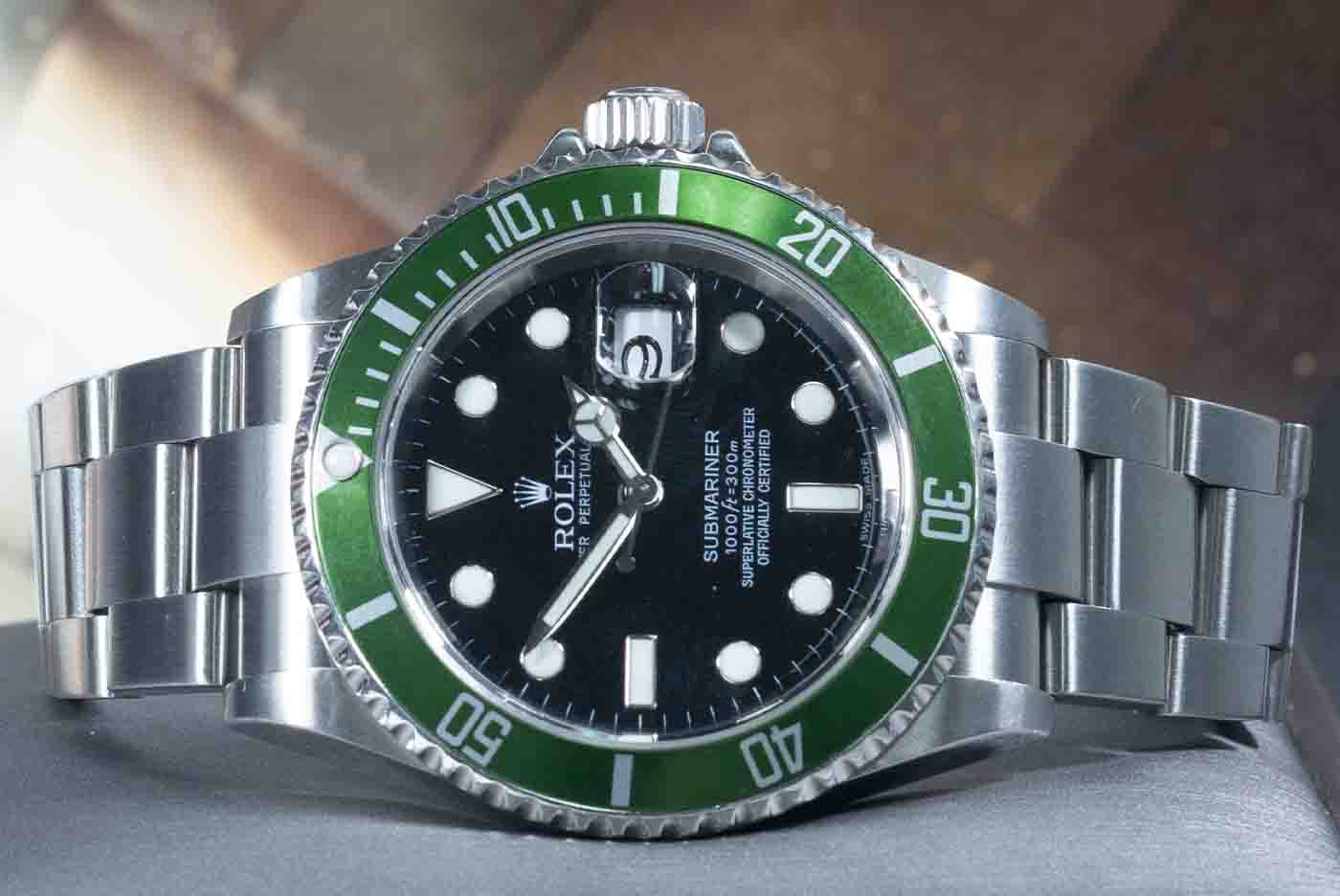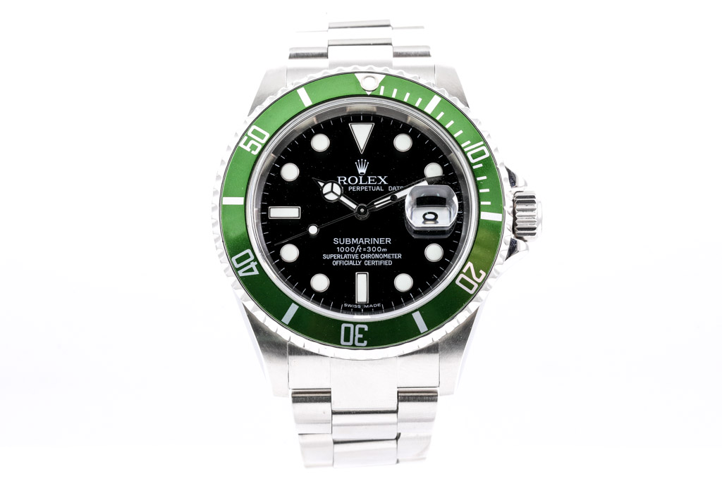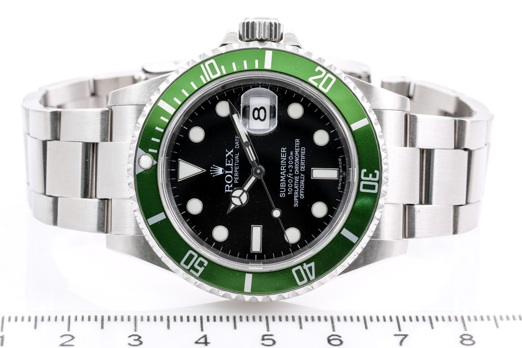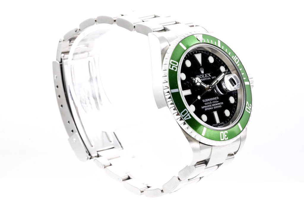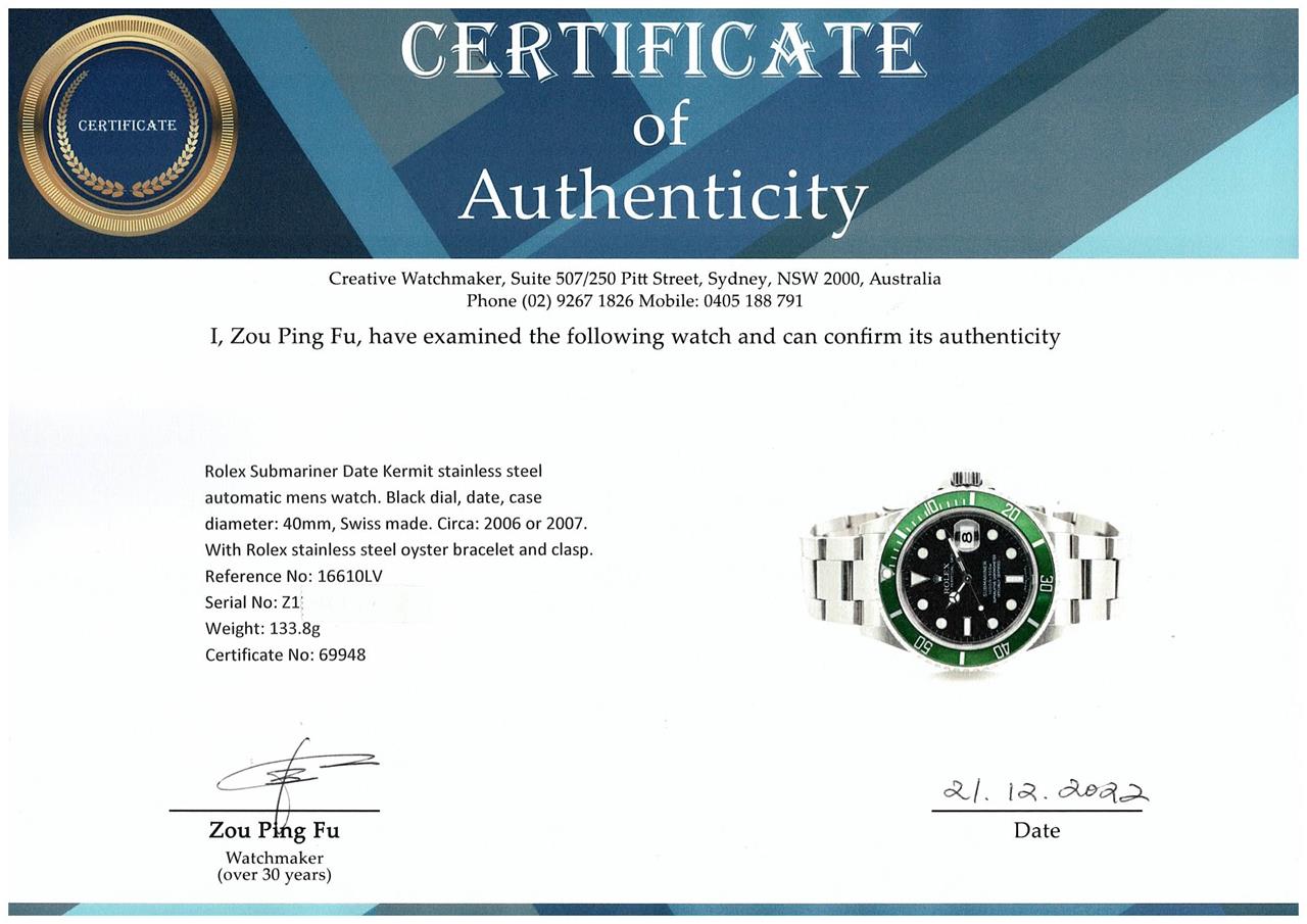 Rolex Submariner Date Kermit stainless steel automatic mens watch. Black dial, date, case diameter: 40mm, wrist size: 19cm, Swiss made. Ref# 16610LV. Circa: 2006 or 2007. With Rolex stainless steel oyster bracelet and clasp. With Certificate of Authenticity and Rolex box. 3 month FSA warranty (Pre-owned)