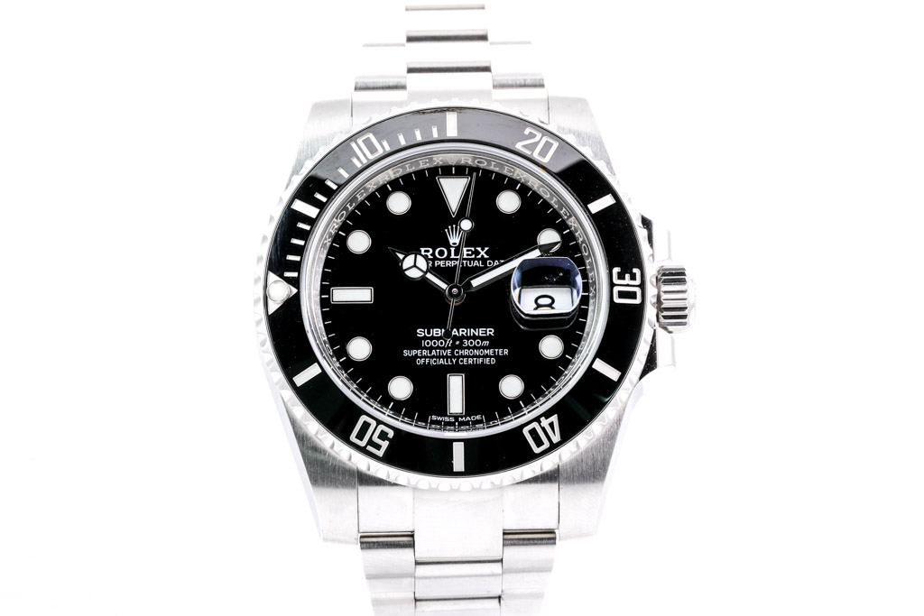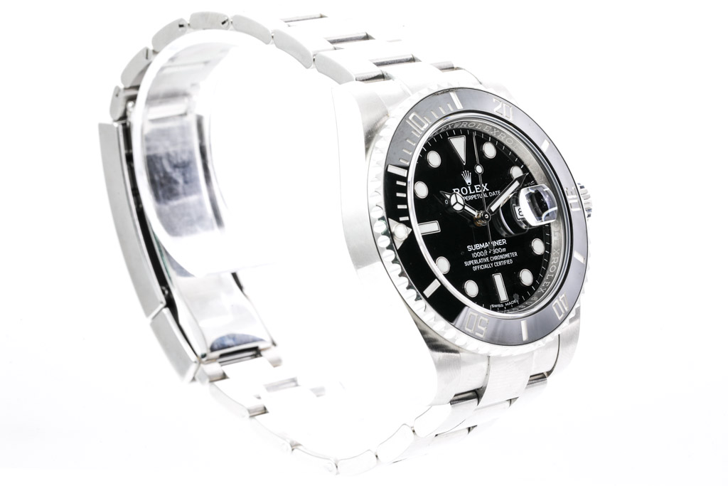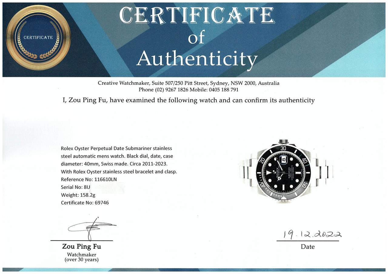 Rolex Oyster Perpetual Date Submariner stainless steel automatic mens watch. Black dial, date, case diameter: 40mm, wrist size: 21cm, Swiss made. Ref# 116610LN. Circa 2011-2023. With Rolex Oyster stainless steel bracelet and clasp. With Certificate of Authenticity and Rolex box. 3 month FSA warranty. (Pre-owned)