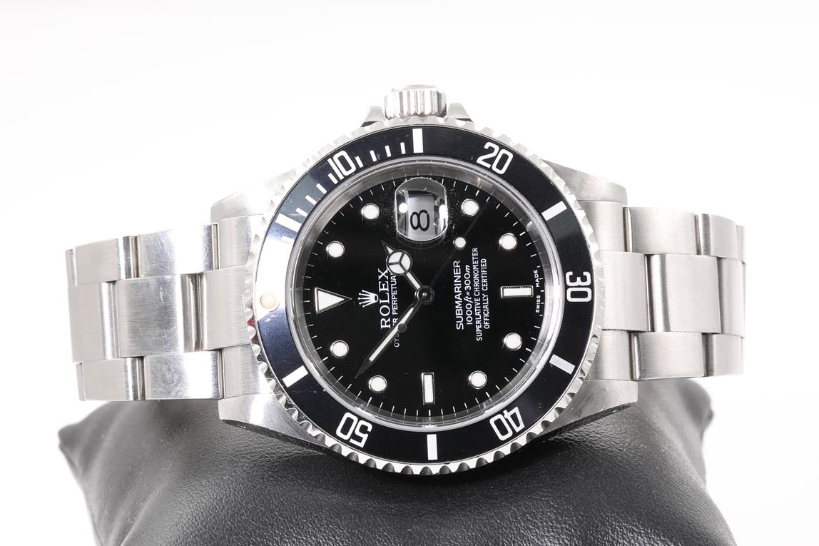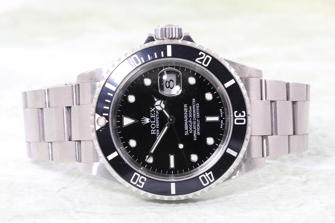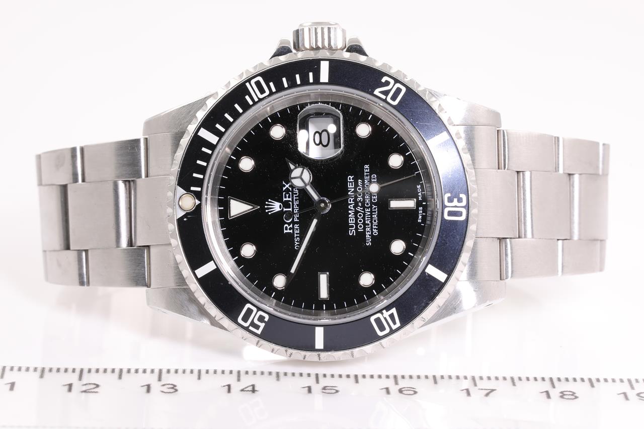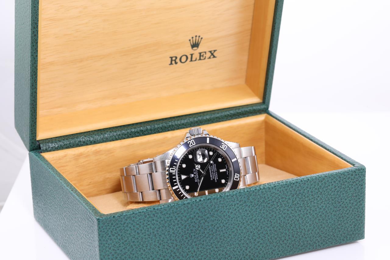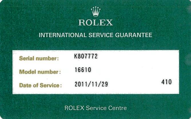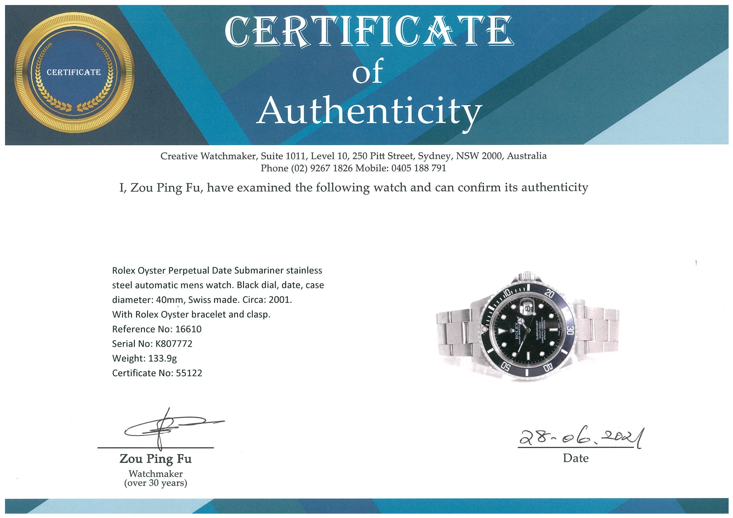 Rolex Oyster Perpetual Submariner Date stainless steel automatic mens watch. Black dial, date, case diameter: 40mm, wrist size: 19cm, Swiss made. Ref# 16610, Circa: 2001. With Rolex Oyster bracelet and clasp. With certificate of authenticity, Rolex international service guarantee card dated 29/11/2011 and Rolex box. 3 month FSA warranty. (Pre-owned)