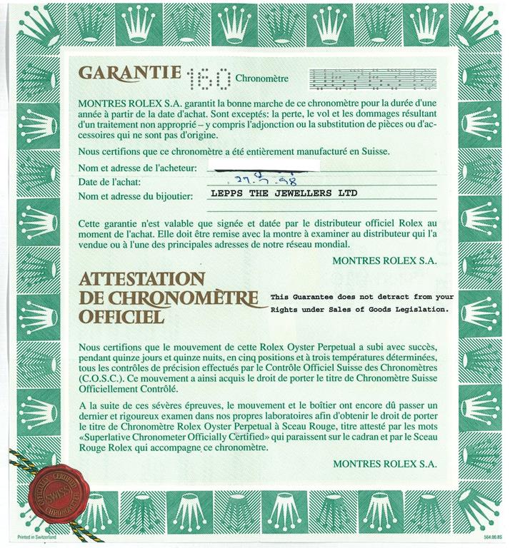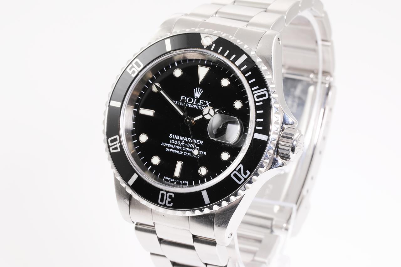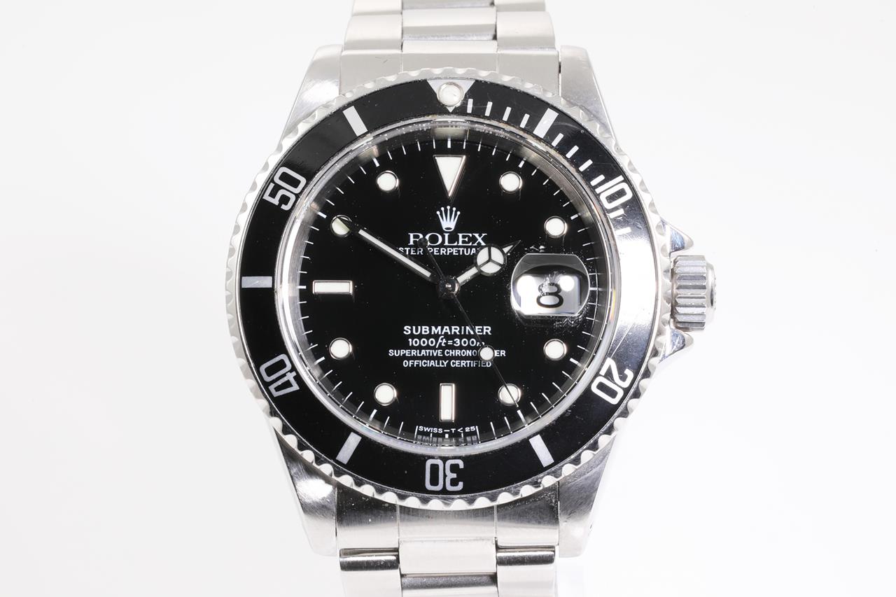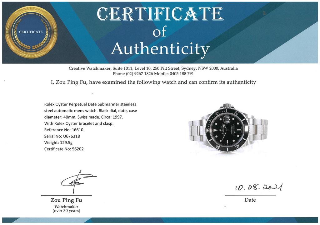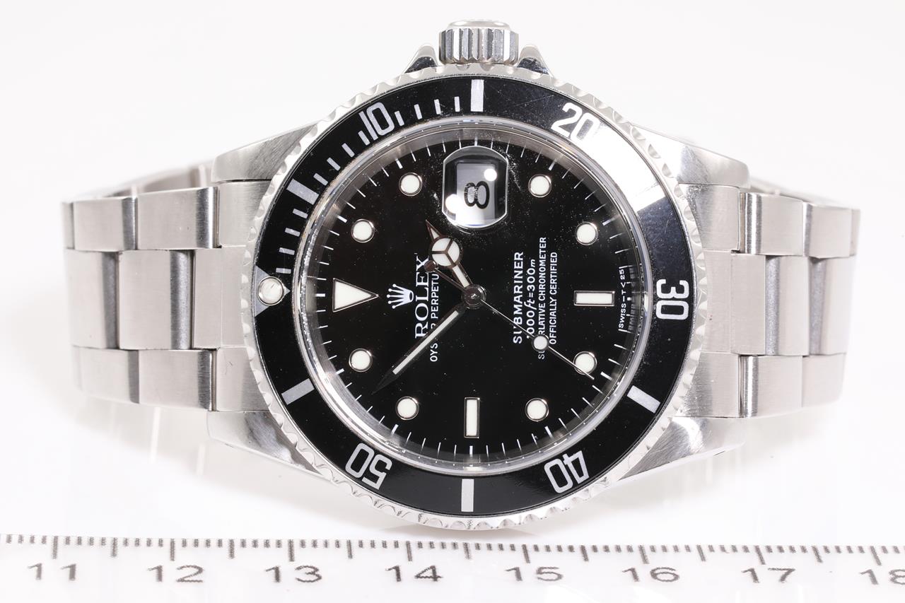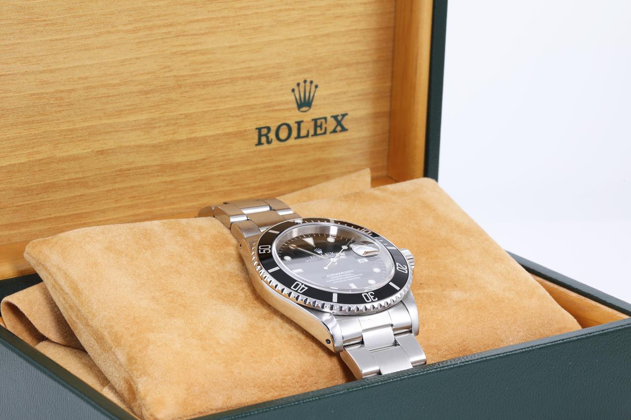 Rolex Oyster Perpetual Submariner Date stainless steel automatic mens watch. Black dial, date, case diameter: 40mm, wrist size: 18cm, Swiss made. Ref# 16610, Circa: 1997. With Rolex Oyster bracelet and clasp. With certificate of authenticity, Rolex guarantee certificate dated 27/07/1998 and Rolex box. 3 month FSA warranty. (Pre-owned)