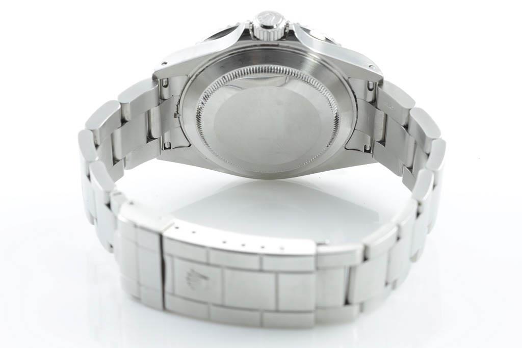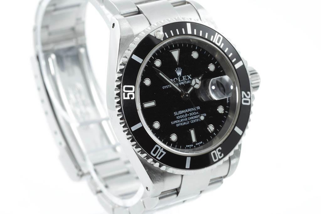 Rolex Oyster Perpetual Date Submariner stainless steel automatic mens watch. Black dial, date, case diameter: 40mm, wrist size: 16.5cm, Swiss made. Ref# 16610. Circa 2005 or 2006. With Rolex stainless steel Oyster bracelet and clasp. With Certificate of Authenticity and Rolex box. 3 month FSA warranty. (Pre-owned)