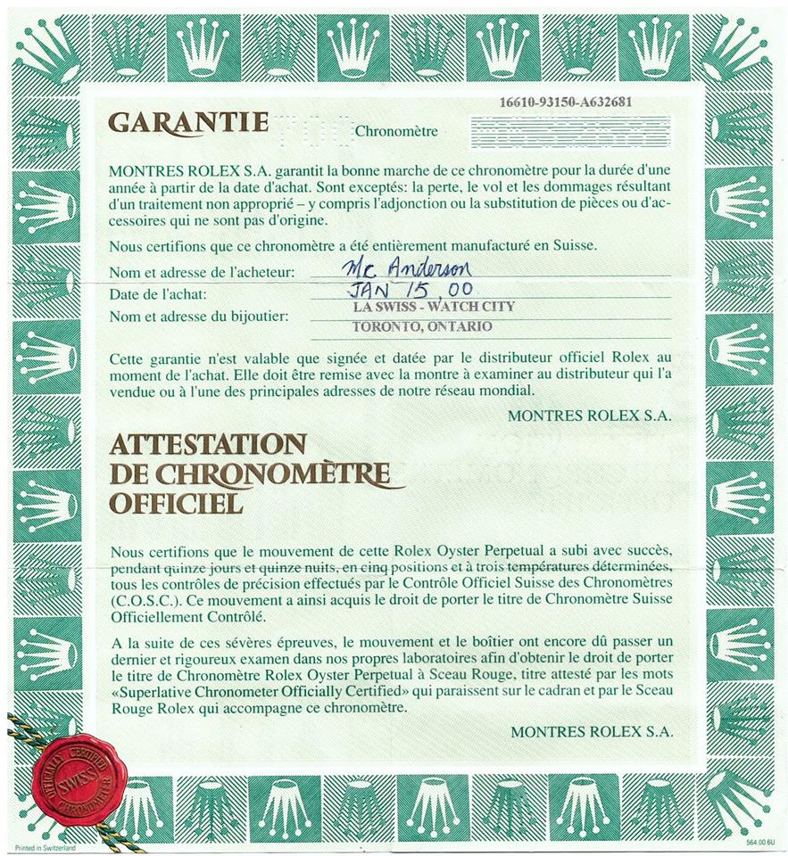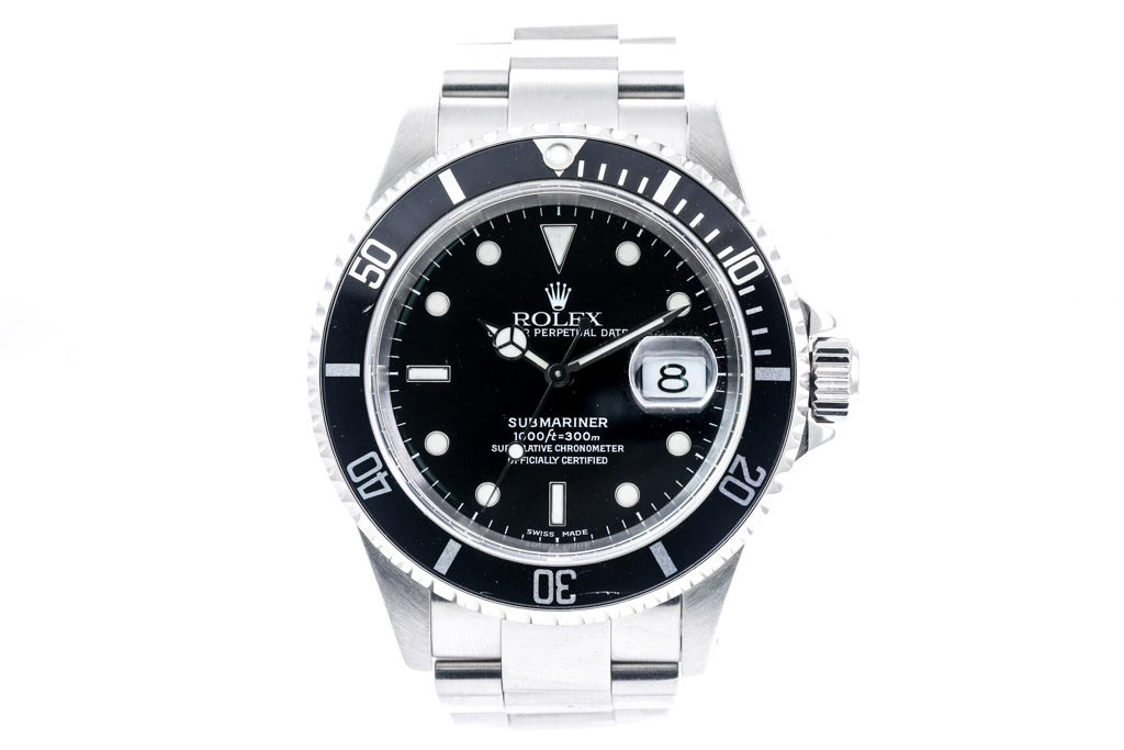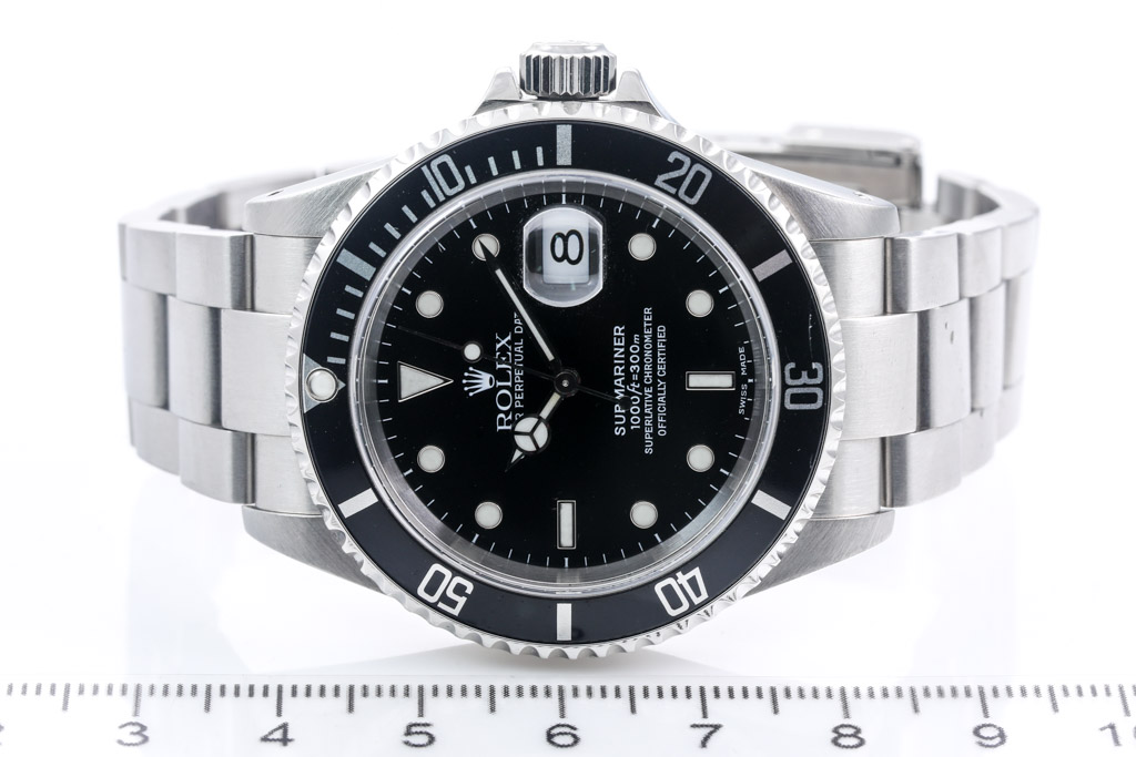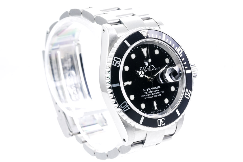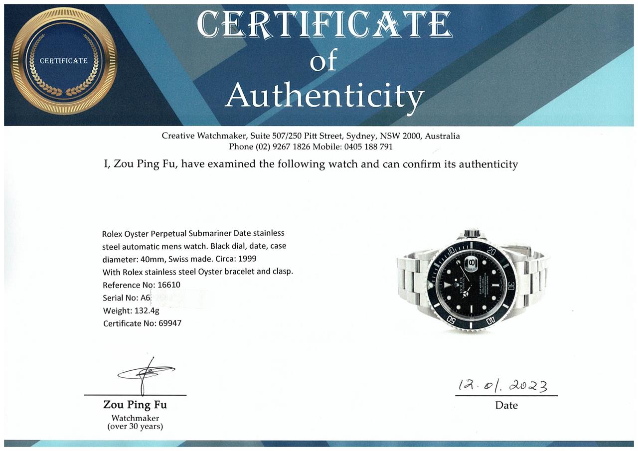 Rolex Oyster Perpetual Submariner Date stainless steel automatic mens watch. Black dial, date, case diameter: 40mm, wrist size: 17.5cm, Swiss made. Ref# 16610. Circa: 1999. With Rolex stainless steel Oyster bracelet and clasp. With Certificate of Authenticity, Rolex Guarantee Certificate dated 15/01/2000 and Rolex box. 3 month FSA warranty (Pre-owned)