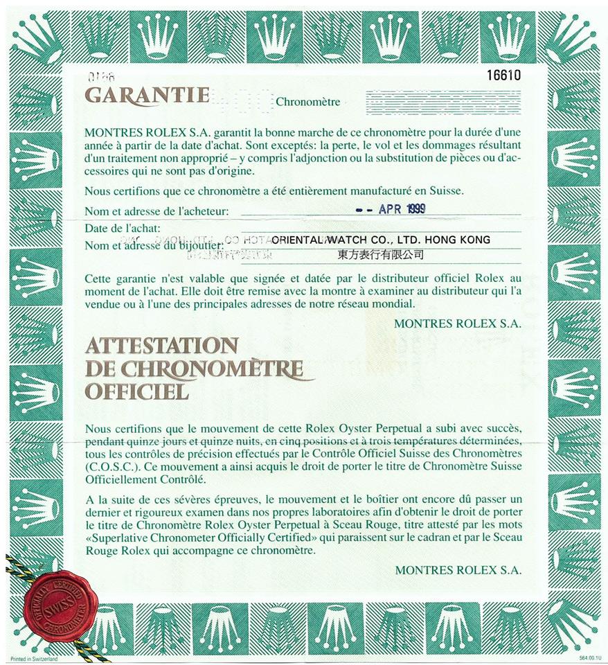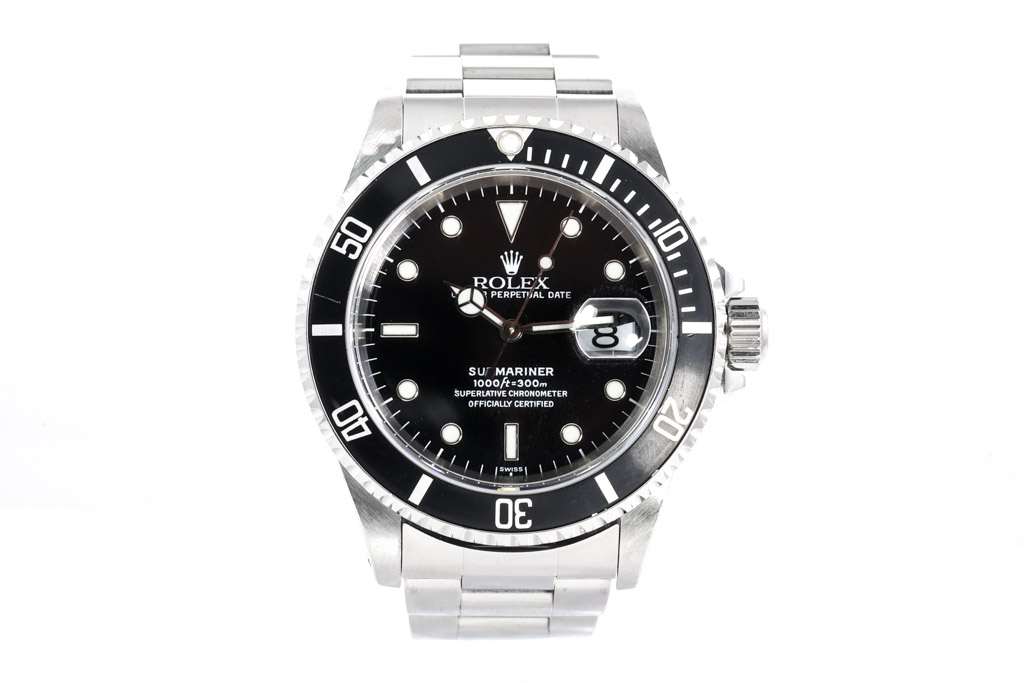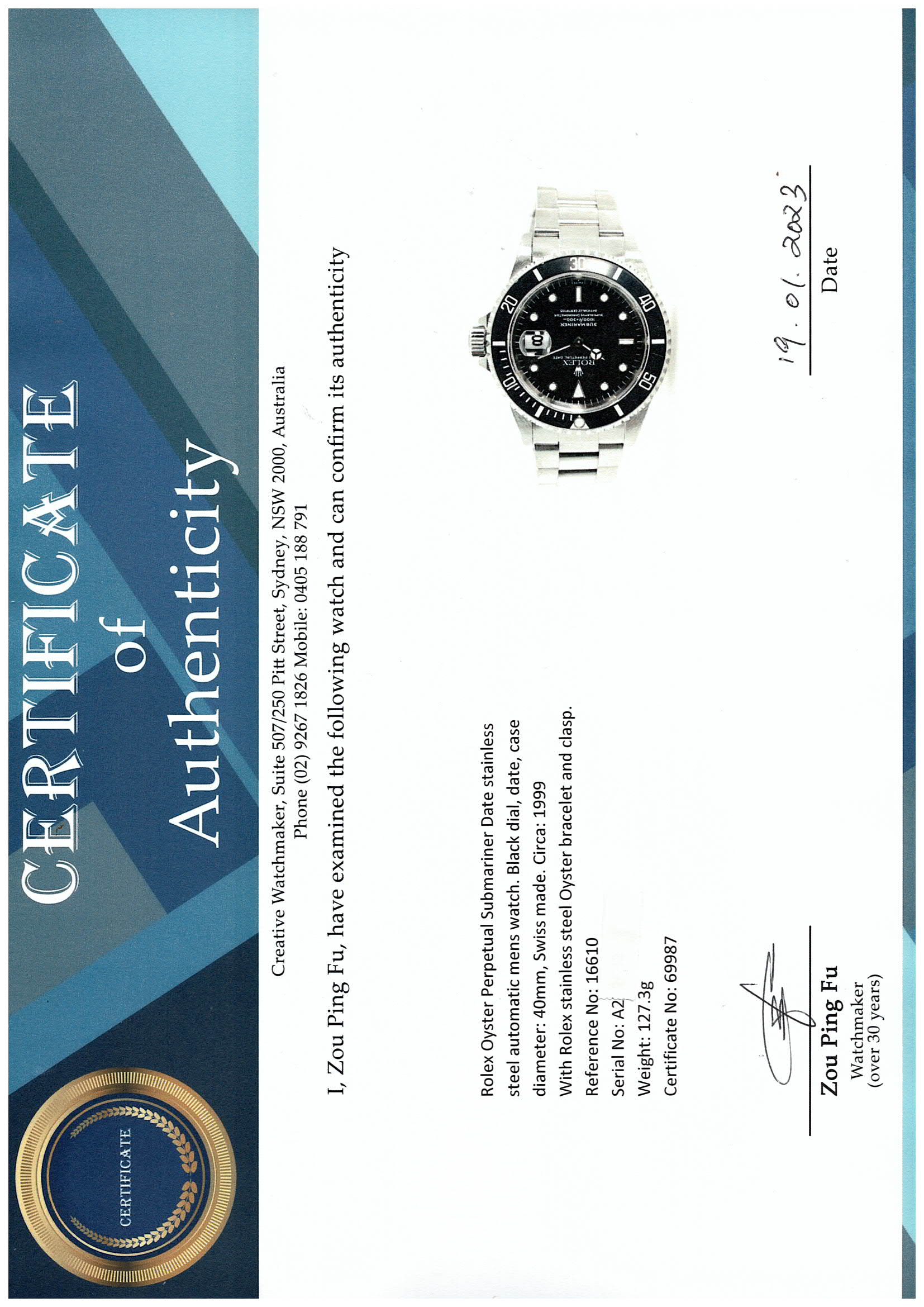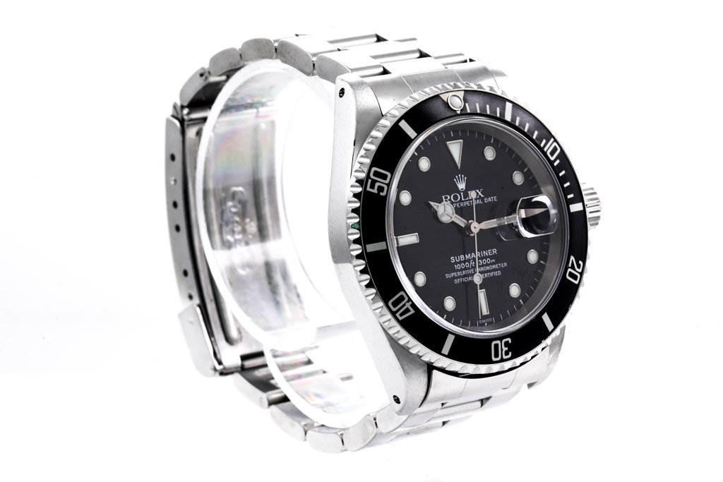 Rolex Oyster Perpetual Submariner Date stainless steel automatic men's watch. Black dial, date, case diameter: 40mm, wrist size: 17cm, Swiss made. Ref# 16610. Circa: 1999. With Rolex stainless steel Oyster bracelet and clasp. With Certificate of Authenticity, Rolex Guarantee Certificate dated 04/1999 and Rolex box. 3 month FSA warranty (Pre-owned).
