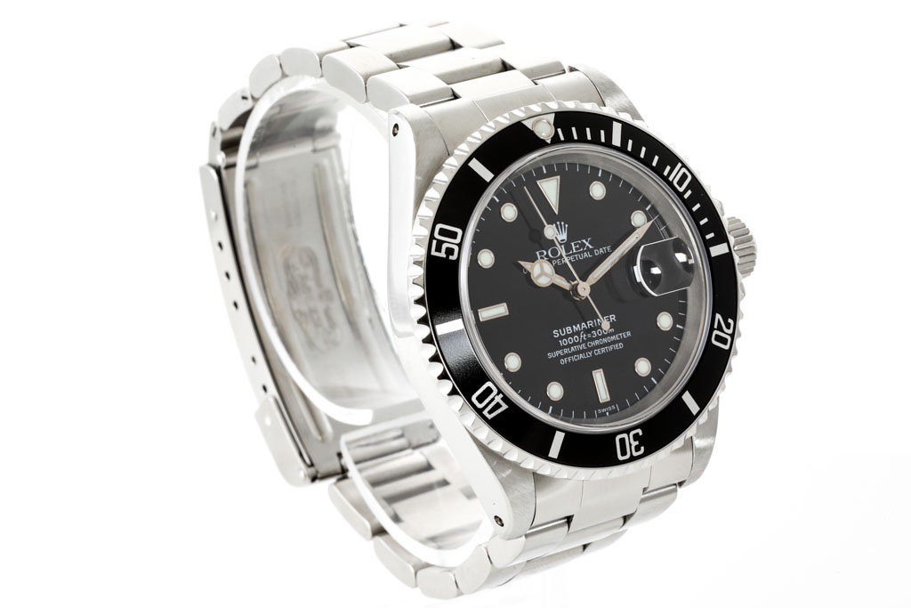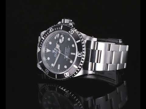 Rolex Oyster Perpetual Submariner Date stainless steel automatic mens watch. Black dial, date, case diameter: 40mm, wrist size: 17.5cm, Swiss made. Ref# 16610. Circa: 1999. With Rolex stainless steel Oyster bracelet and clasp. With Certificate of Authenticity and Rolex box. (Pre-owned).