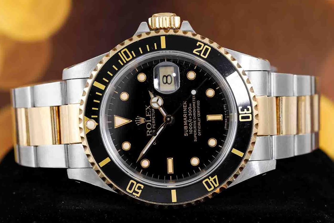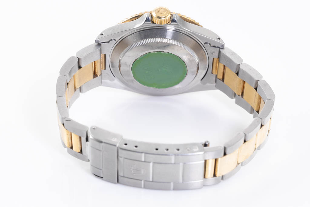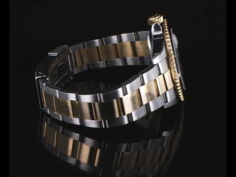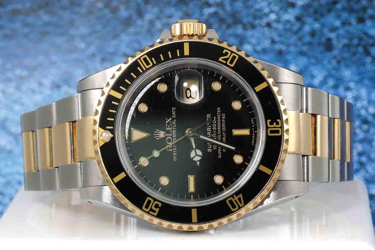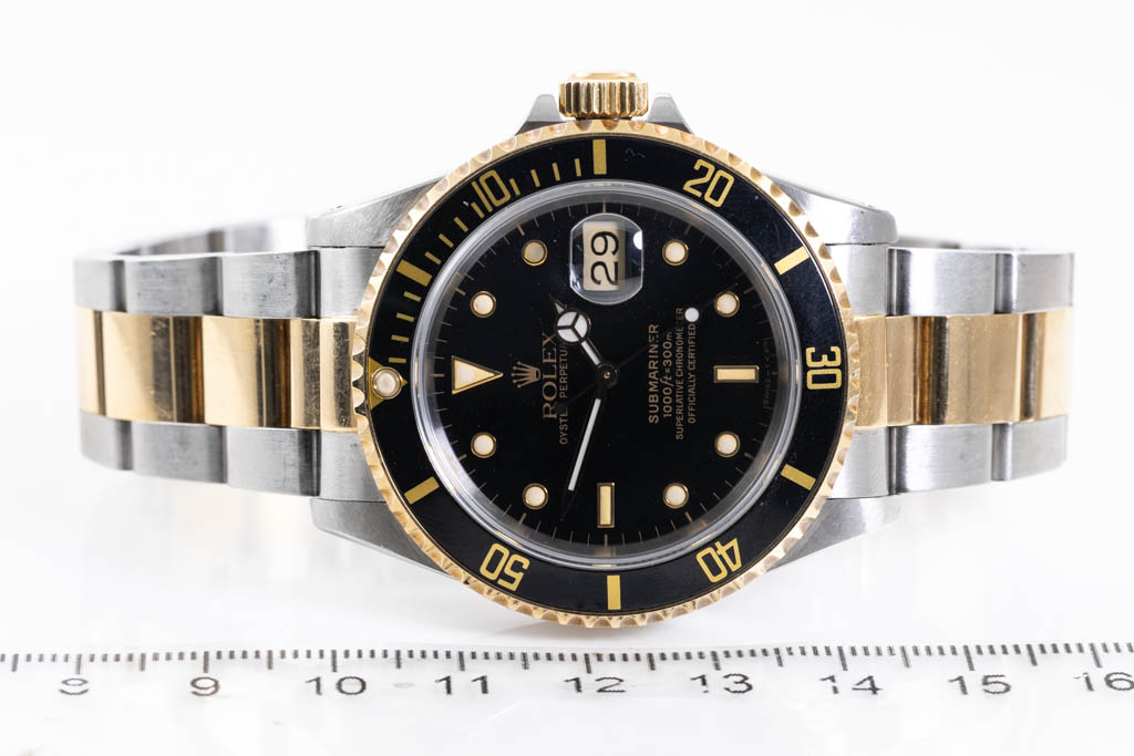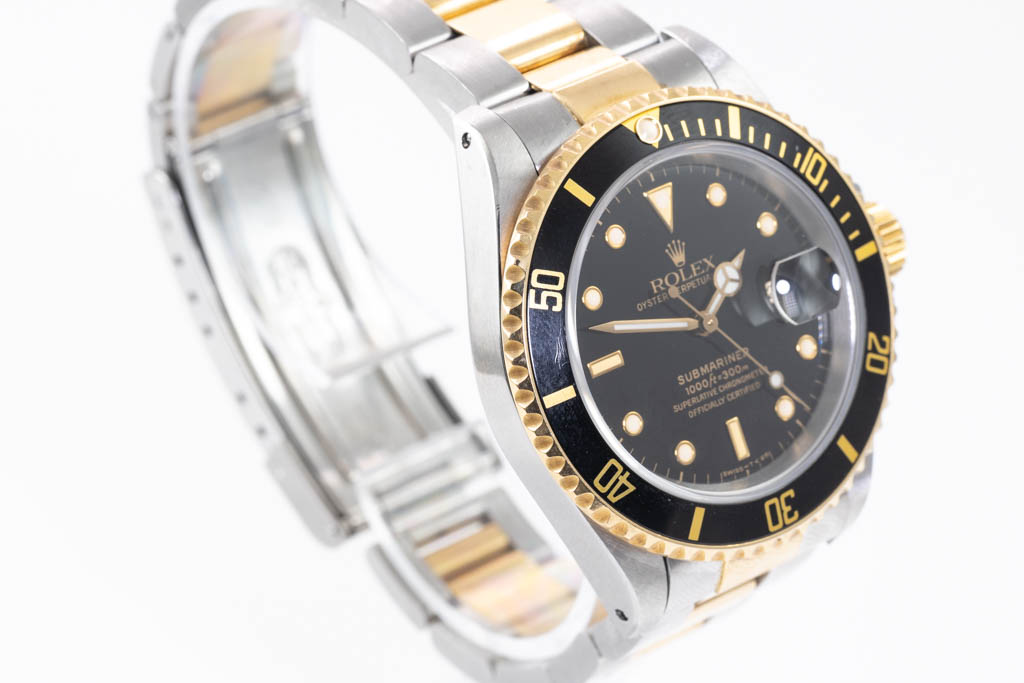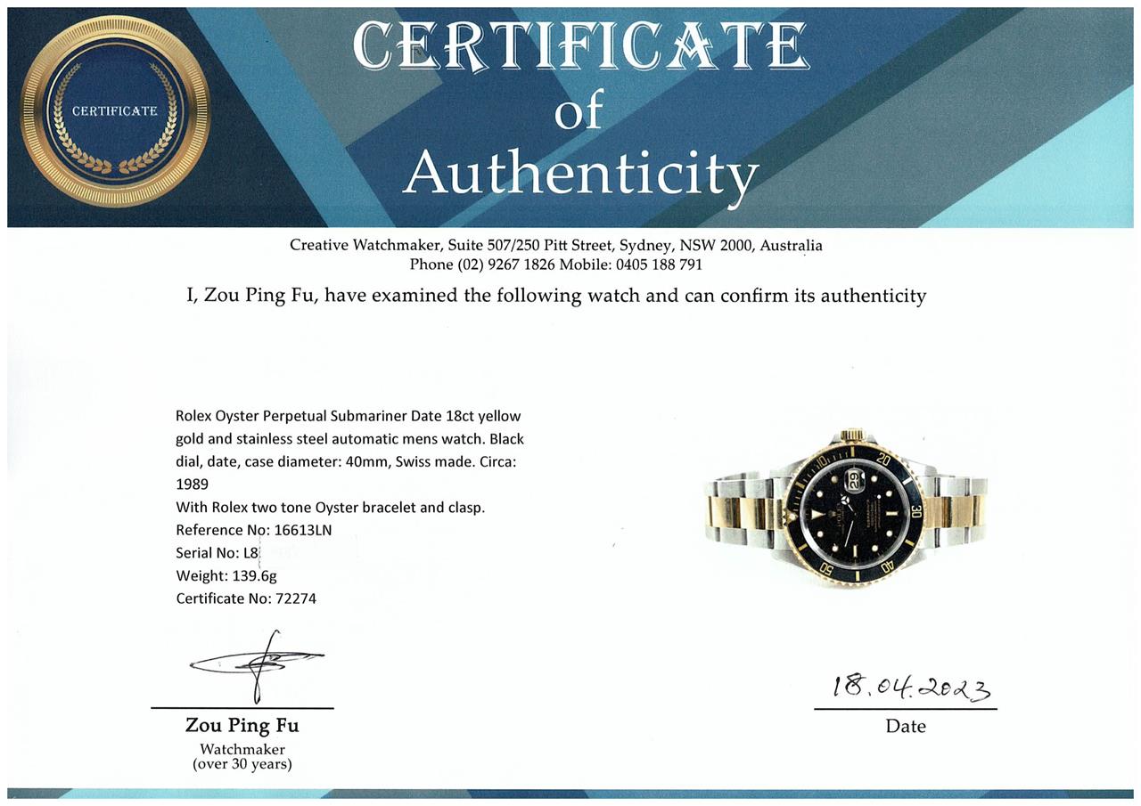 Rolex Oyster Perpetual Submariner Date 18ct yellow gold and stainless steel automatic mens watch. Black dial, date, case diameter: 40mm, wrist size: 19cm, Swiss made. Ref# 16613LN, Circa: 1989. With Rolex two tone Oyster bracelet and clasp. With Certificate of Authenticity and Rolex box. 3 month FSA warranty (Pre-owned)