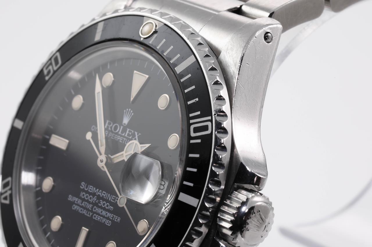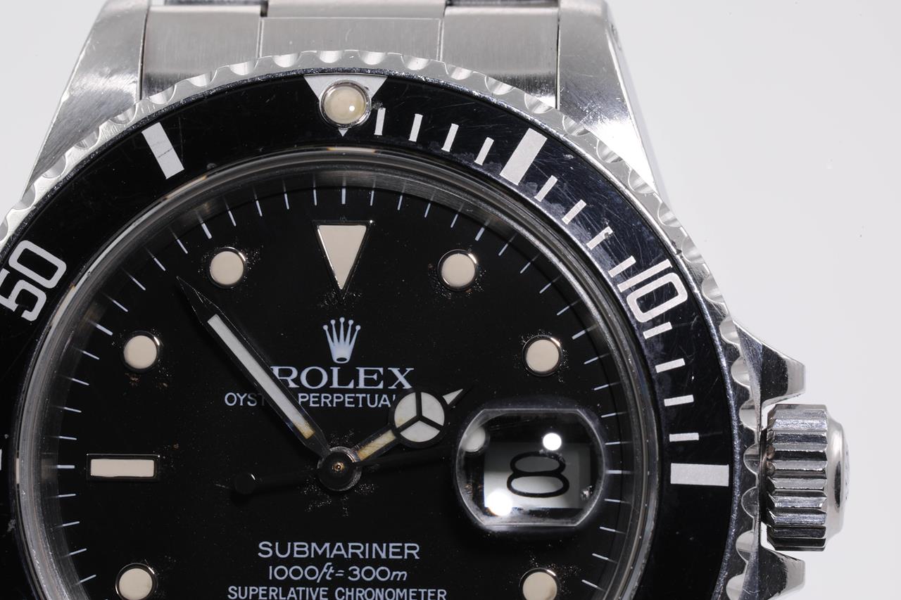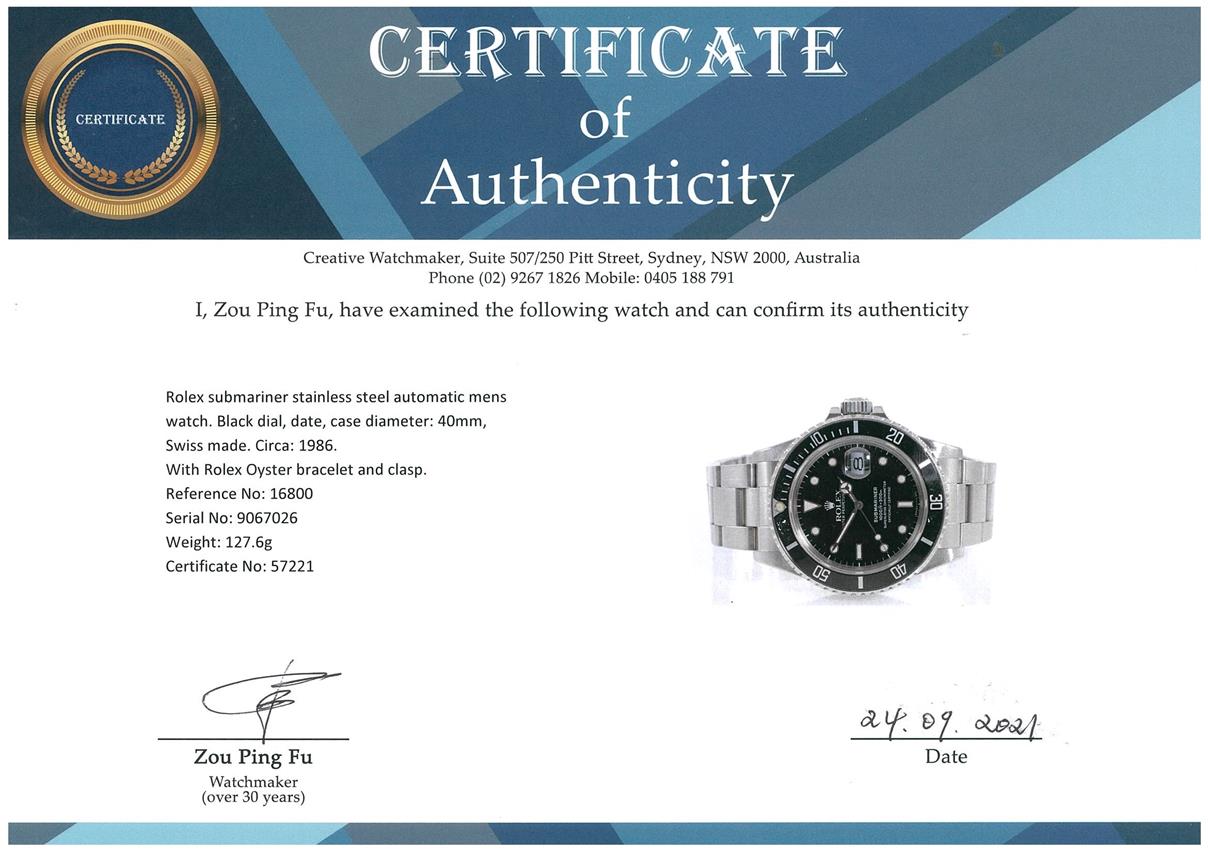 Rolex Submariner Date stainless steel automatic mens watch. Black dial, date, case diameter: 40mm, wrist size: 18cm, Swiss made. Ref# 16800, Circa: 1986. With Rolex Oyster bracelet and clasp. With certificate of authenticity & Rolex box. 3 month FSA warranty. (Pre-owned)