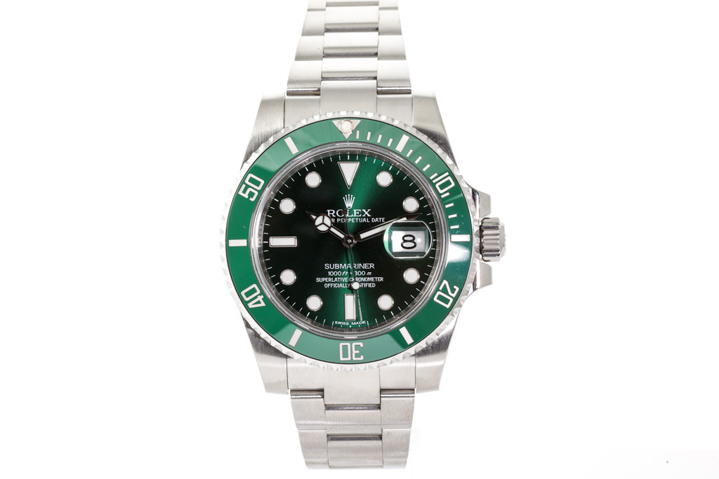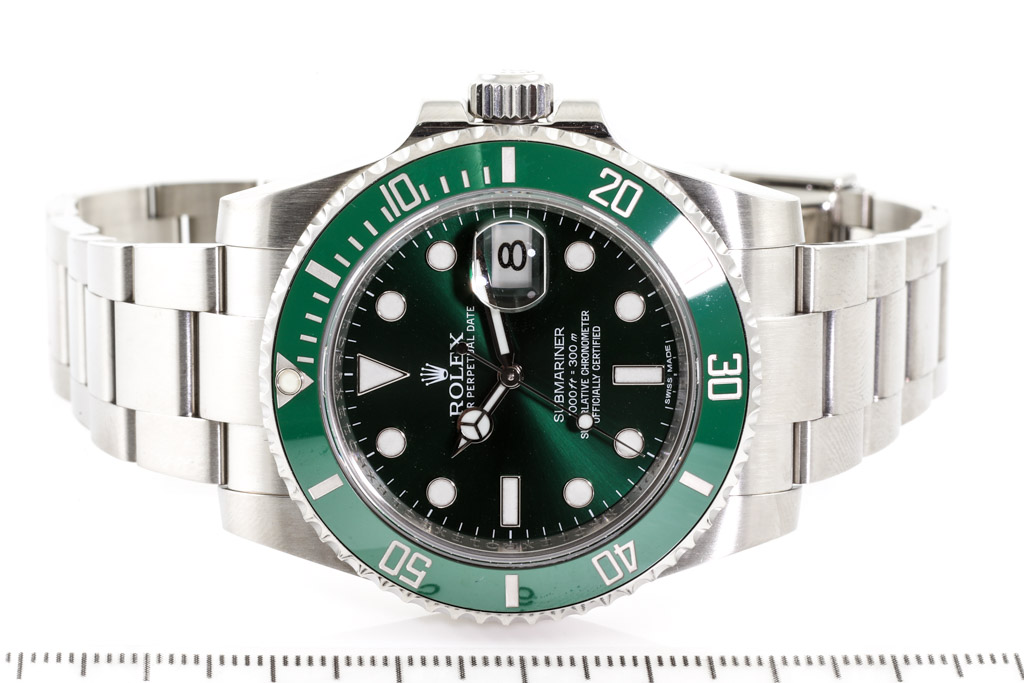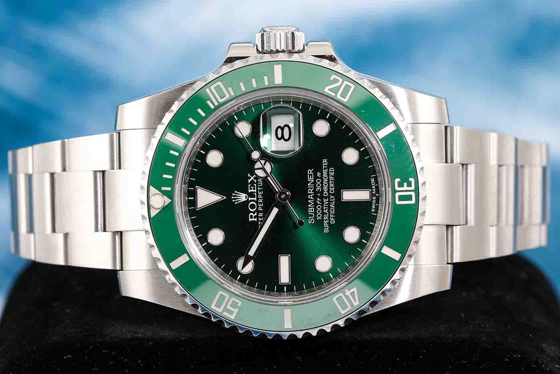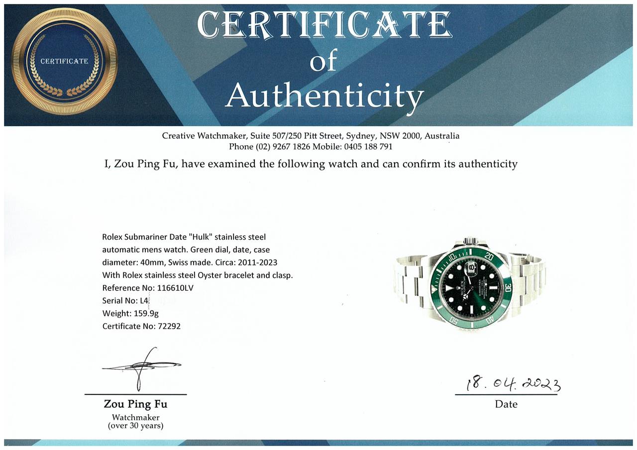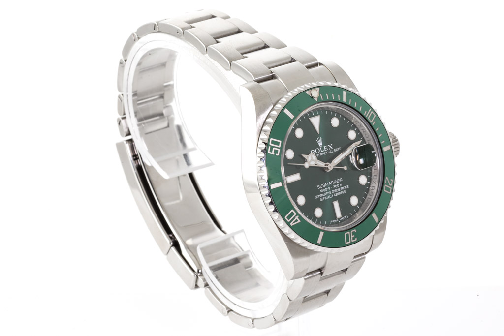 Rolex Submariner Date Hulk stainless steel automatic mens watch. Green dial, date, case diameter: 40mm, wrist size: 21.5cm, Swiss made. Ref# 116610LV. Circa: 2011-2023. With Rolex stainless steel Oyster bracelet and clasp. With Certificate of Authenticity and Rolex box. 3 month FSA warranty. (Pre-owned)