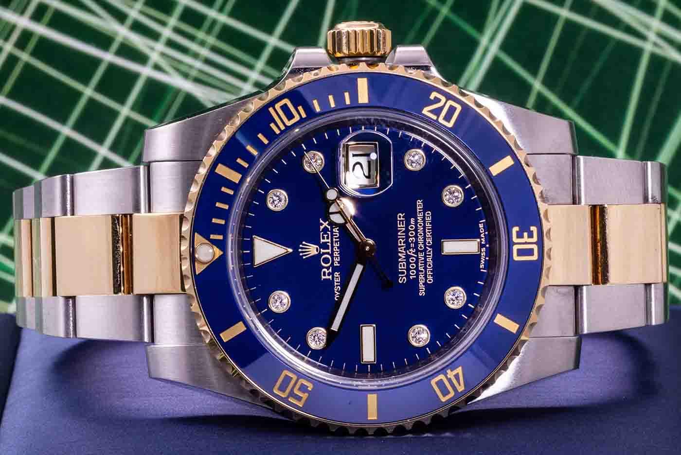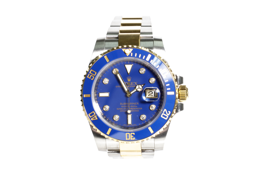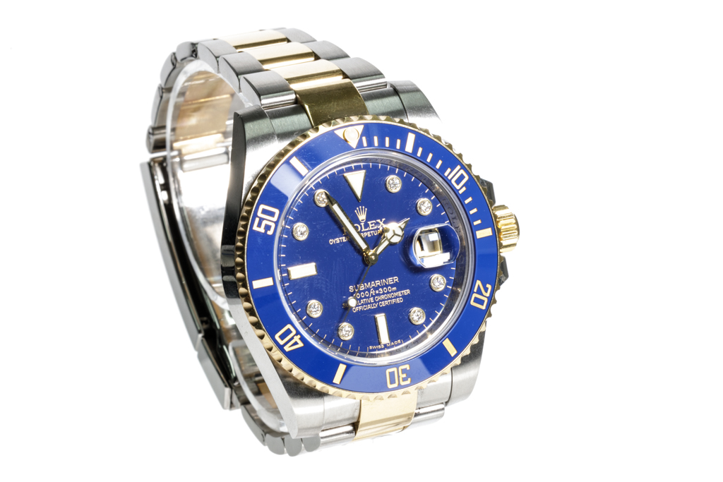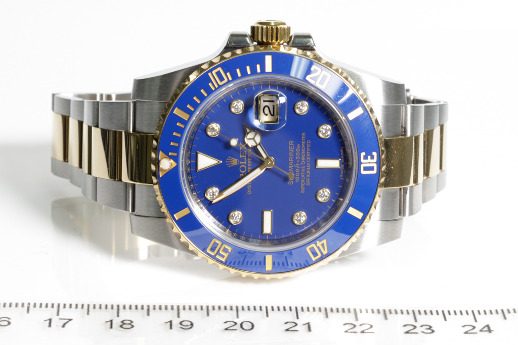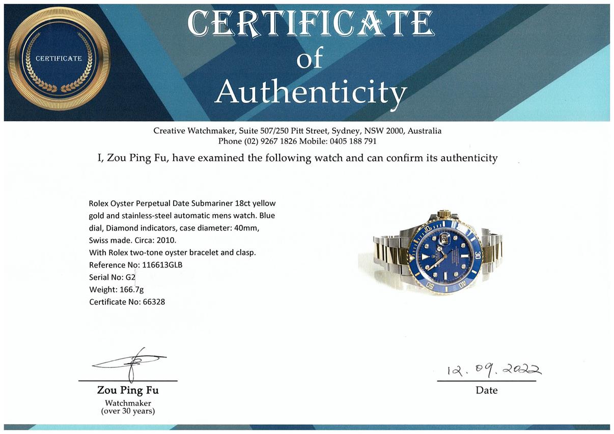 Rolex Oyster Perpetual Date Submariner 18ct yellow gold and stainless steel automatic mens watch. Blue dial, Diamond indicators, case diameter: 40mm, wrist size: 18cm, Swiss made. Ref# 116613GLB. Circa: 2010. With Rolex two-tone oyster bracelet and clasp. With Certificate of Authenticity and Rolex box. 3 month FSA warranty. (Pre-owned)