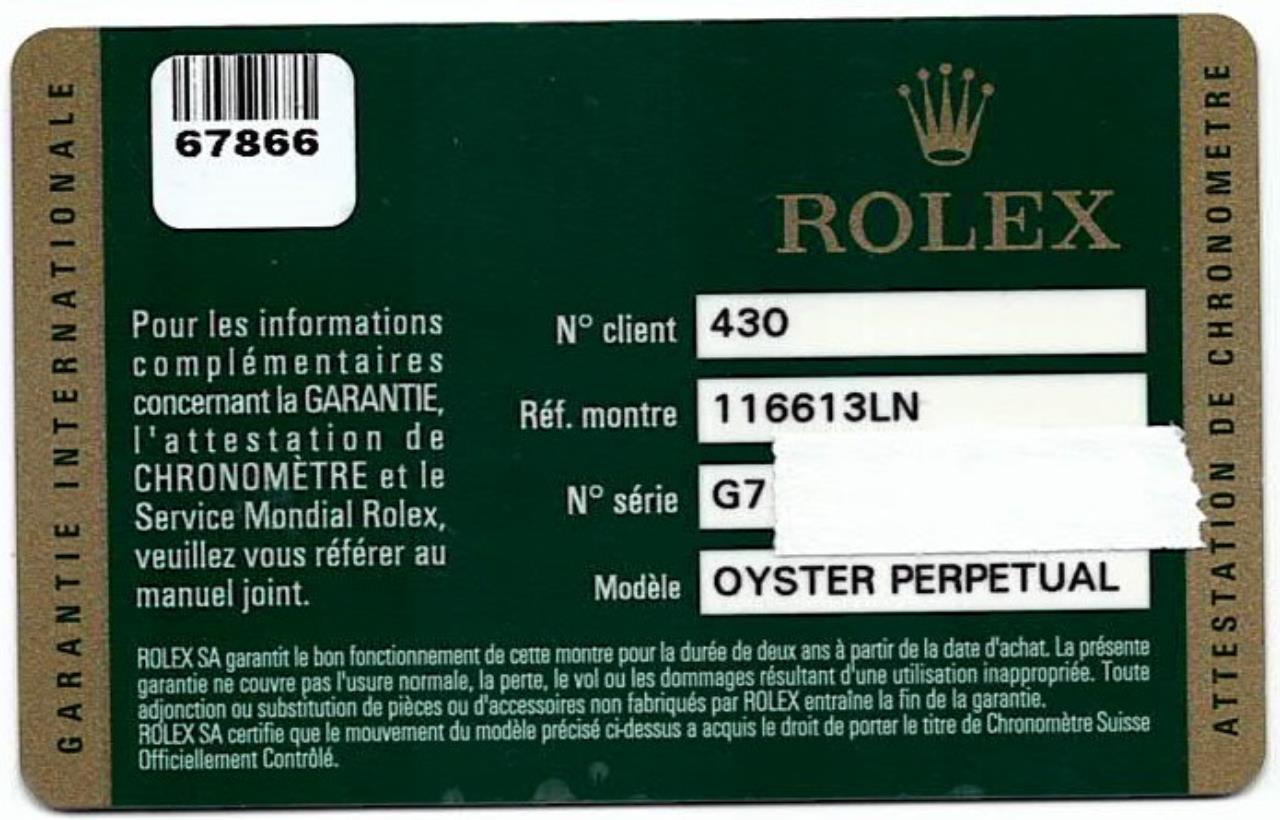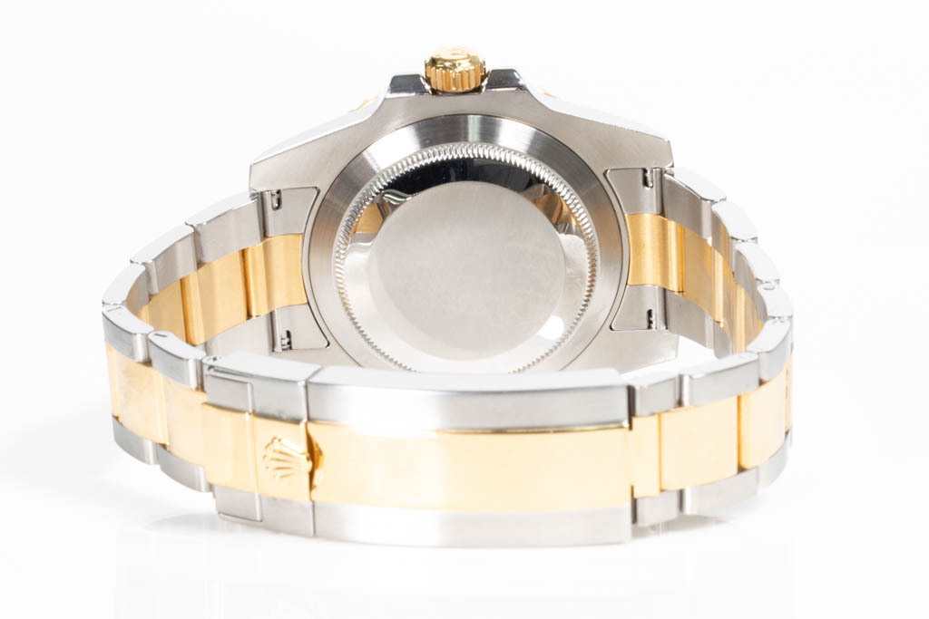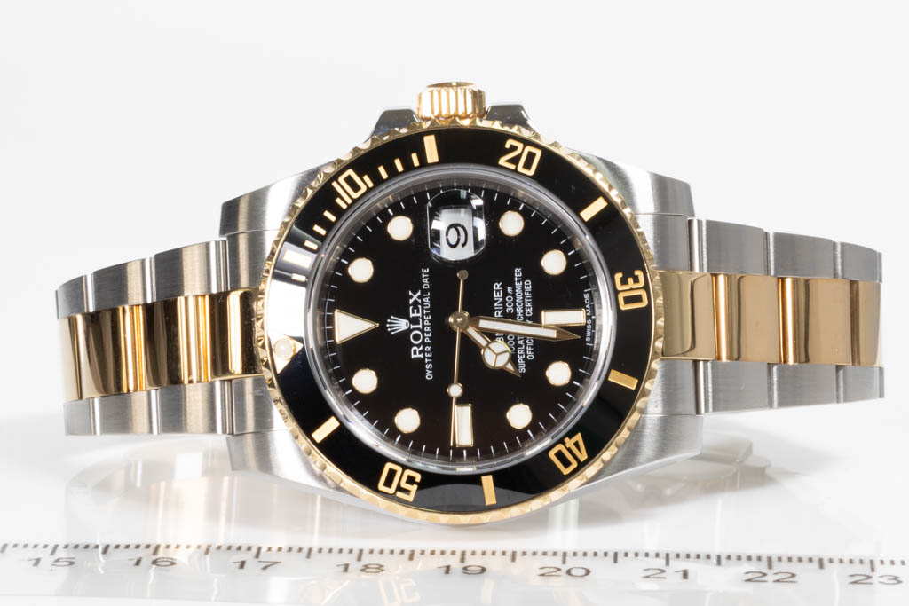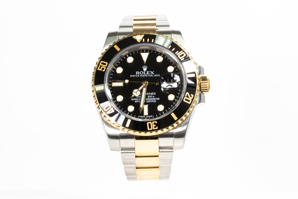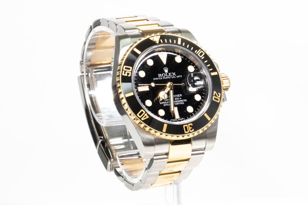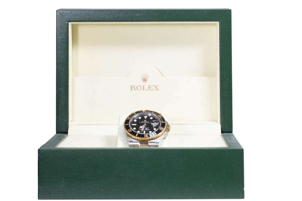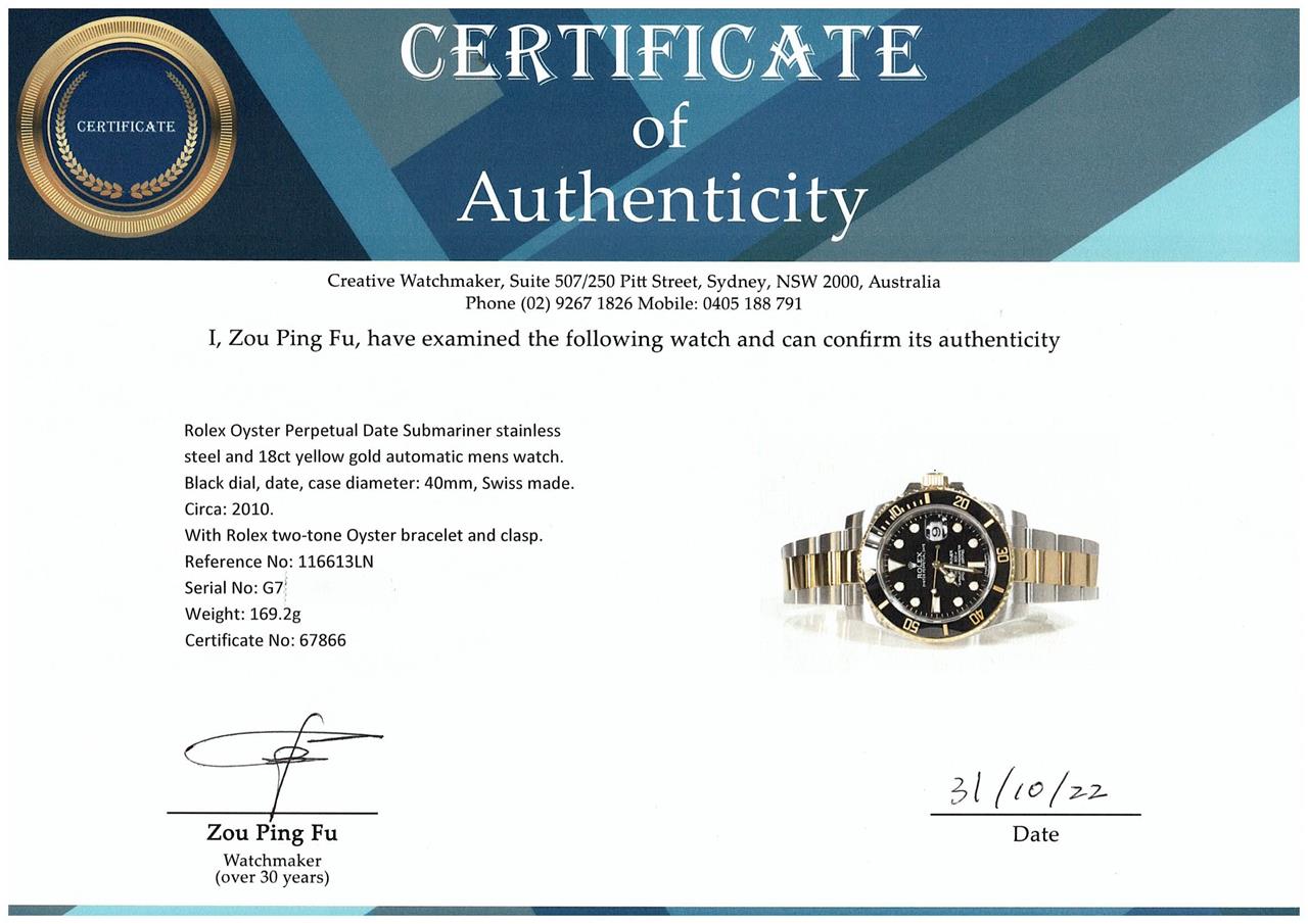 Rolex Oyster Perpetual Date Submariner stainless steel and 18ct yellow gold automatic mens watch. Black dial, date, case diameter: 40mm, wrist size: 18m, Swiss made. Ref# 116613LN, Circa: 2010. With Rolex two-tone Oyster bracelet and clasp. With Certificate of Authenticity, Rolex International Warranty card dated 10/2012 and Rolex box. 3 month FSA warranty. (Pre-owned)