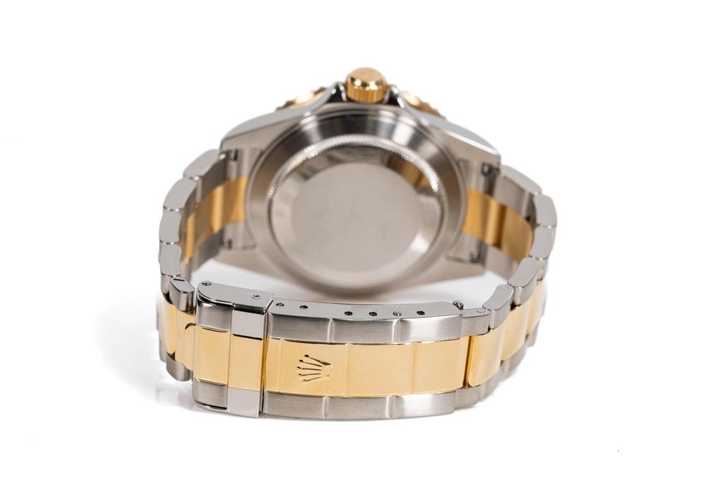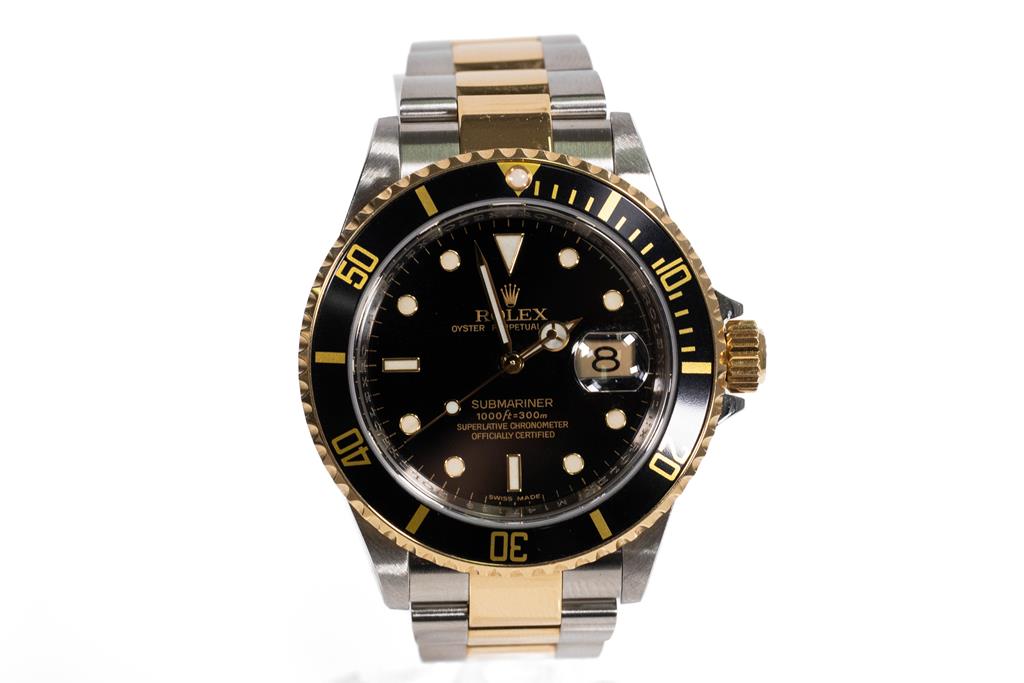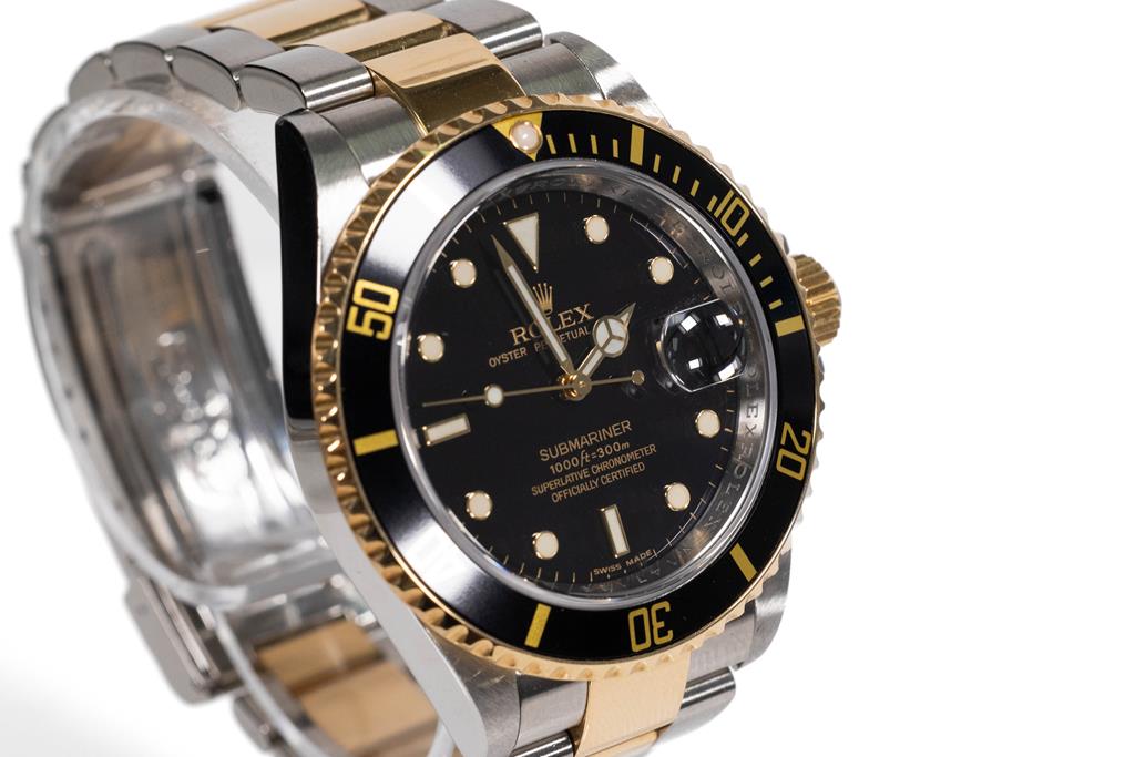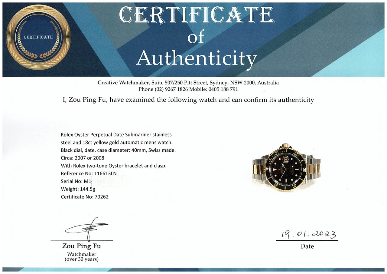 Rolex Oyster Perpetual Date Submariner stainless steel and 18ct yellow gold automatic mens watch. Black dial, date, case diameter: 40mm, wrist size: 17cm, Swiss made. Ref# 116613LN, Circa: 2007 or 2008. With Rolex two-tone Oyster bracelet and clasp. With Certificate of Authenticity, Rolex International Guarantee card dated 14/09/2008 and Rolex box. 3 month FSA warranty. (Pre-owned)