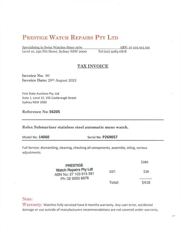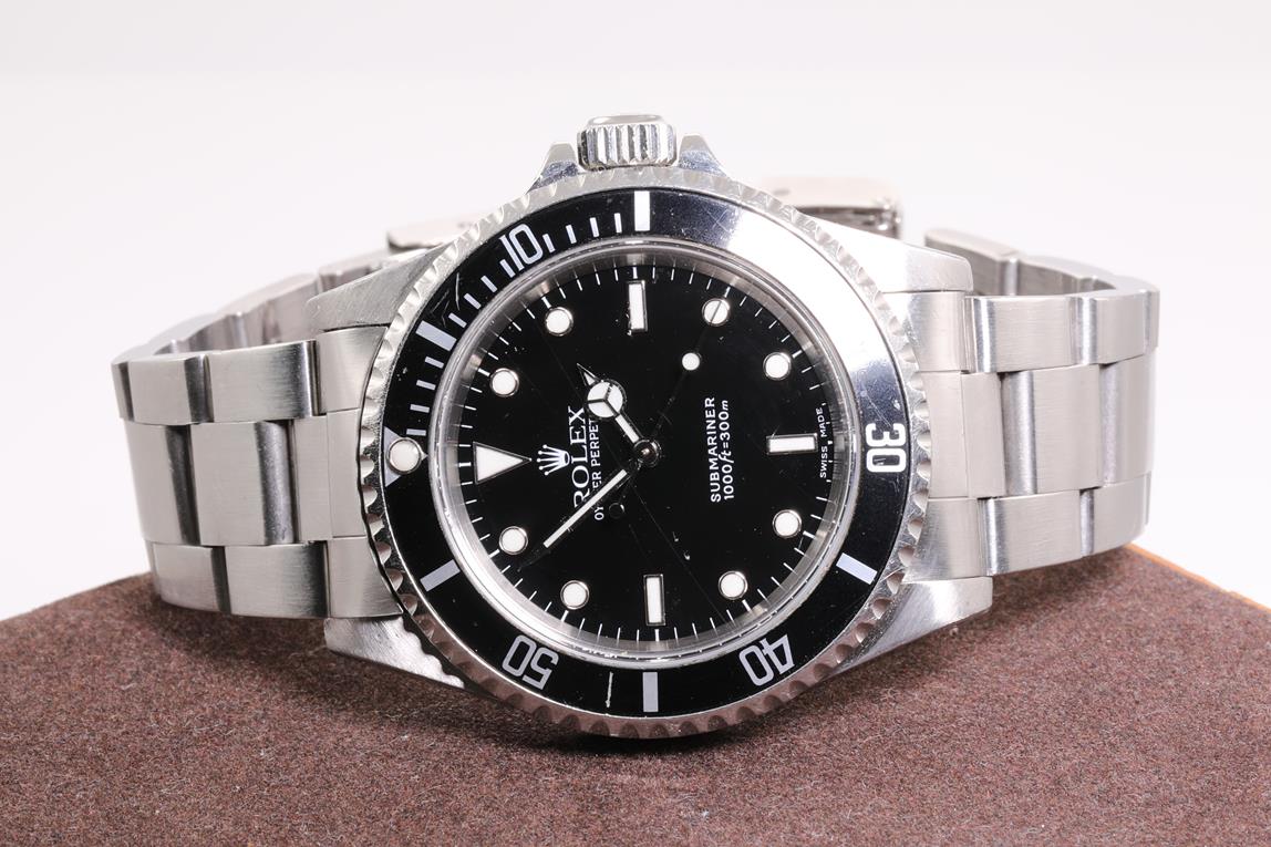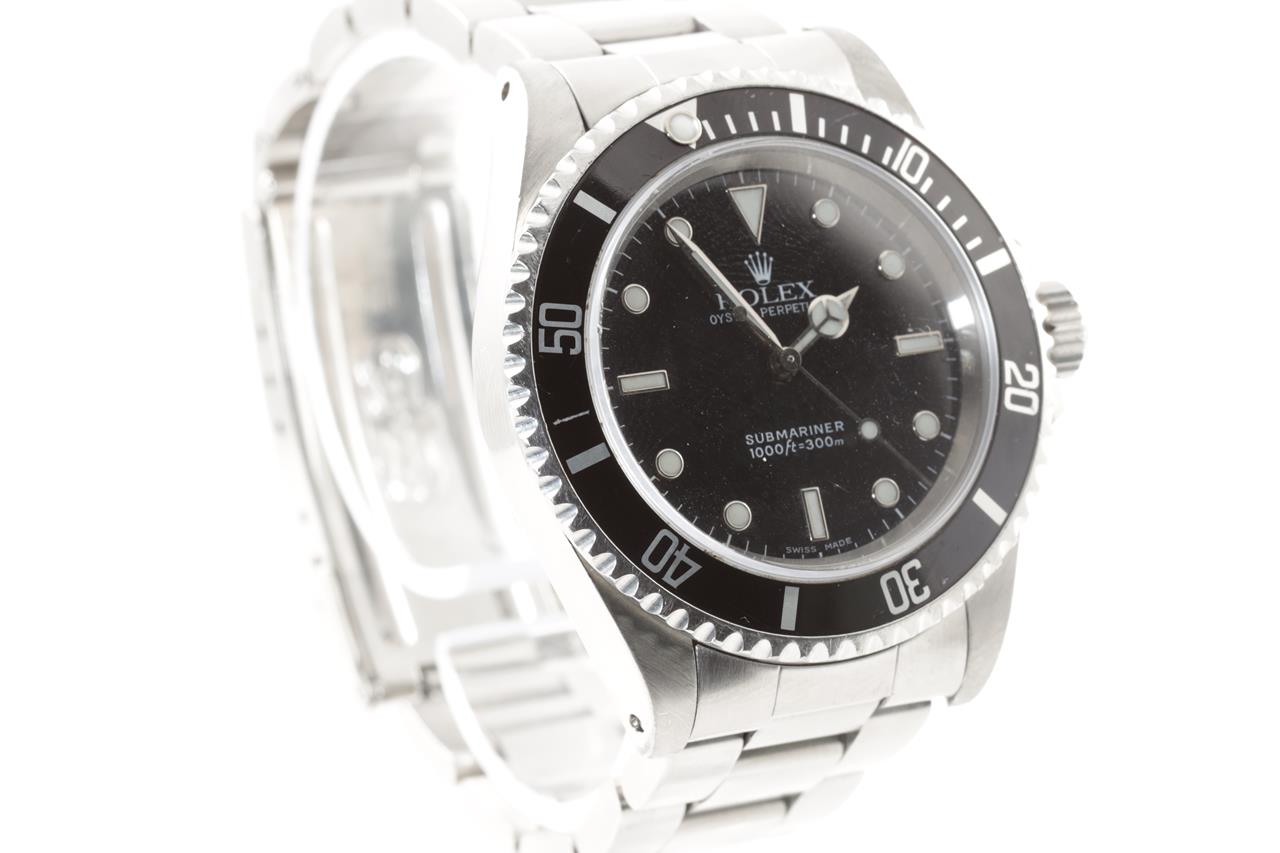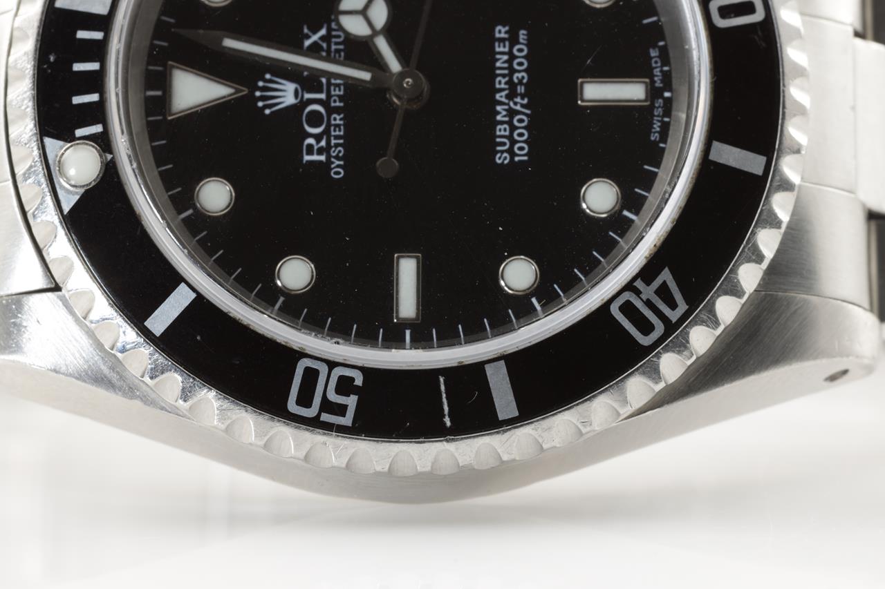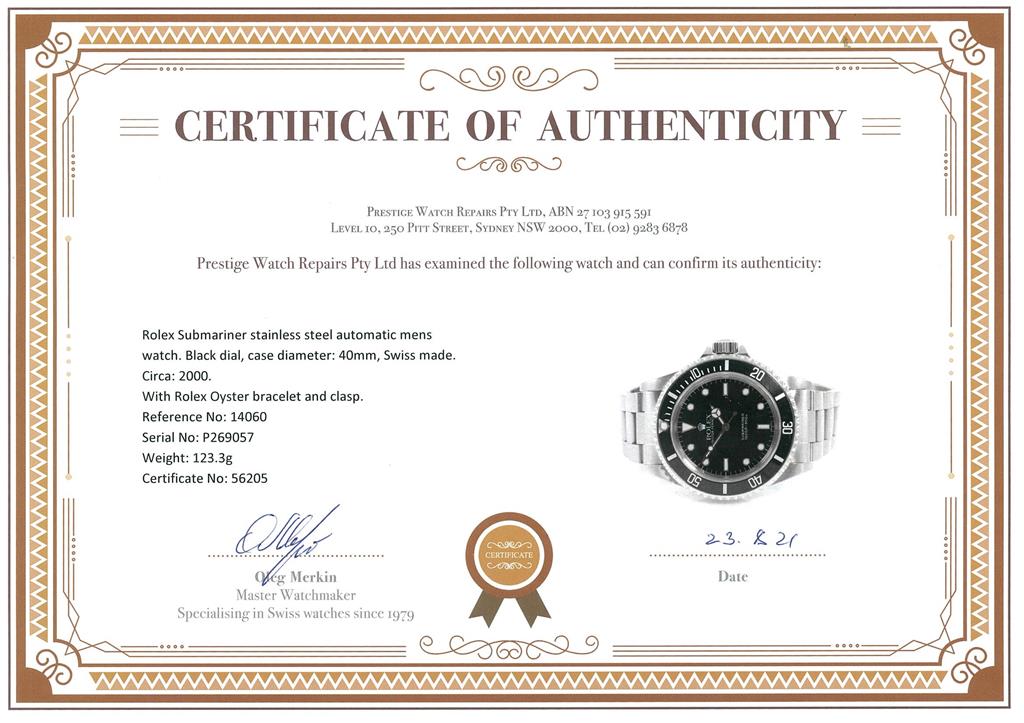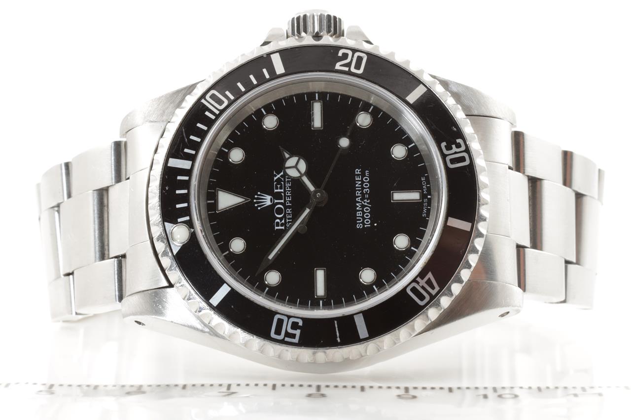 Rolex Submariner stainless steel automatic mens watch. Black dial, case diameter: 40mm, wrist size: 17cm, Swiss made. Ref# 14060, Circa: 2000. With Rolex Oyster bracelet and clasp. With certificate of authenticity and Rolex box. 6 month watchmaker warranty from the date of full service. (Pre-owned)