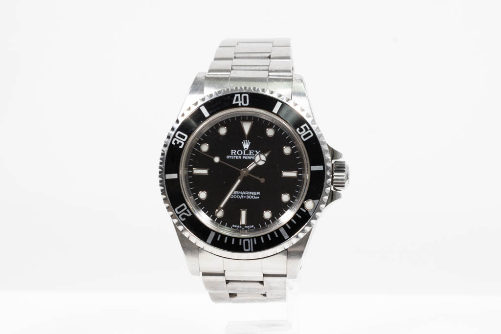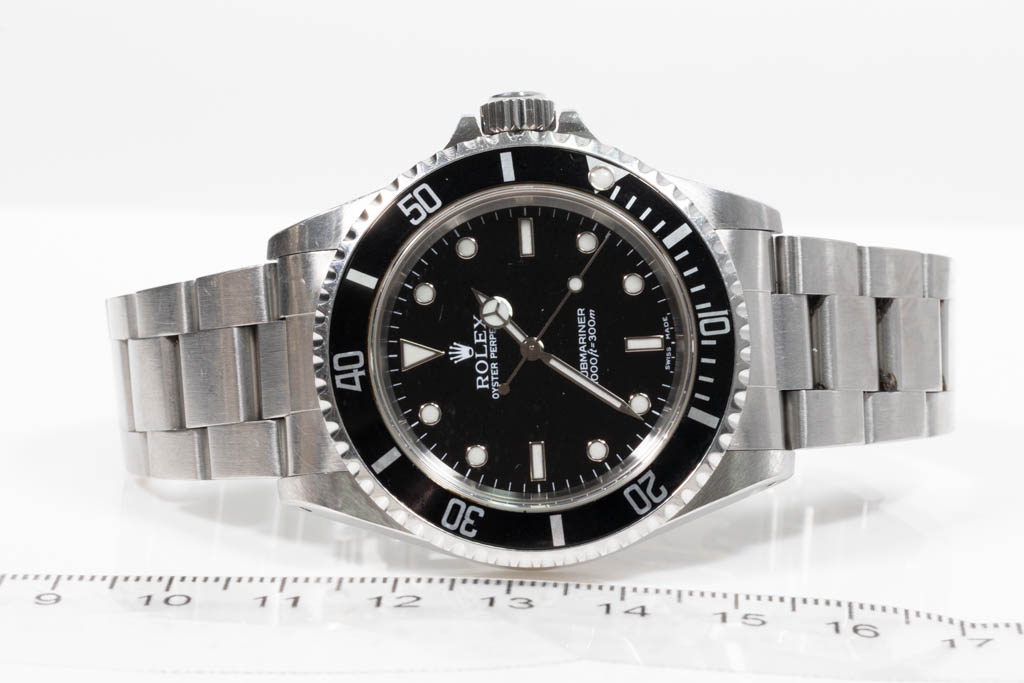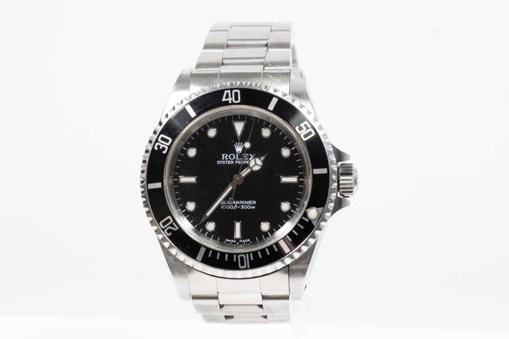 Rolex Oyster Perpetual Submariner stainless steel automatic mens watch. Black dial, case diameter: 40mm, wrist size: 18.5cm, Swiss made. Ref# 14060, Circa: 2000. With Rolex stainless steel Oyster bracelet and clasp. With Certificate of Authenticity. 3 month FSA warranty. (Pre-owned)
