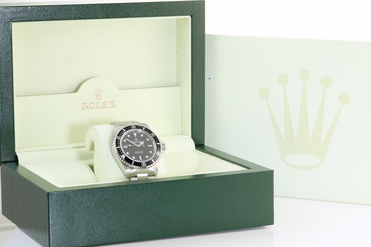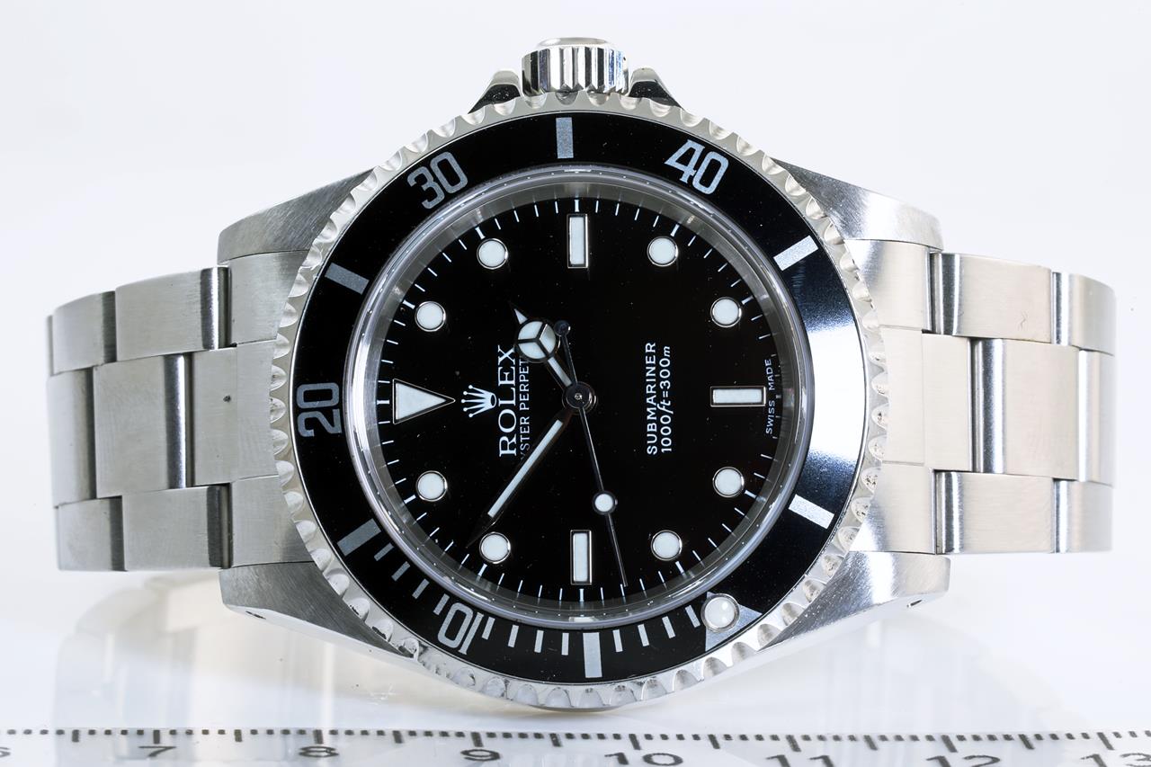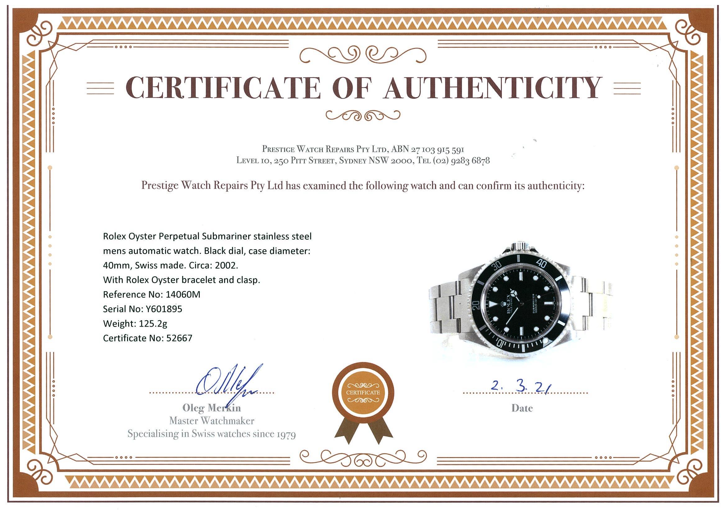 Rolex Oyster Perpetual Submariner stainless steel mens automatic watch. Black dial, case diameter: 40mm, wrist size: 16.5cm, Swiss made. Ref# 14060M, Circa: 2002. With Rolex Oyster bracelet and clasp. With certificate of authenticity, Rolex box & 3 month FSA warranty. (Pre-owned)