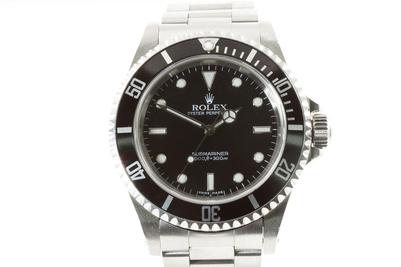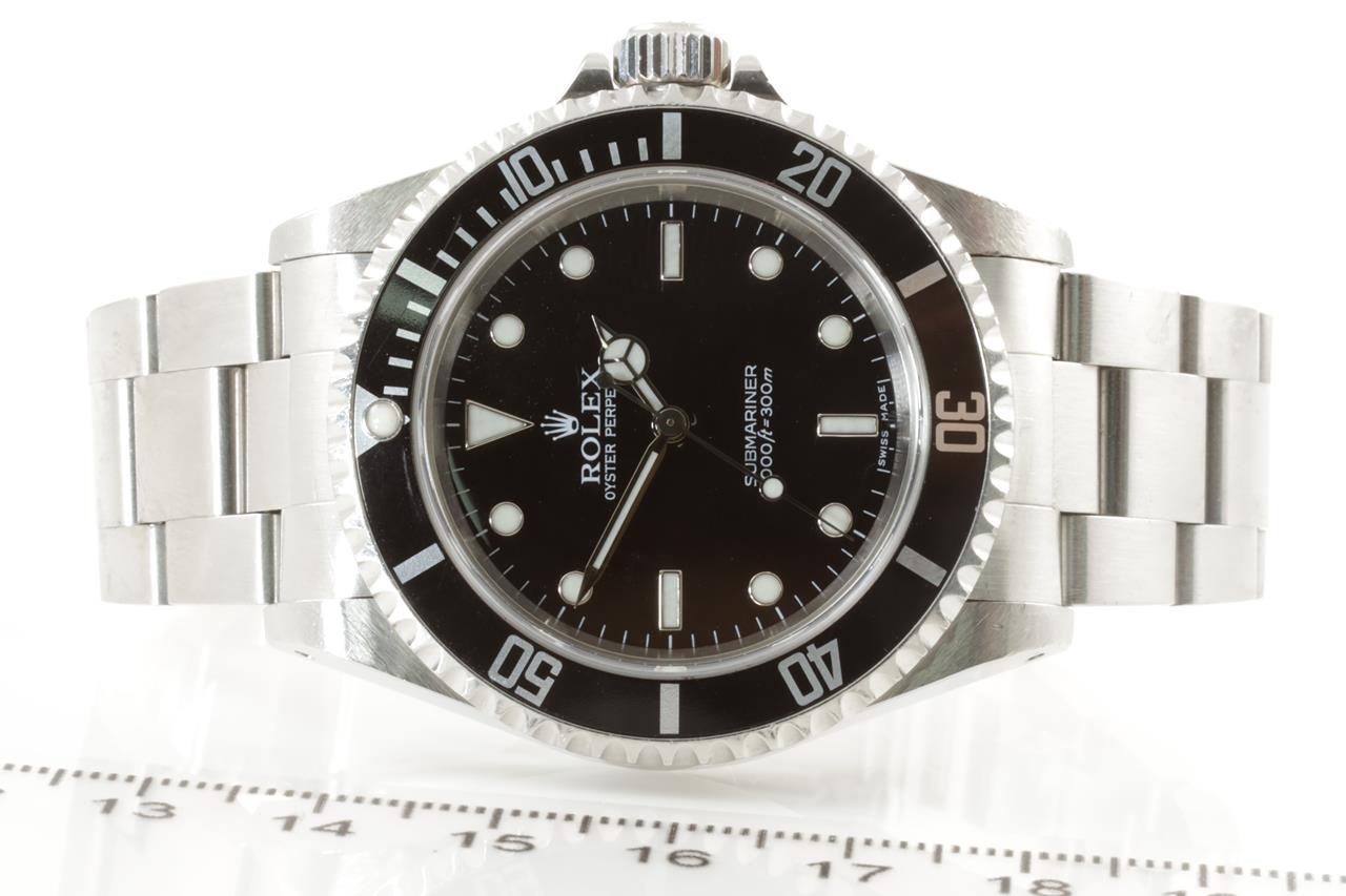Rolex Oyster Perpetual Submariner stainless steel mens automatic watch. Black dial, case diameter: 40mm, wrist size: 18cm, Swiss made. Ref #14060M, Circa: 2005 or 2006. With Rolex Oyster stainless steel bracelet and clasp. With certificate of authenticity & Rolex box with Rolex gift bag. 3 month FSA warranty. (Pre-owned)