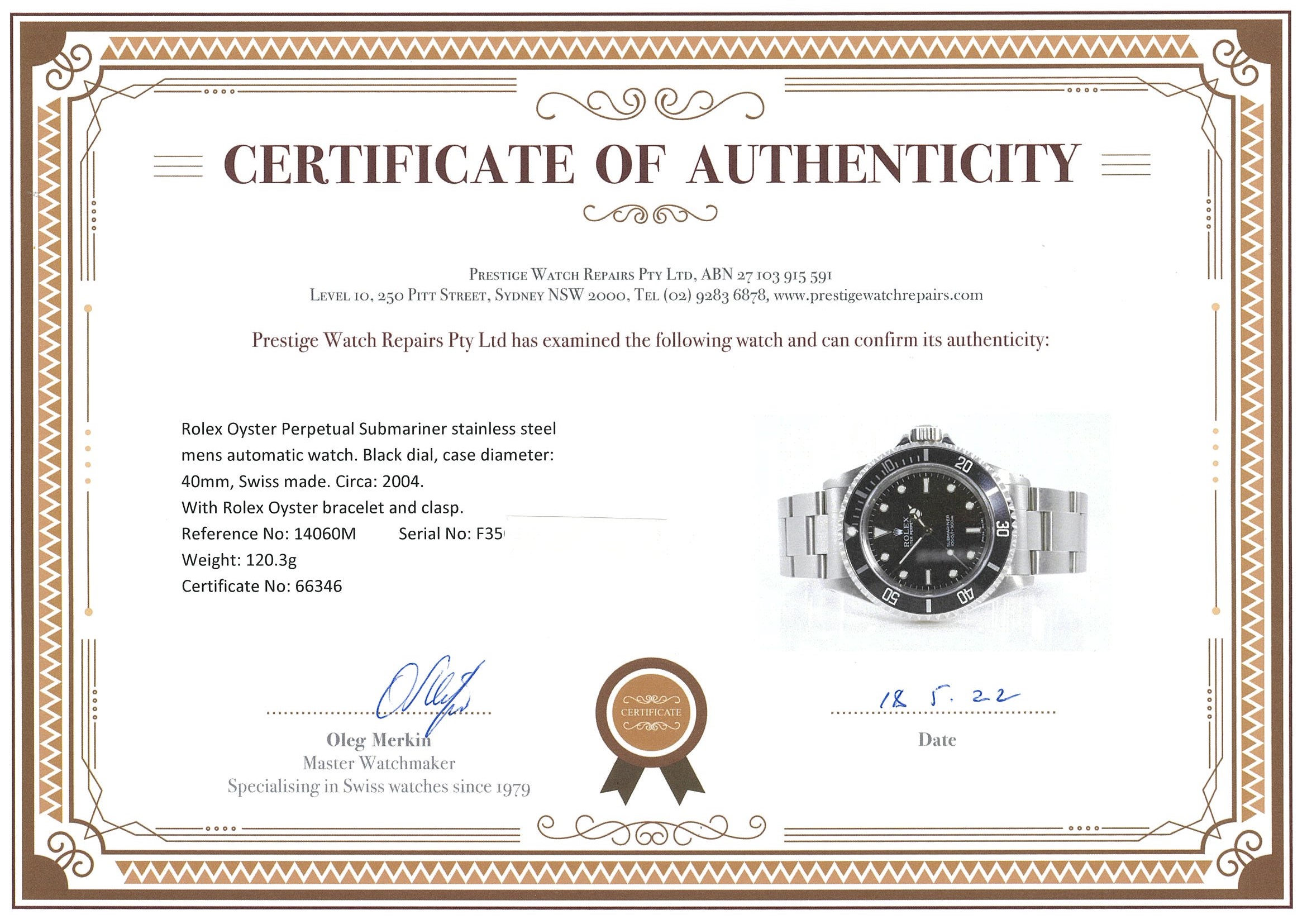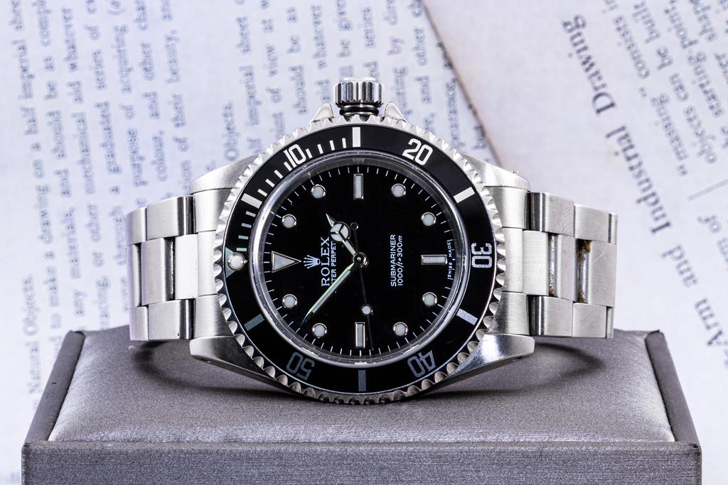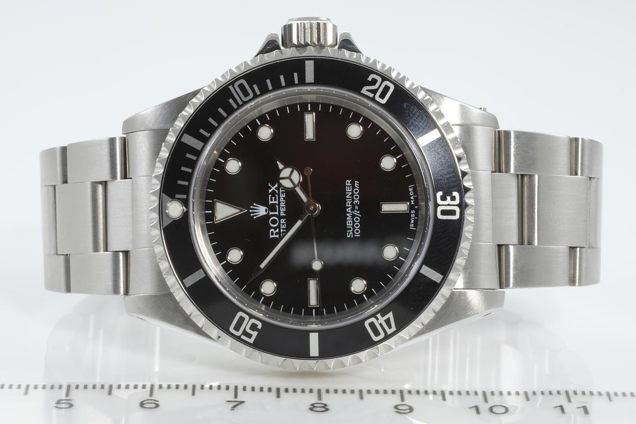 Rolex Oyster Perpetual Submariner stainless steel mens automatic watch. Black dial, case diameter: 40mm, wrist size: 16.5cm, Swiss made. Ref# 14060M, Circa: 2004. With Rolex Oyster bracelet and clasp. With certificate of authenticity & Rolex box. 3 month FSA warranty. (Pre-owned)