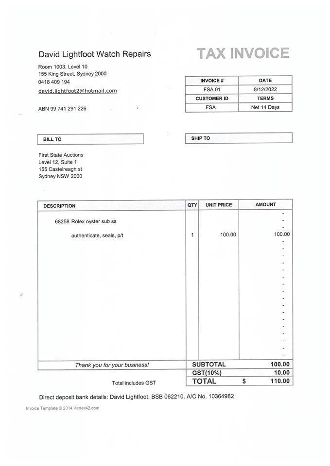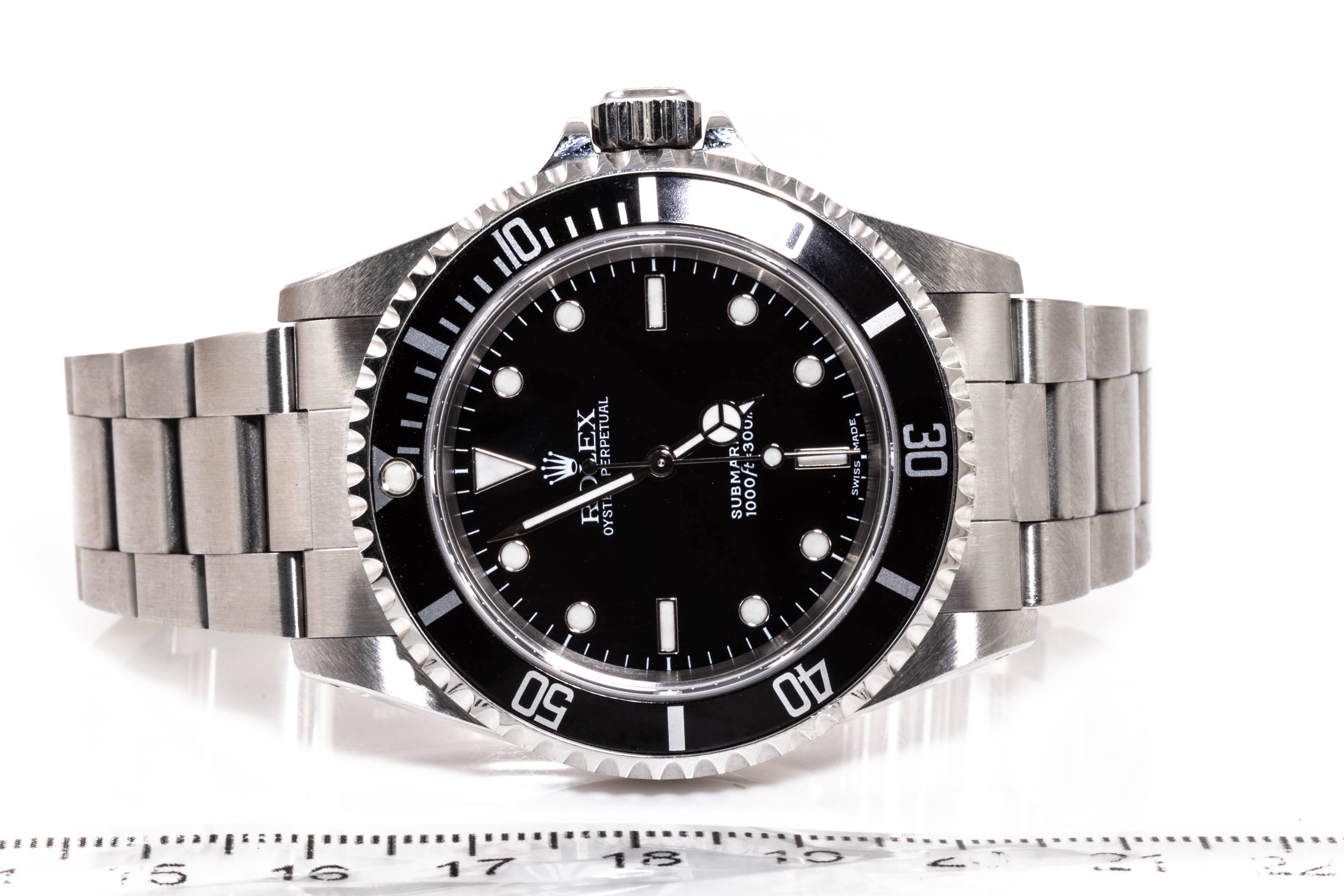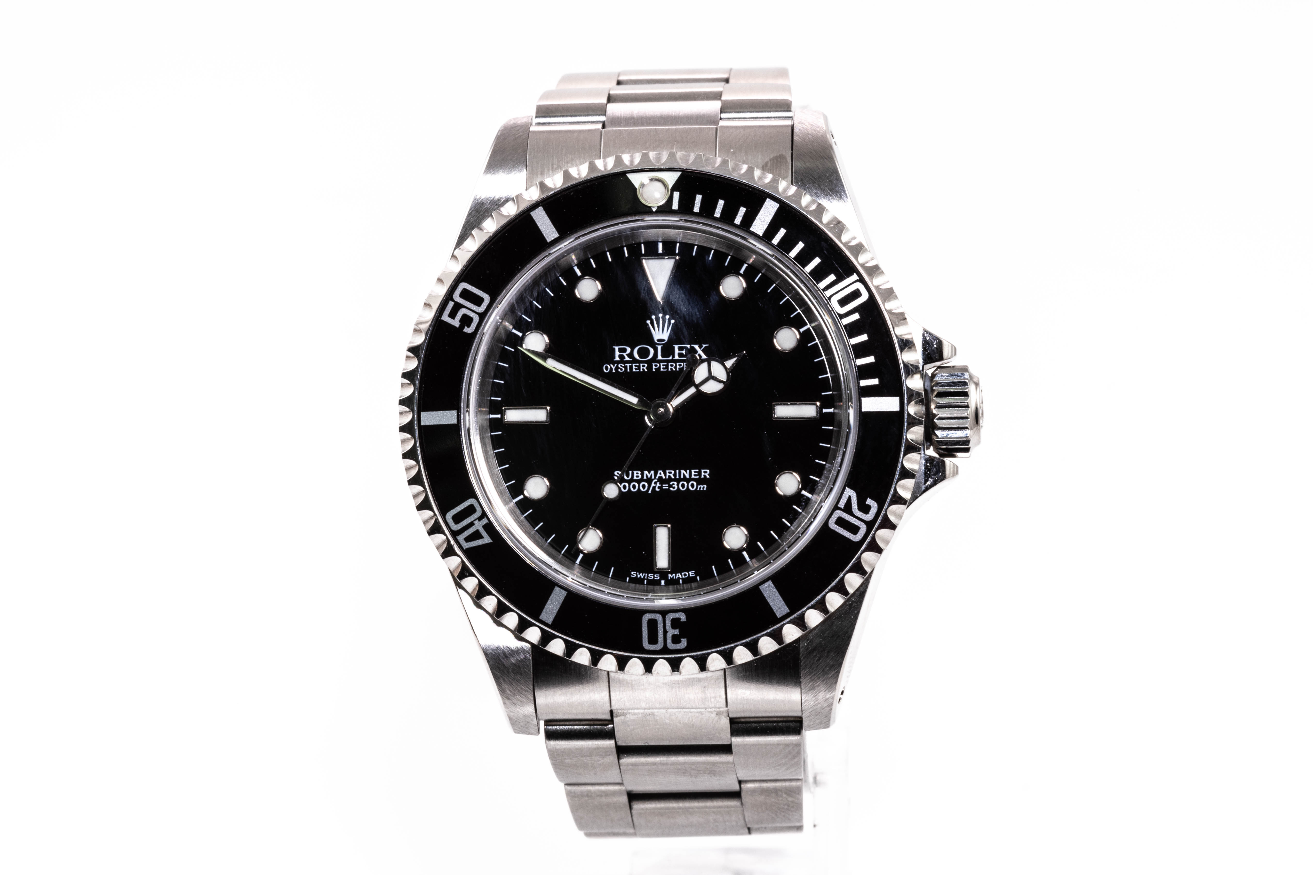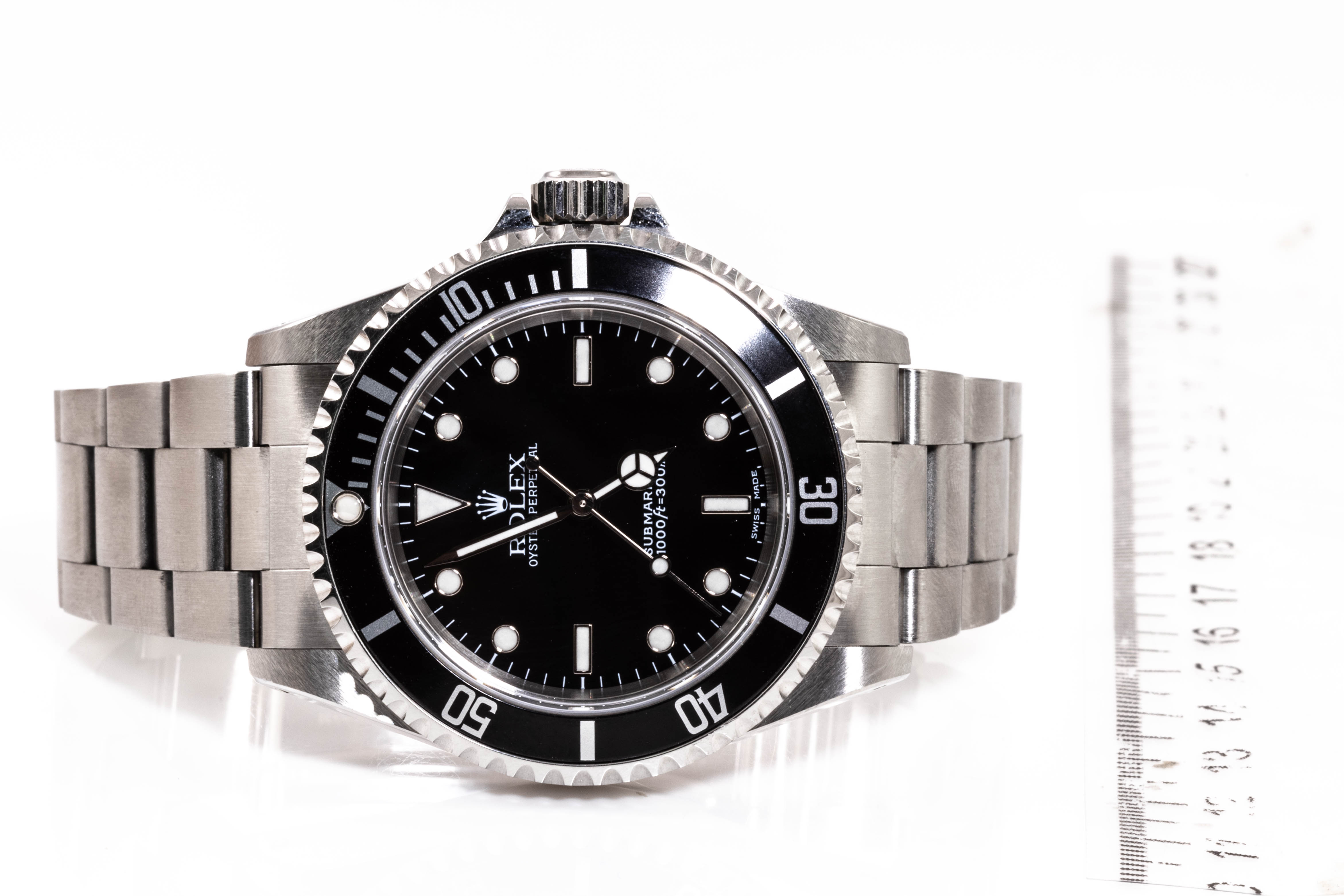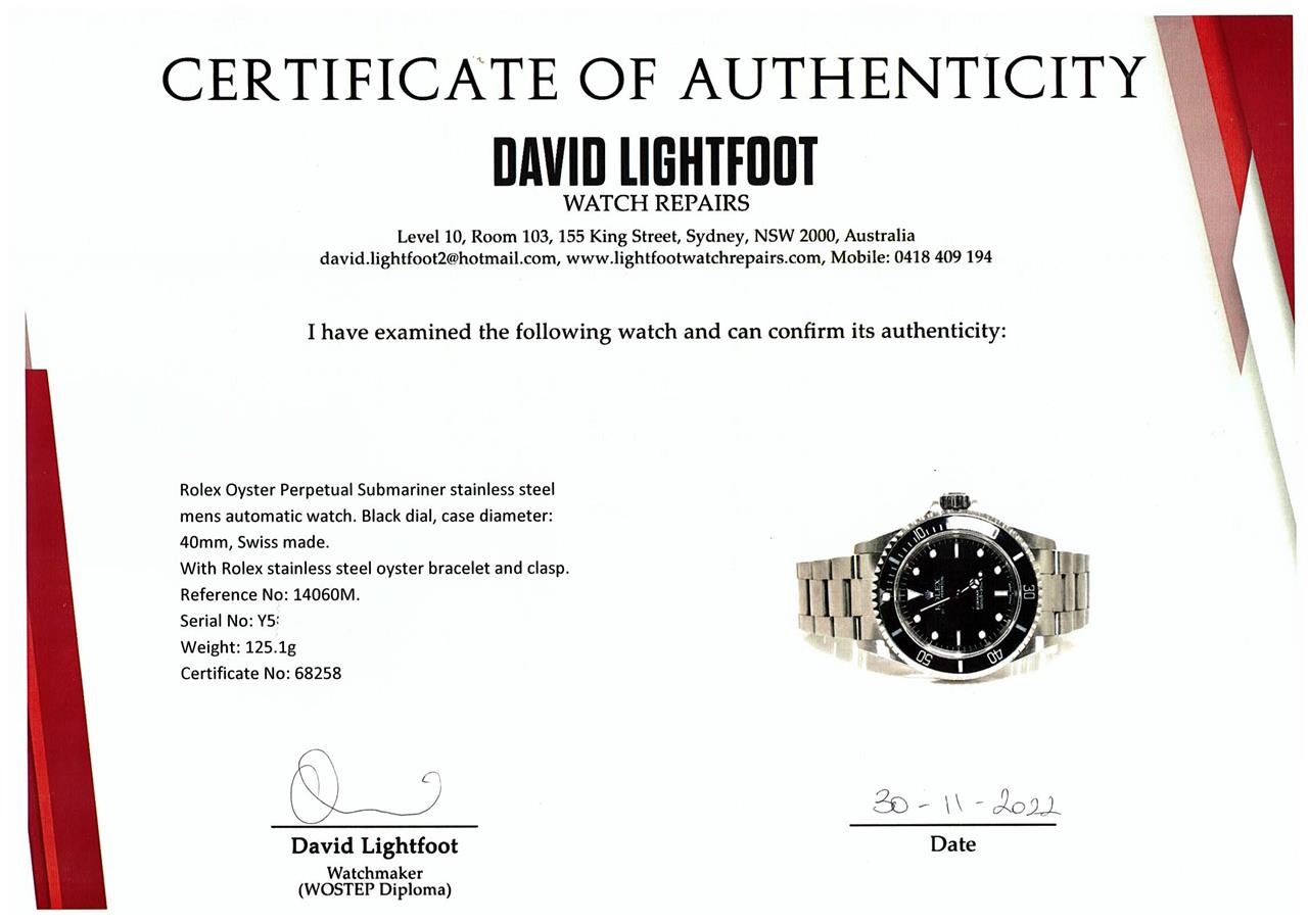 Rolex Oyster Perpetual Submariner stainless steel mens automatic watch. Black dial, case diameter: 40mm, wrist size: 17.cm, Swiss made. Ref# 14060M, Circa: 2002. With Rolex stainless steel oyster bracelet and clasp. With Certificate of Authenticity, Tax invoice for new seals dated 8/12/22 & Rolex box. 3 month FSA warranty. (Pre-owned)