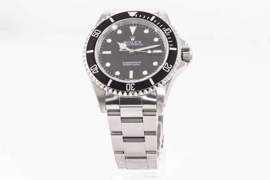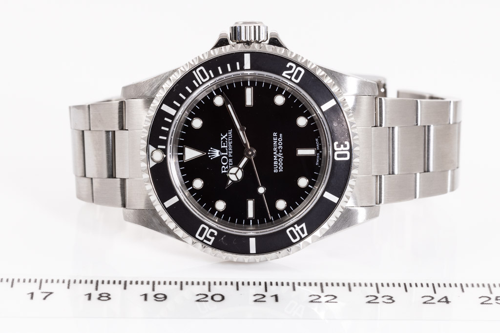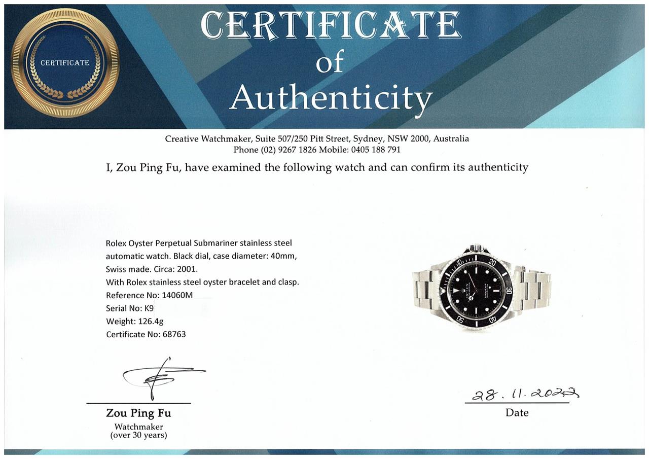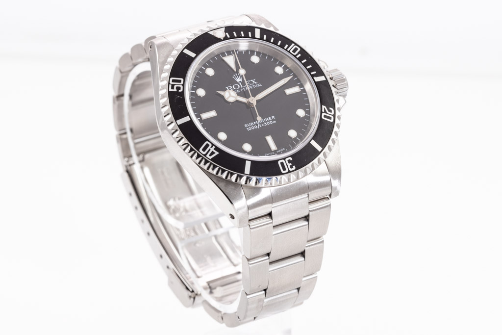 Rolex Oyster Perpetual Submariner stainless steel automatic watch. Black dial, case diameter: 40mm, wrist size: 17.5cm, Swiss made. Ref# 14060M, Circa: 2001. With Rolex stainless steel oyster bracelet and clasp. With Certificate of Authenticity and Rolex box. 3 month FSA warranty. (Pre-owned)