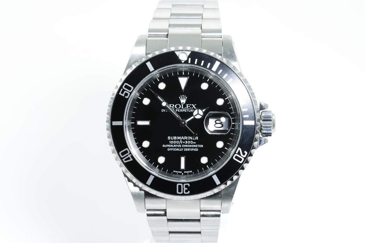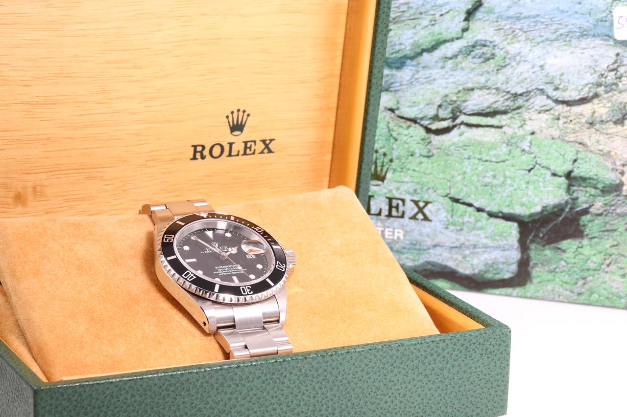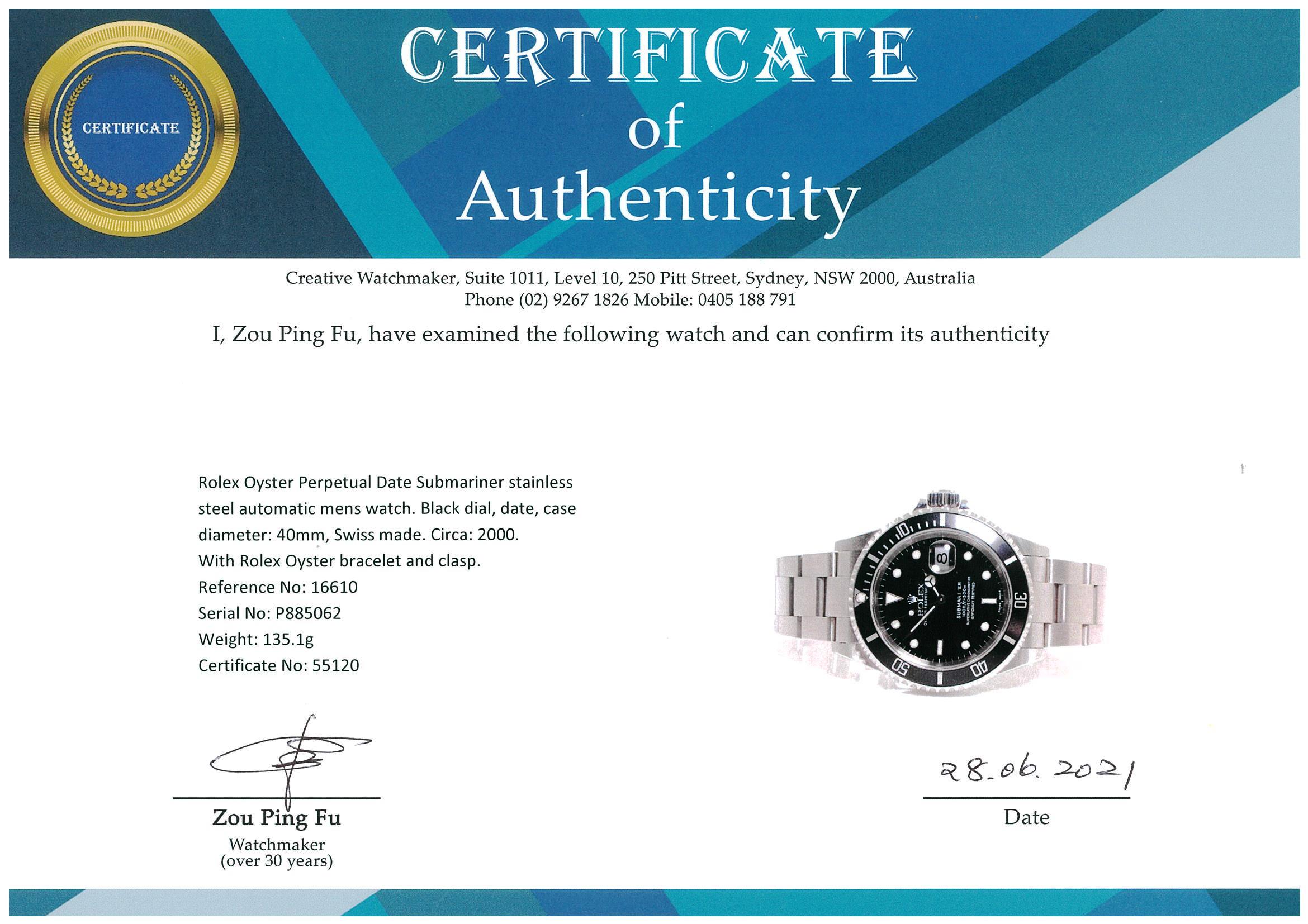 Rolex Oyster Perpetual Date Submariner stainless steel automatic mens watch. Black dial, date, case diameter: 40mm, wrist size: 18.5cm, Swiss made. Ref# 16610, Circa: 2000. With Rolex Oyster bracelet and clasp. With certificate of authenticity and Rolex box. 3 month FSA warranty. (Pre-owned)