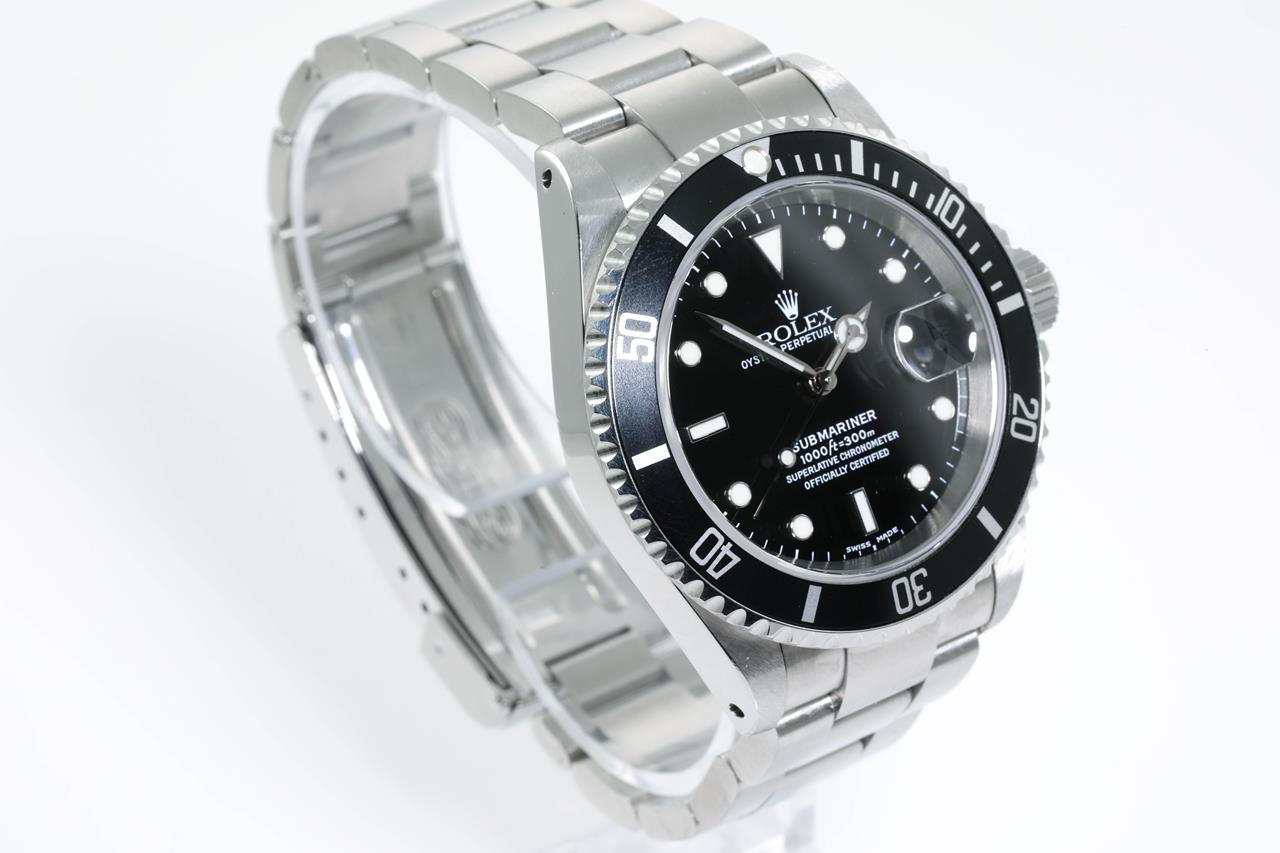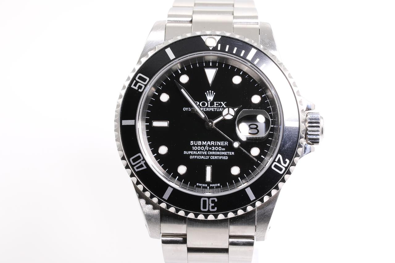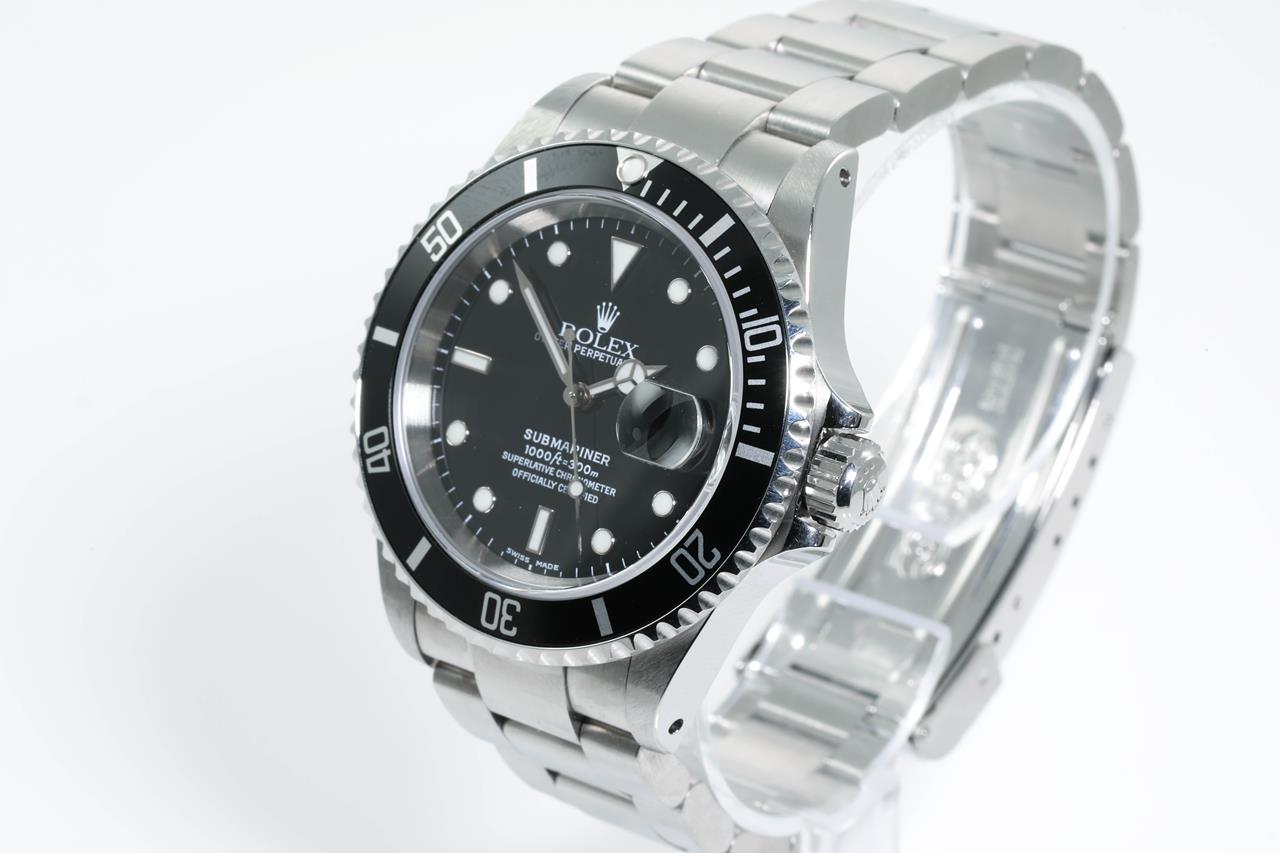 Rolex Oyster Perpetual Date Submariner stainless steel automatic mens watch. Black dial, date, case diameter: 40mm, wrist size: 18.5cm, Swiss made. Ref# 16610, Circa: 2000. With Rolex Oyster bracelet and clasp. With certificate of authenticity and Rolex box. 3 month FSA warranty. (Pre-owned)