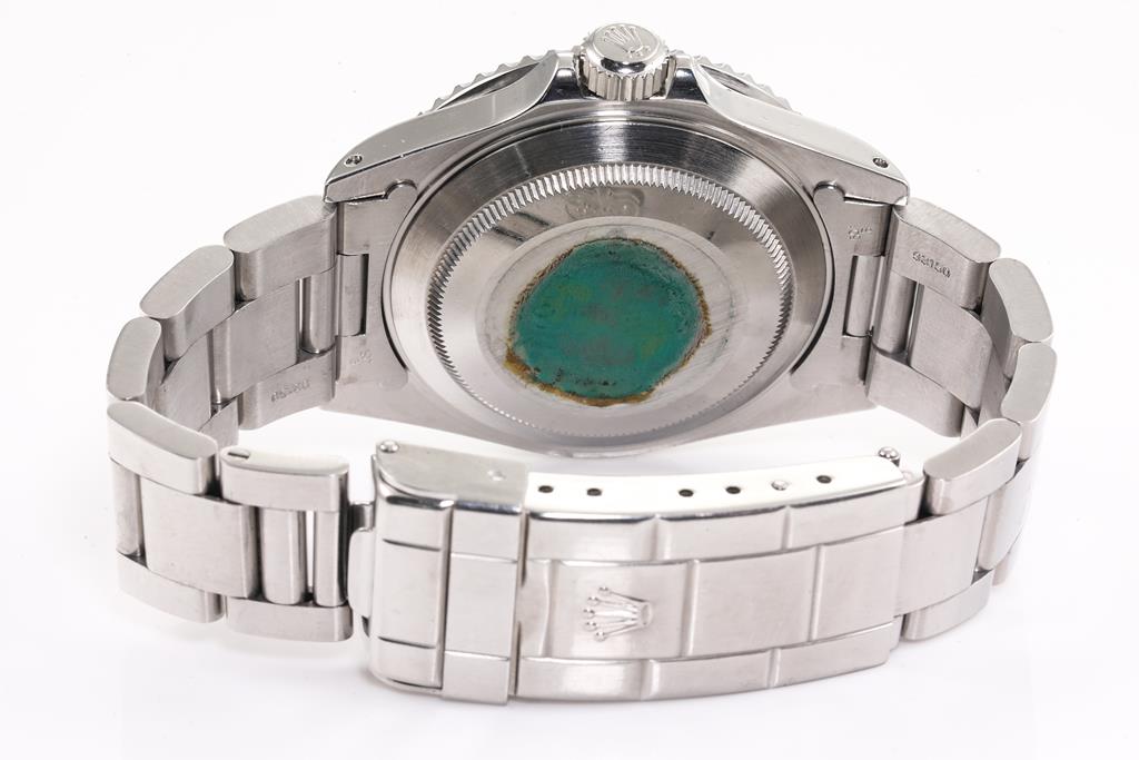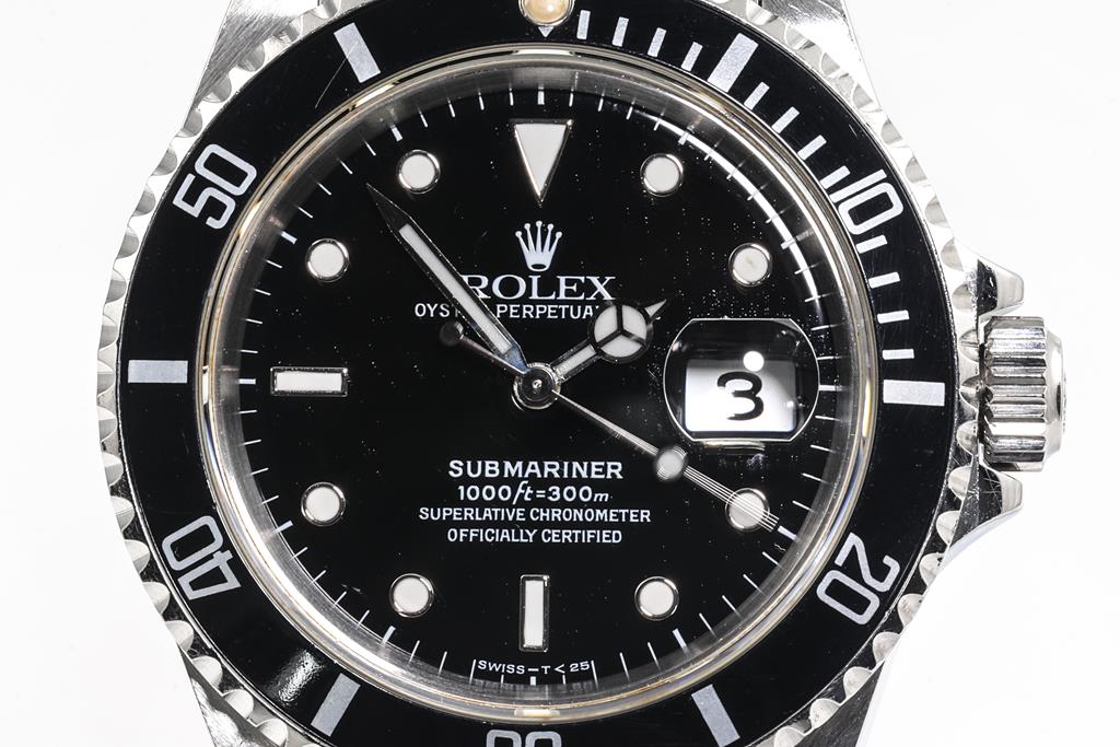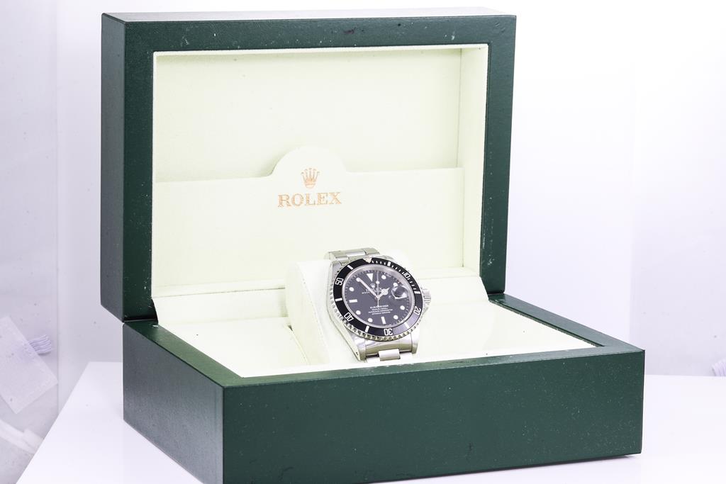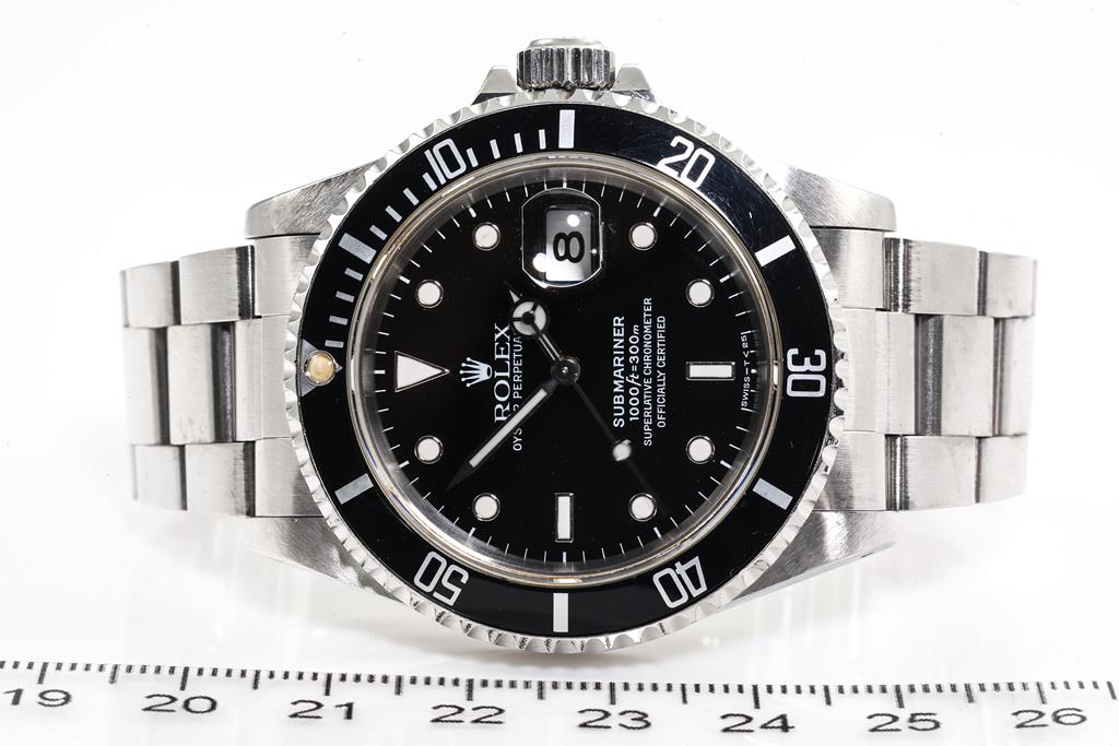 Rolex Oyster Perpetual Date Submariner stainless steel automatic mens watch. Black dial, date, case diameter: 40mm, wrist size: 16cm, Swiss made. Ref# 16610, Circa: 1991. With Rolex stainless steel Oyster bracelet and clasp. With Certificate of Authenticity and Rolex box. 3 month FSA warranty. (Pre-owned)