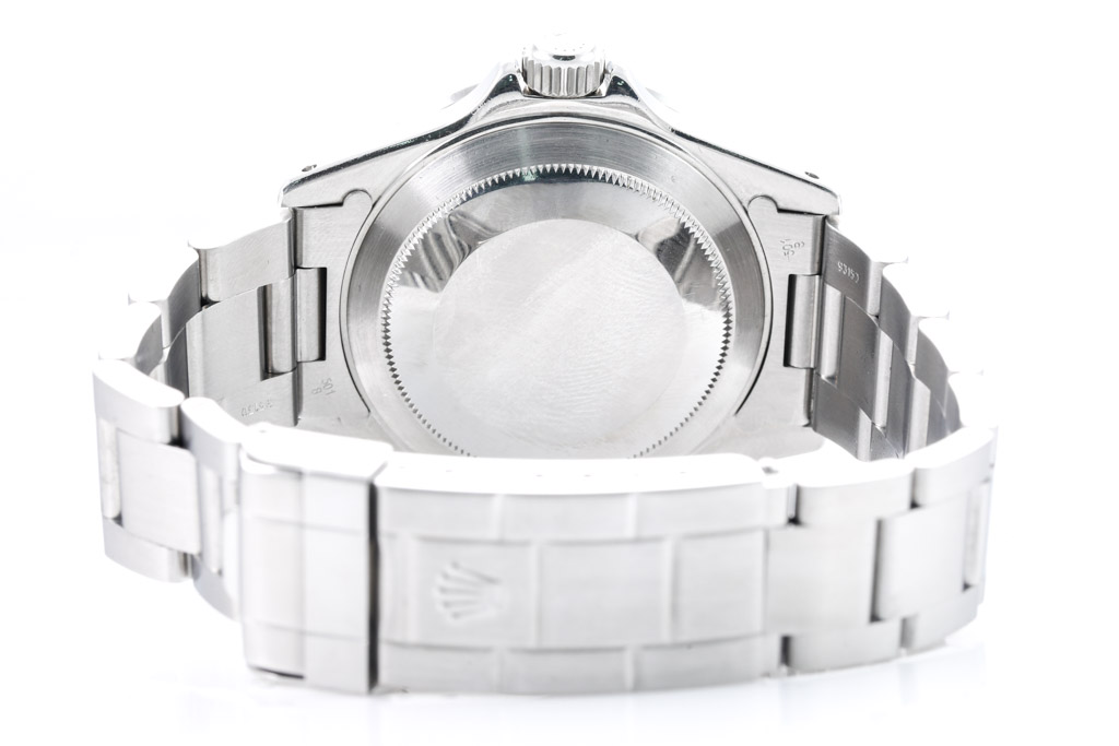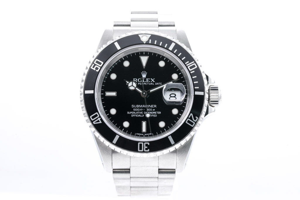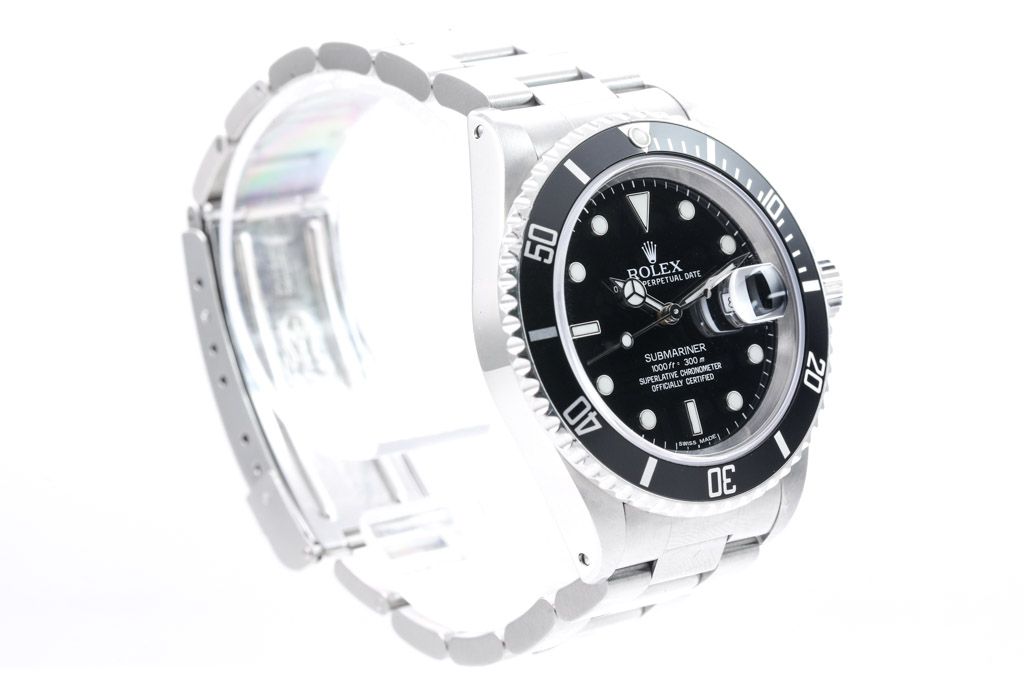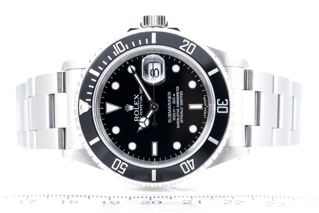 Rolex Oyster Perpetual Date Submariner stainless steel automatic mens watch. Black dial, date, case diameter: 40mm, wrist size: 17.5cm, Swiss made. Ref# 16610, Circa: 1995. With Rolex stainless steel oyster bracelet and clasp. With Certificate of Authenticity and Rolex box. 3 month FSA warranty. (Pre-owned)