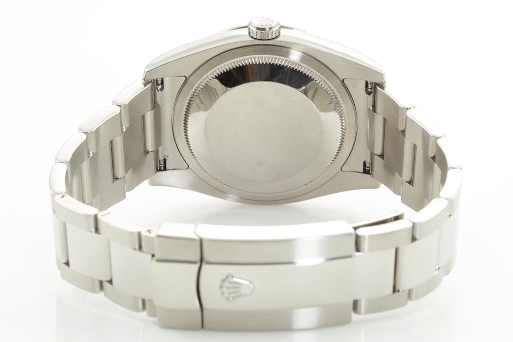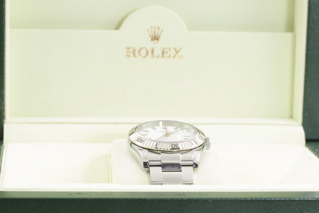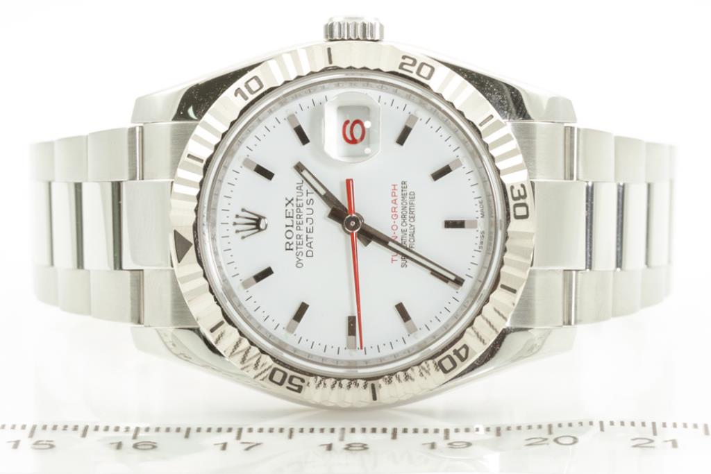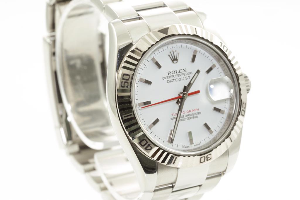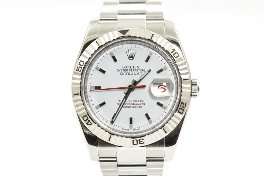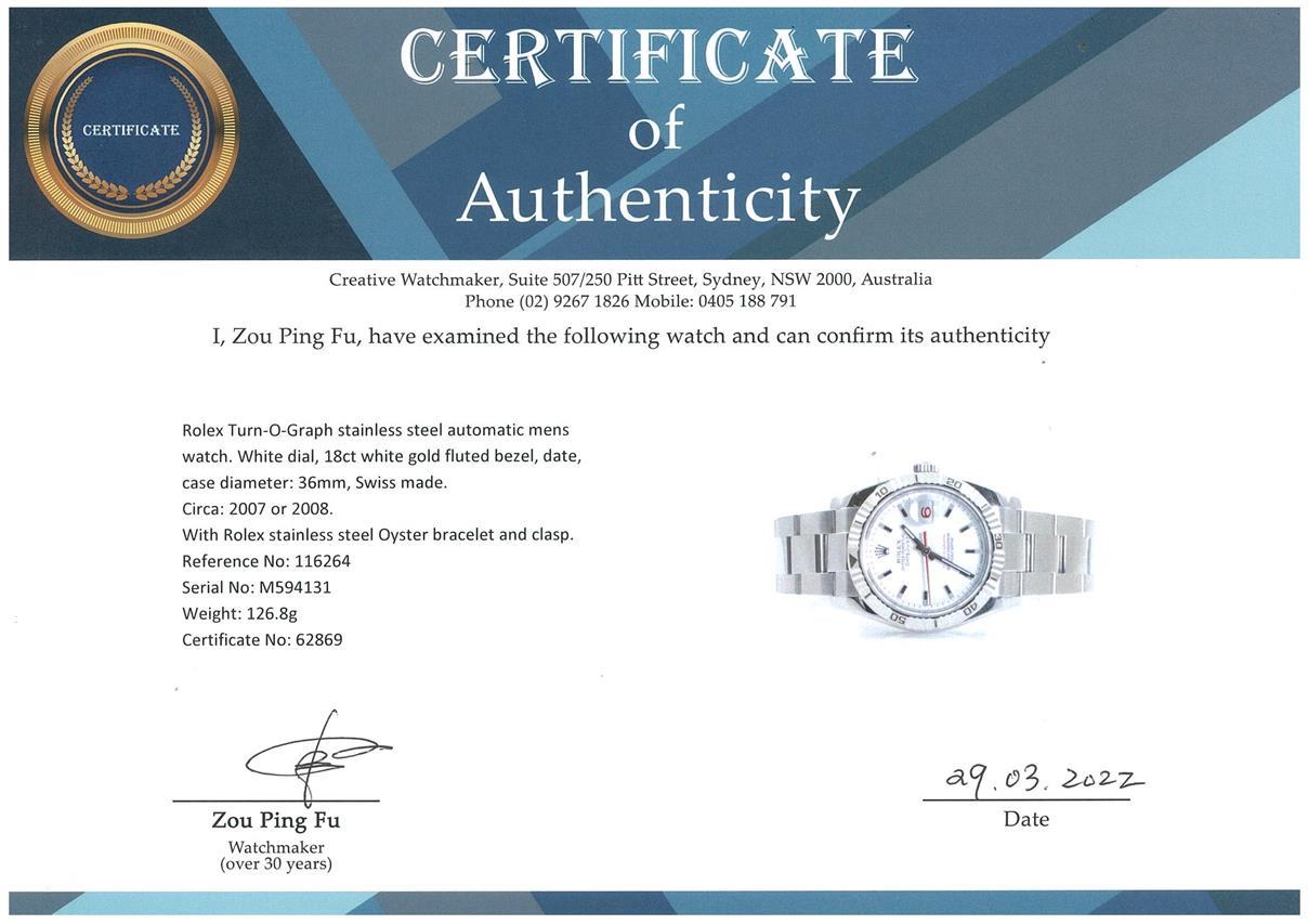 Rolex Turn-O-Graph stainless steel automatic mens watch. White dial, 18ct white gold fluted bezel, date, case diameter: 36mm, wrist size: 18cm, Swiss made. Ref# 116264, Circa: 2007 or 2008. With Rolex stainless steel Oyster bracelet and clasp. With Certificate of Authenticity and Rolex box. 3 month FSA warranty. (Pre-owned)