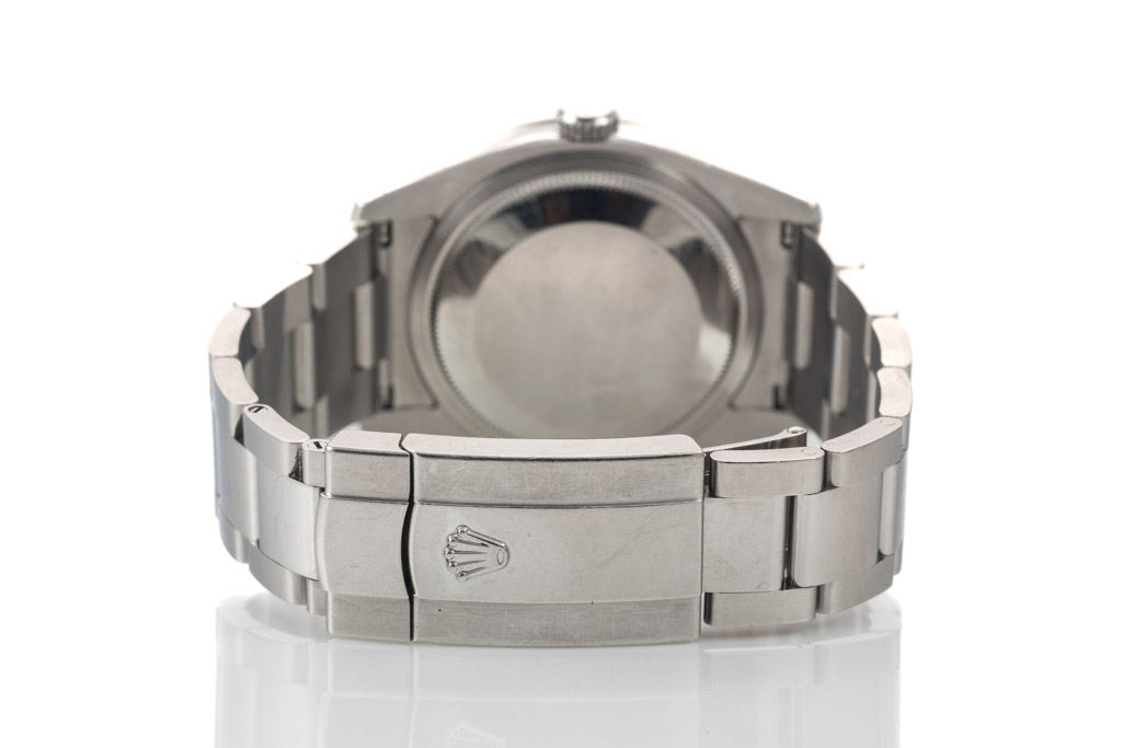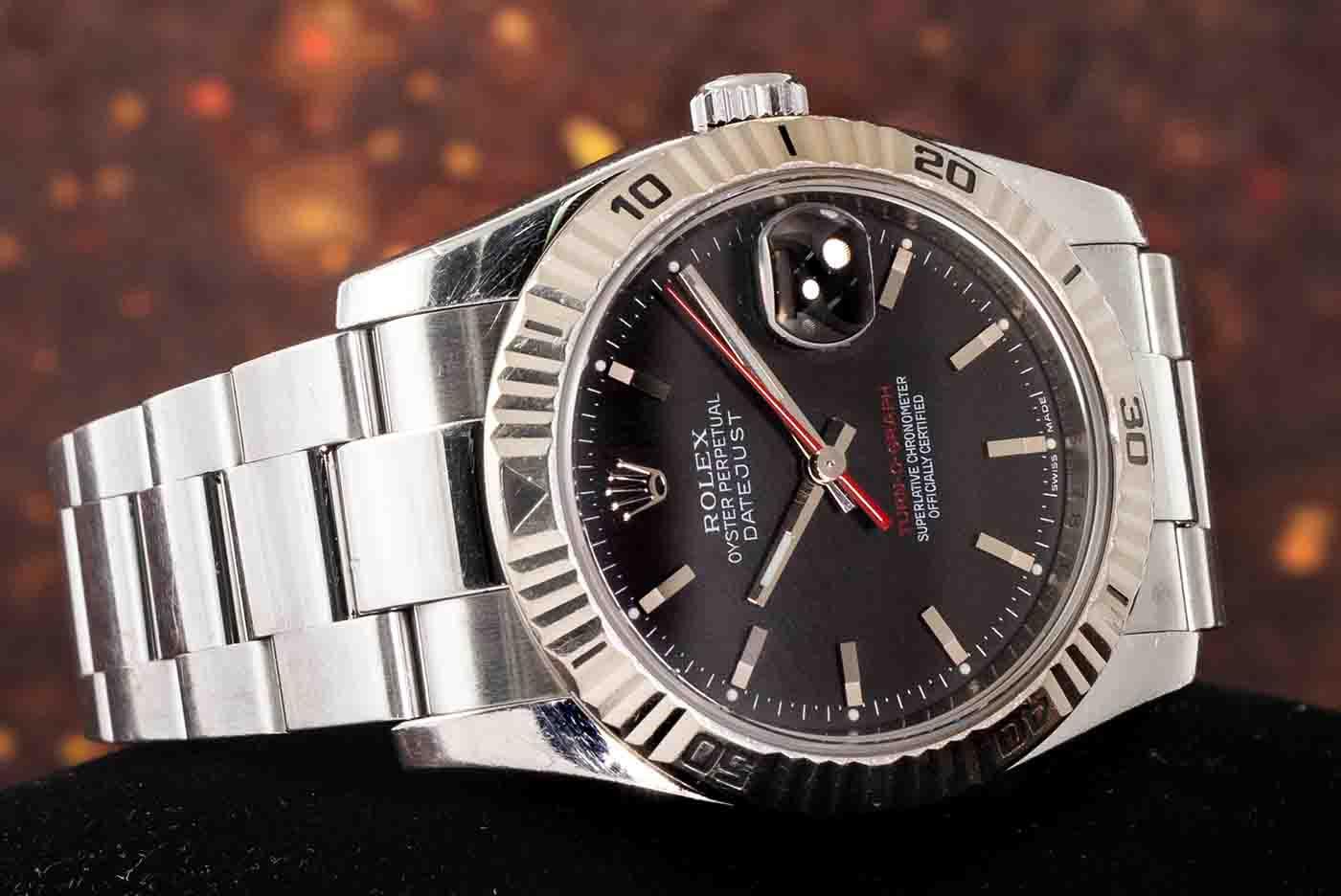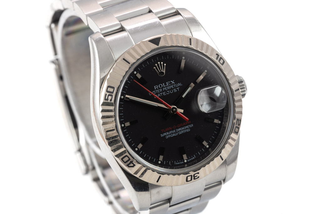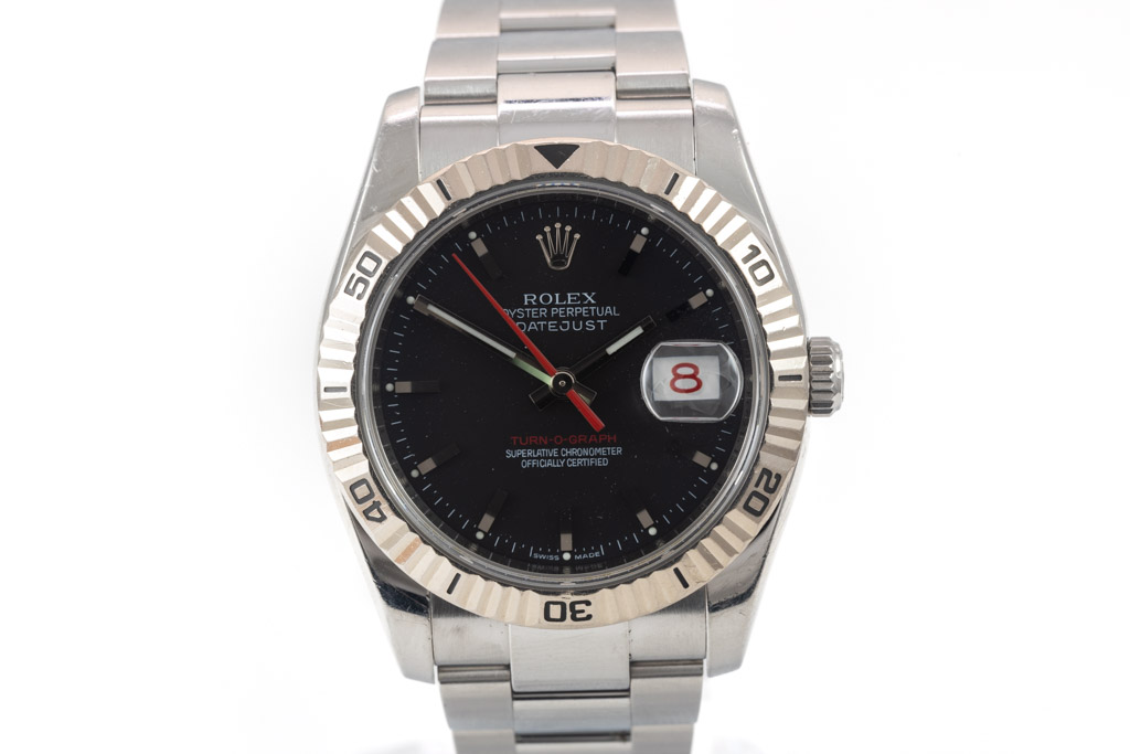 Rolex Oyster Perpetual Datejust Turn-O-Graph stainless steel and 18ct white gold automatic mens watch. Black dial, date, case diameter: 36mm, wrist size: 16.5cm, Swiss made. Ref# 116264, Circa: 2007 or 2008. With Rolex stainless steel Oyster bracelet and clasp. With Certificate of Authenticity. 3 month FSA warranty. (Pre-owned)