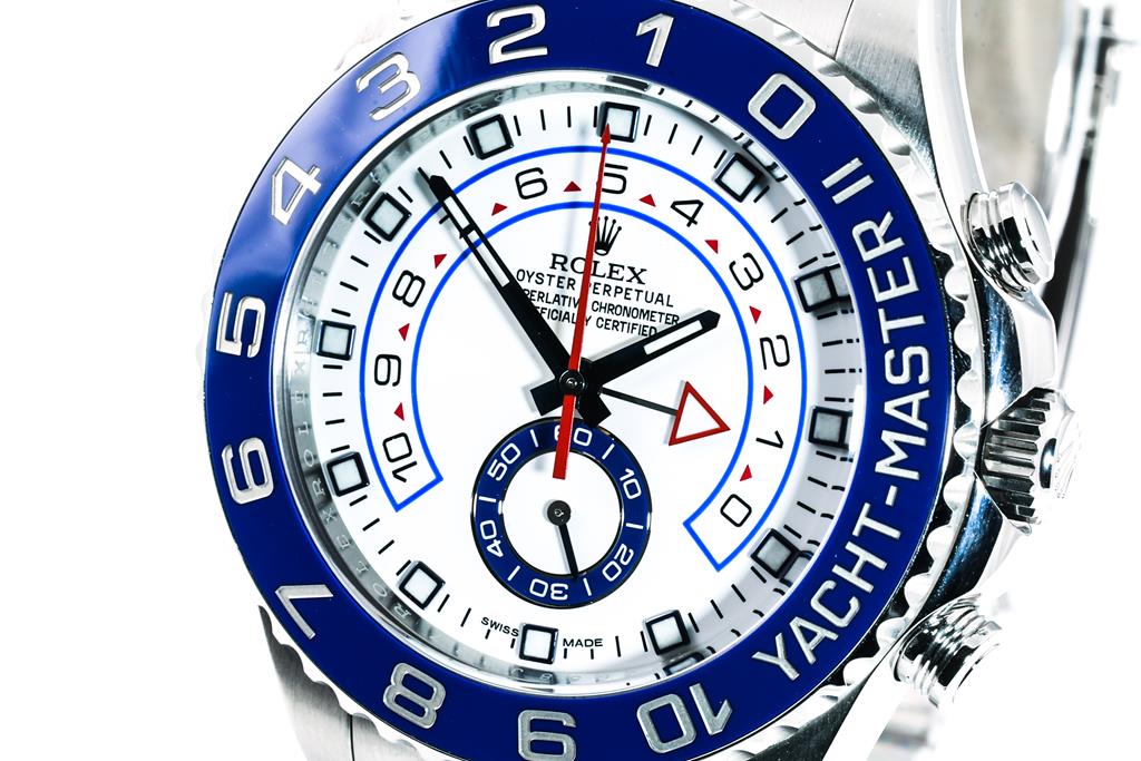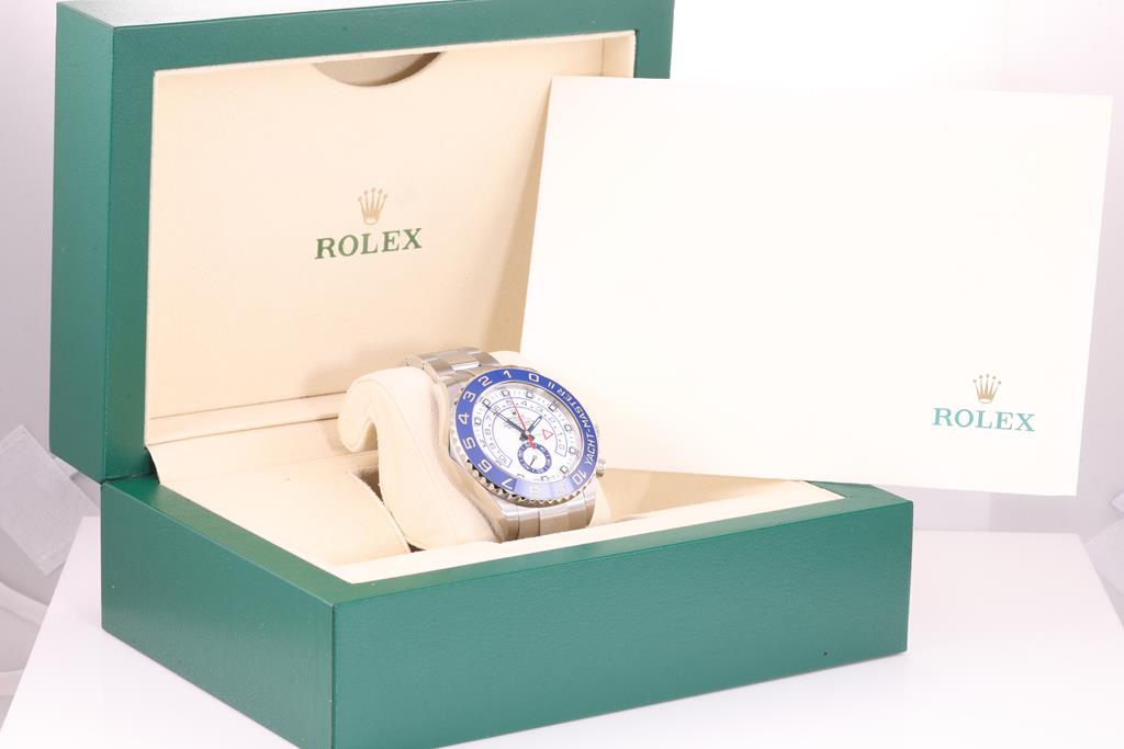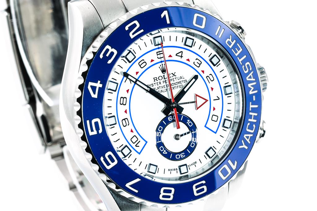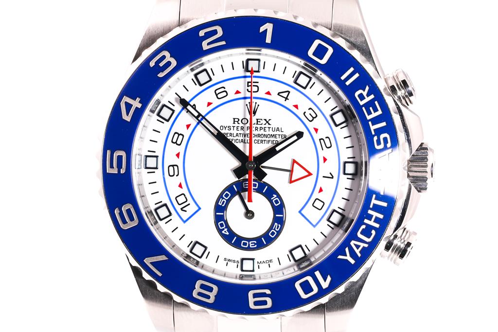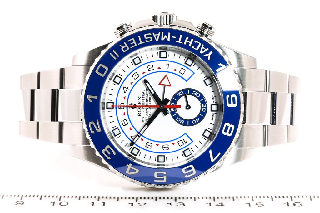 Rolex Yacht-Master II stainless steel automatic mens watch. White dial, small second, case diameter: 44mm, wrist size: 19cm, Swiss made. Ref # 116680, Circa: 2011-2021. With Rolex stainless steel Oyster bracelet and clasp. With Certificate of Authenticity, Rolex International Guarantee Card dated 08/03/2014, Rolex International Service Guarantee card dated 07/05/2019 and Rolex box. 3 month FSA warranty. (Pre-owned)