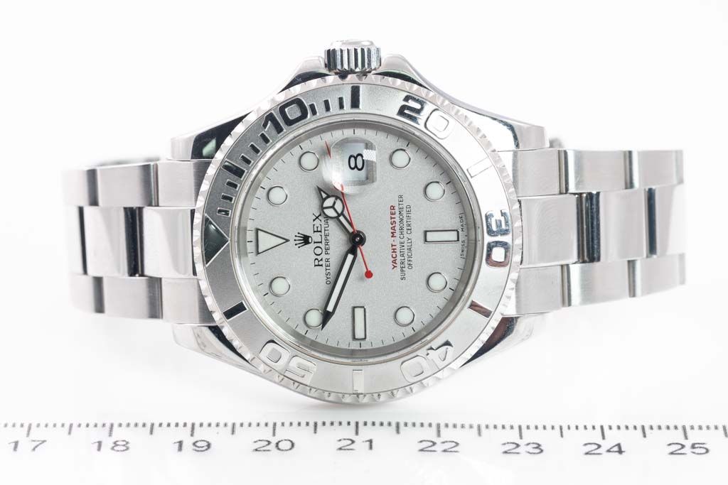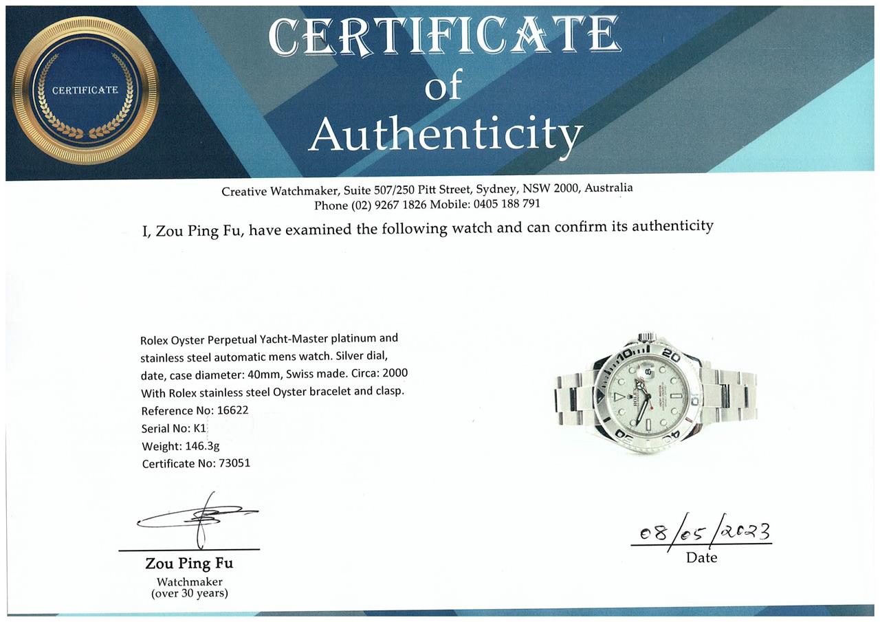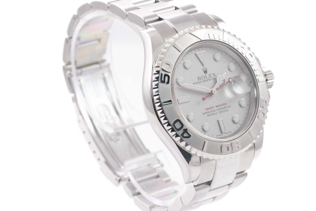 Rolex Oyster Perpetual Yacht-Master platinum and stainless steel automatic mens watch. Silver dial, date, case diameter: 40mm, wrist size: 18.5cm, Swiss made. Ref# 16622. Circa: 2000. With Rolex stainless steel Oyster bracelet and clasp. With Certificate of Authenticity and Rolex box. 3 month FSA warranty. (Pre-owned)