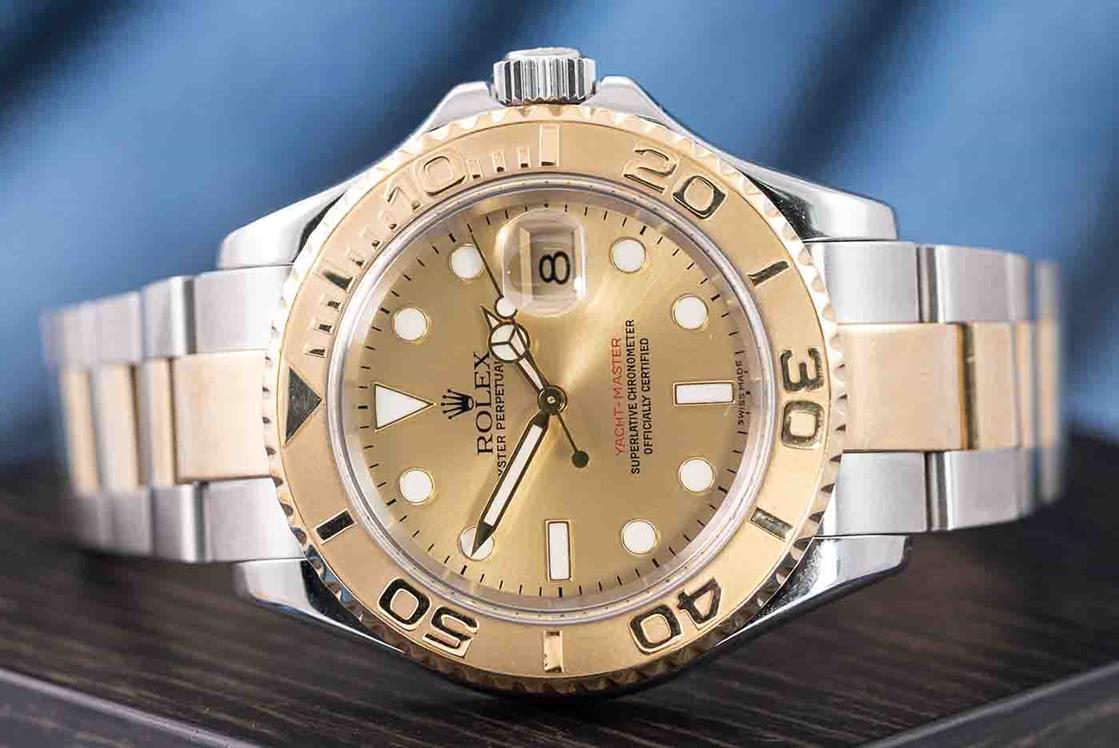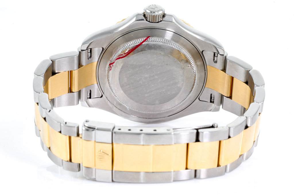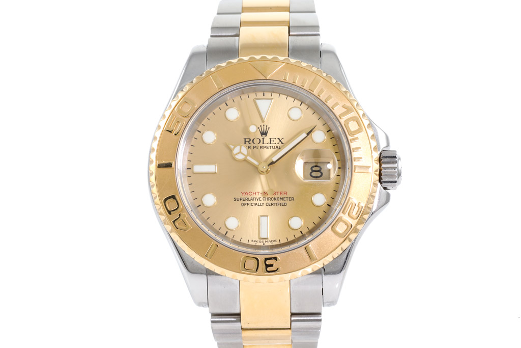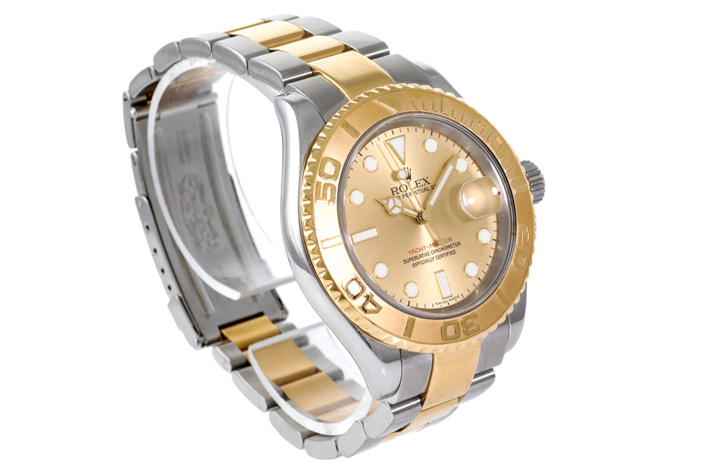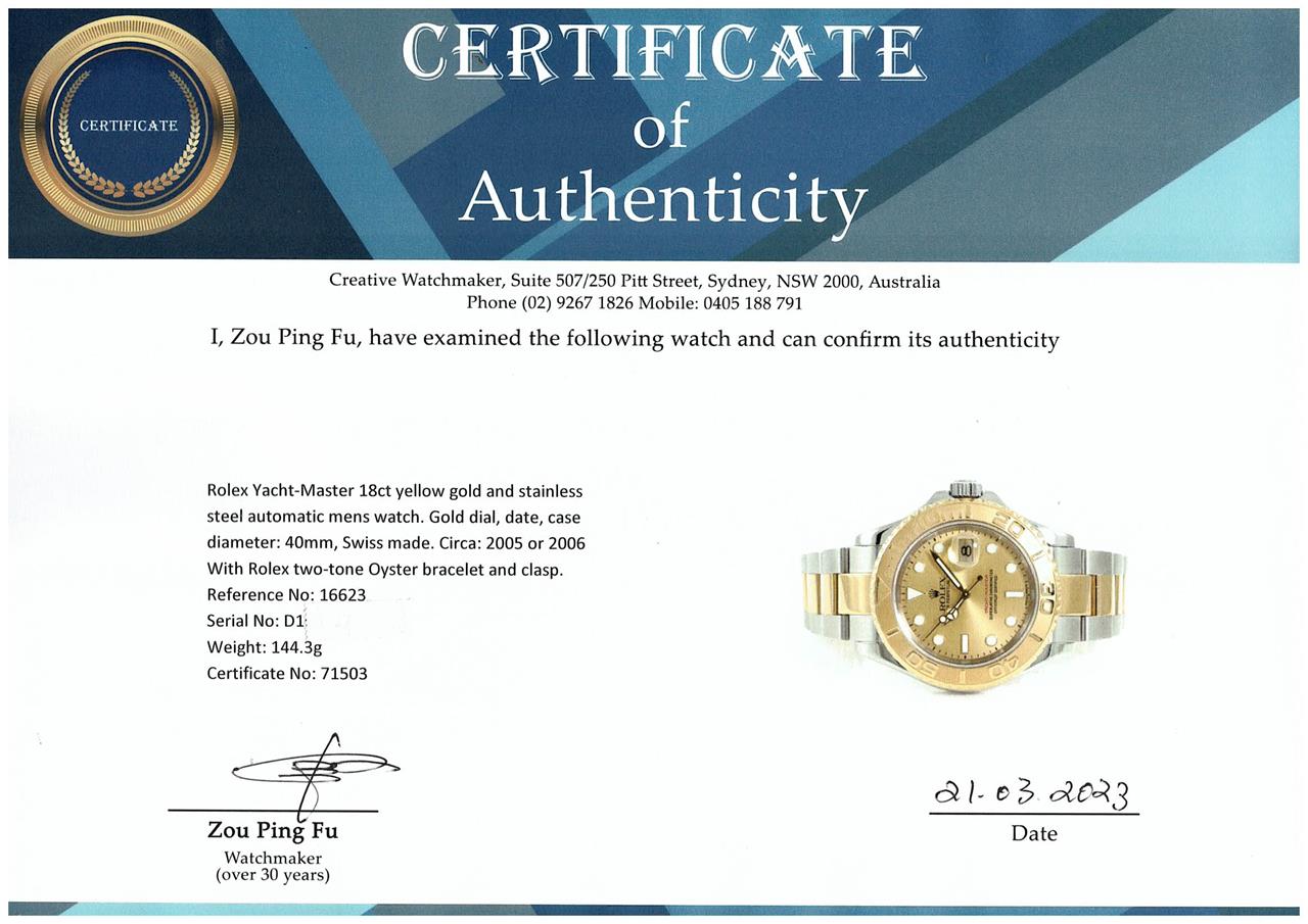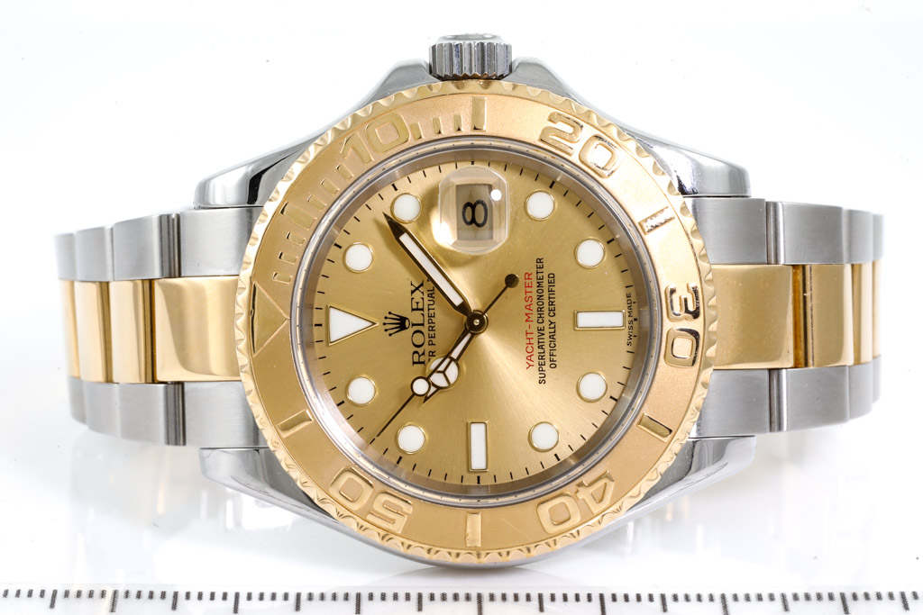 Rolex Yacht-Master 18ct yellow gold and stainless steel automatic mens watch. Gold dial, date, case diameter: 40mm, wrist size: 18.5cm, Swiss made. Ref# 16623. Circa: 2005 or 2006. With Rolex two-tone Oyster bracelet and clasp. With Certificate of Authenticity and Rolex box. 3 month FSA warranty. (Pre-owned)
