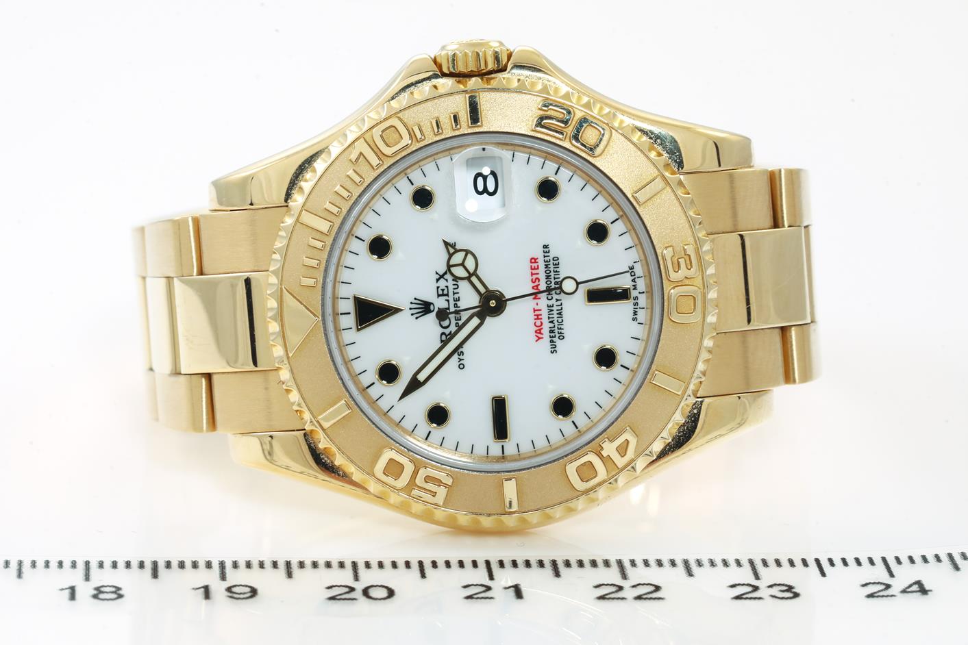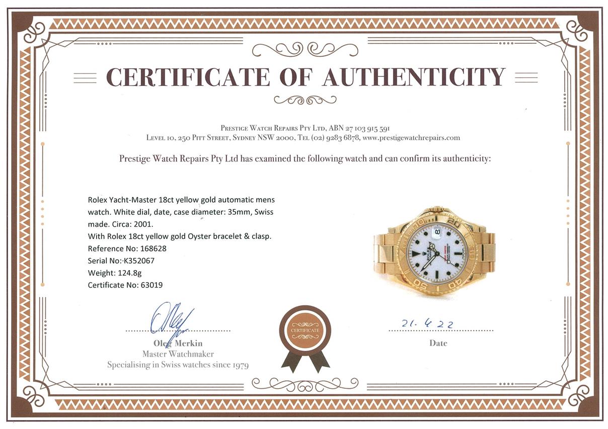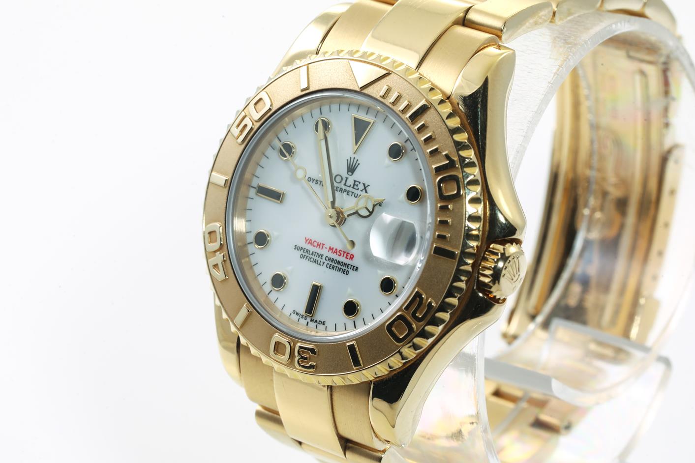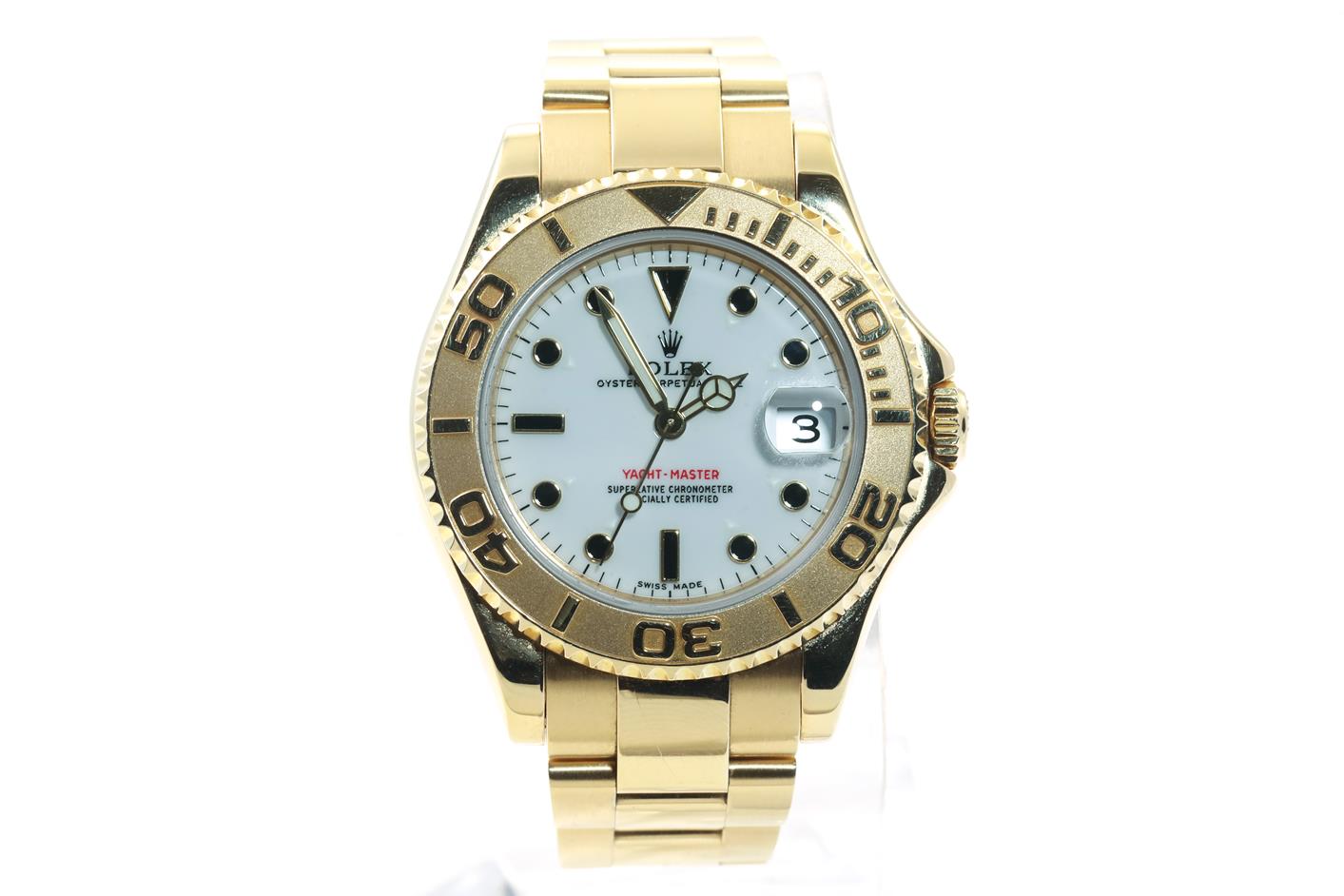 Rolex Yacht-Master 18ct yellow gold automatic mens watch. White dial, date, case diameter: 35mm, wrist size: 16cm, Swiss made. Ref# 168628, Circa: 2001. With Rolex 18ct yellow gold Oyster bracelet and clasp. With Certificate of Authenticity and Rolex box. 3 month FSA warranty. (Pre-owned)