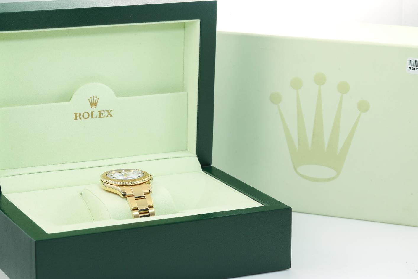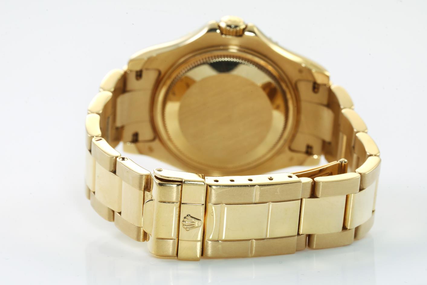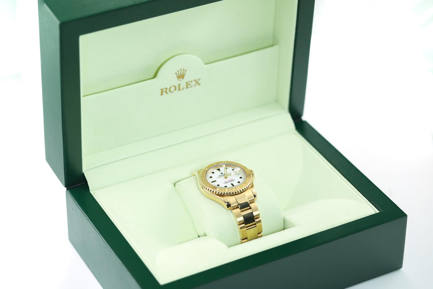 Rolex Yacht-Master 18ct yellow gold automatic mens watch. White dial, date, case diameter: 35mm, wrist size: 16cm, Swiss made. Ref# 168628, Circa: 2001. With Rolex 18ct yellow gold Oyster bracelet and clasp. With Certificate of Authenticity and Rolex box. 3 month FSA warranty. (Pre-owned)