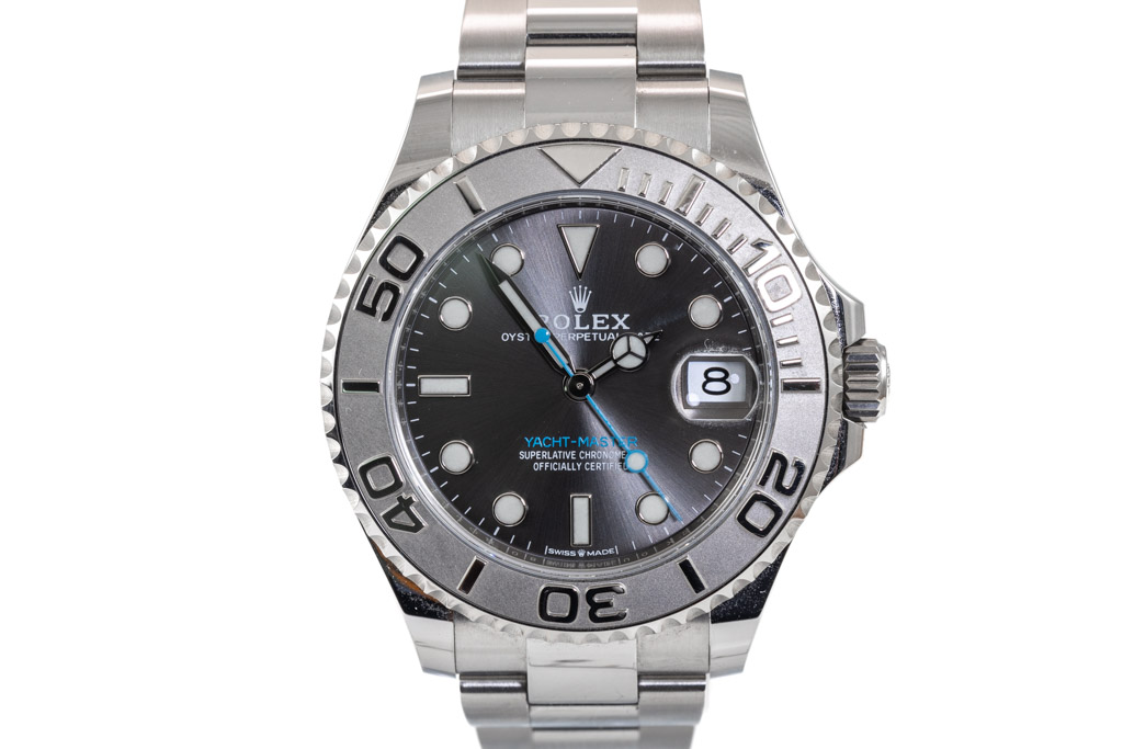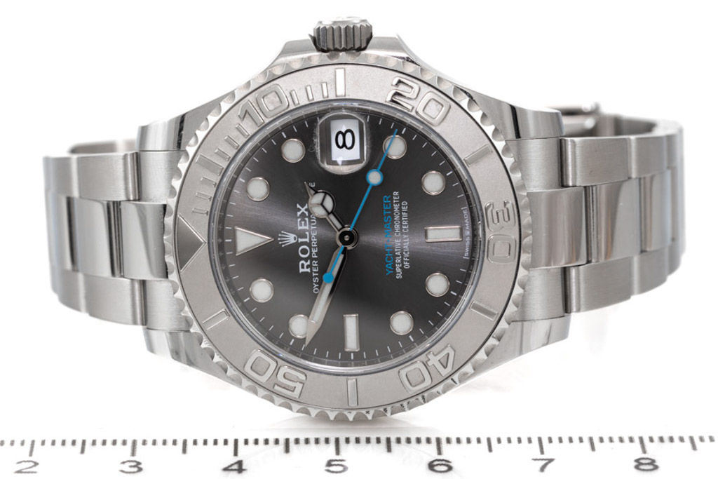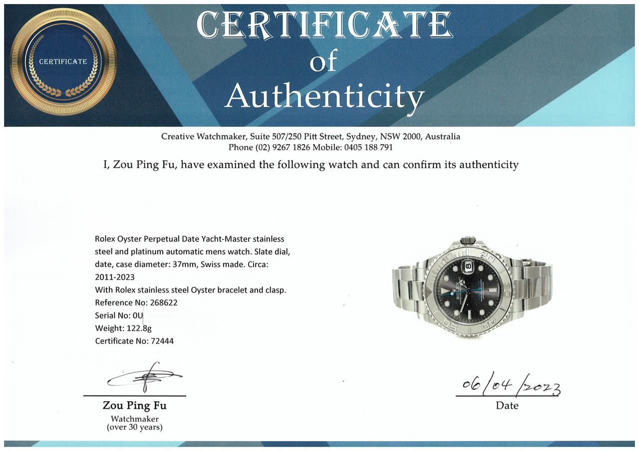 Rolex Oyster Perpetual Date Yacht-Master stainless steel and platinum automatic mens watch. Slate dial, date, case diameter: 37mm, wrist size: 17.5cm, Swiss made. Ref# 268622, Circa: 2011-2023. With Rolex stainless steel Oyster bracelet and clasp. With Certificate of Authenticity, Rolex International Guarantee card dated 21/09/2020 and Rolex box. Balance of 5 year Rolex manufacturer warranty applies. (Pre-owned)