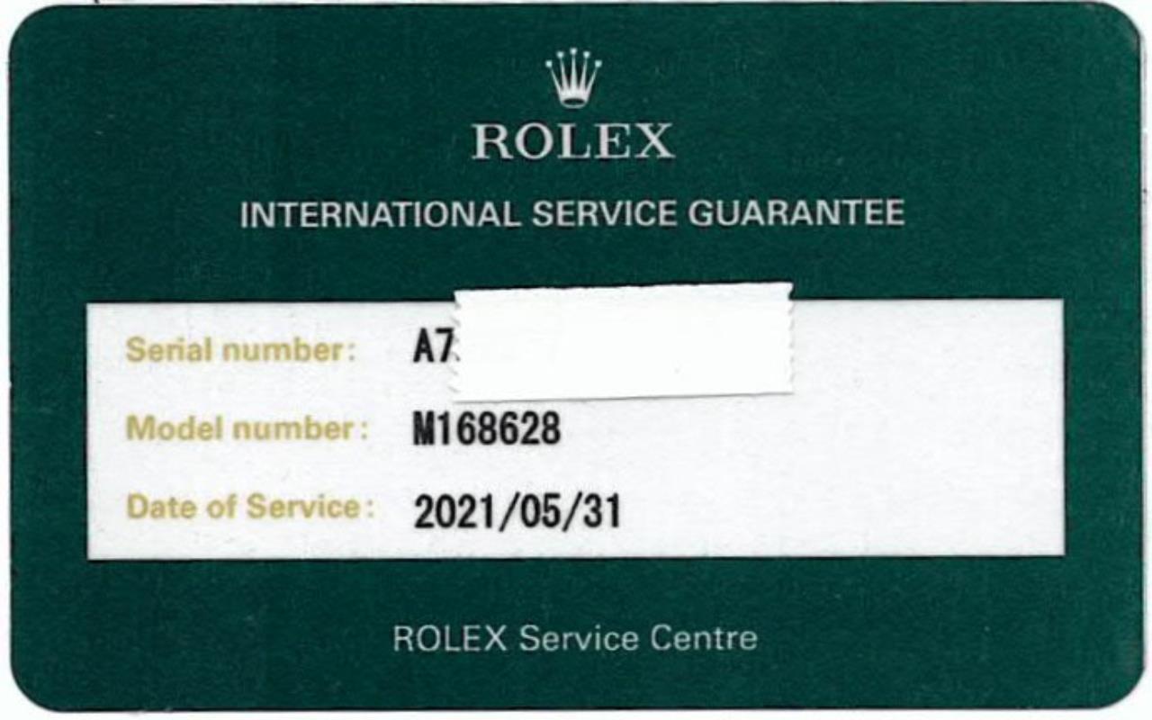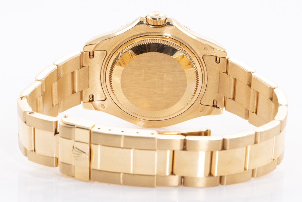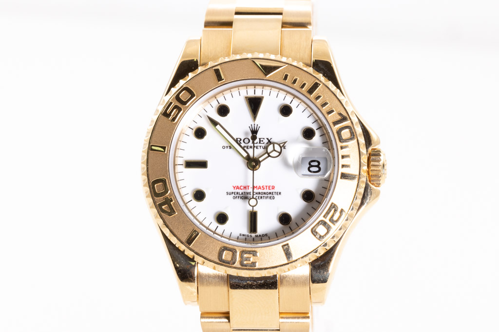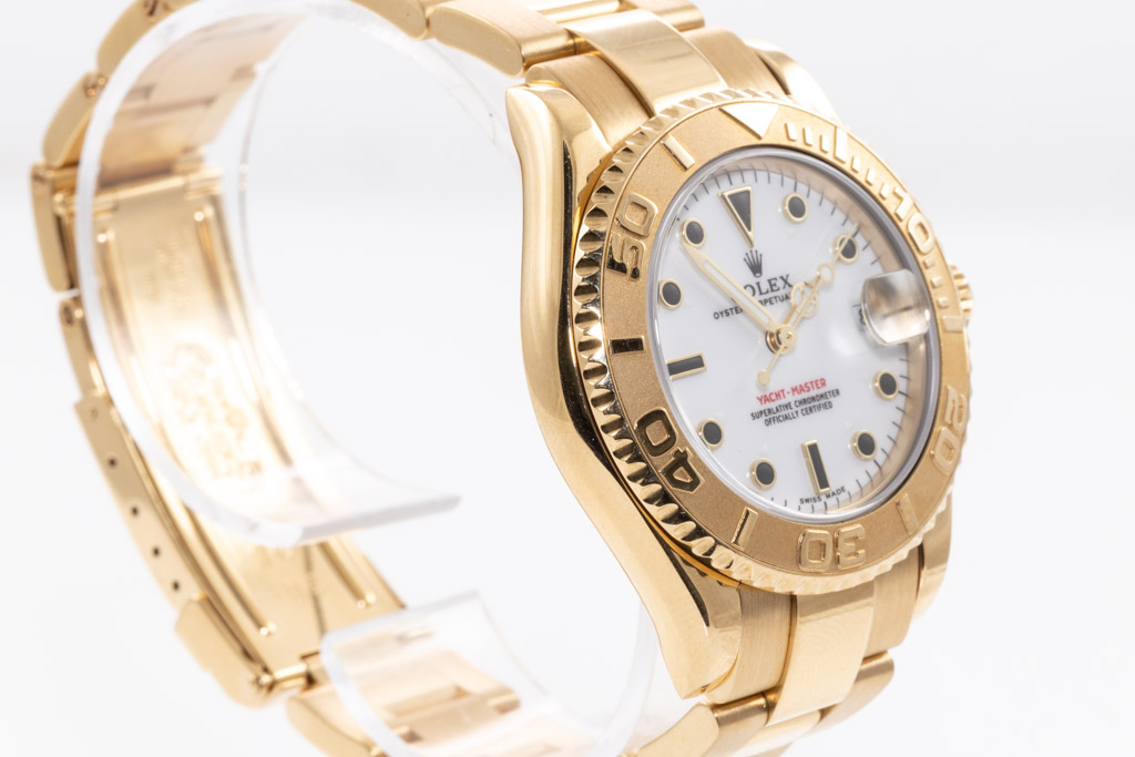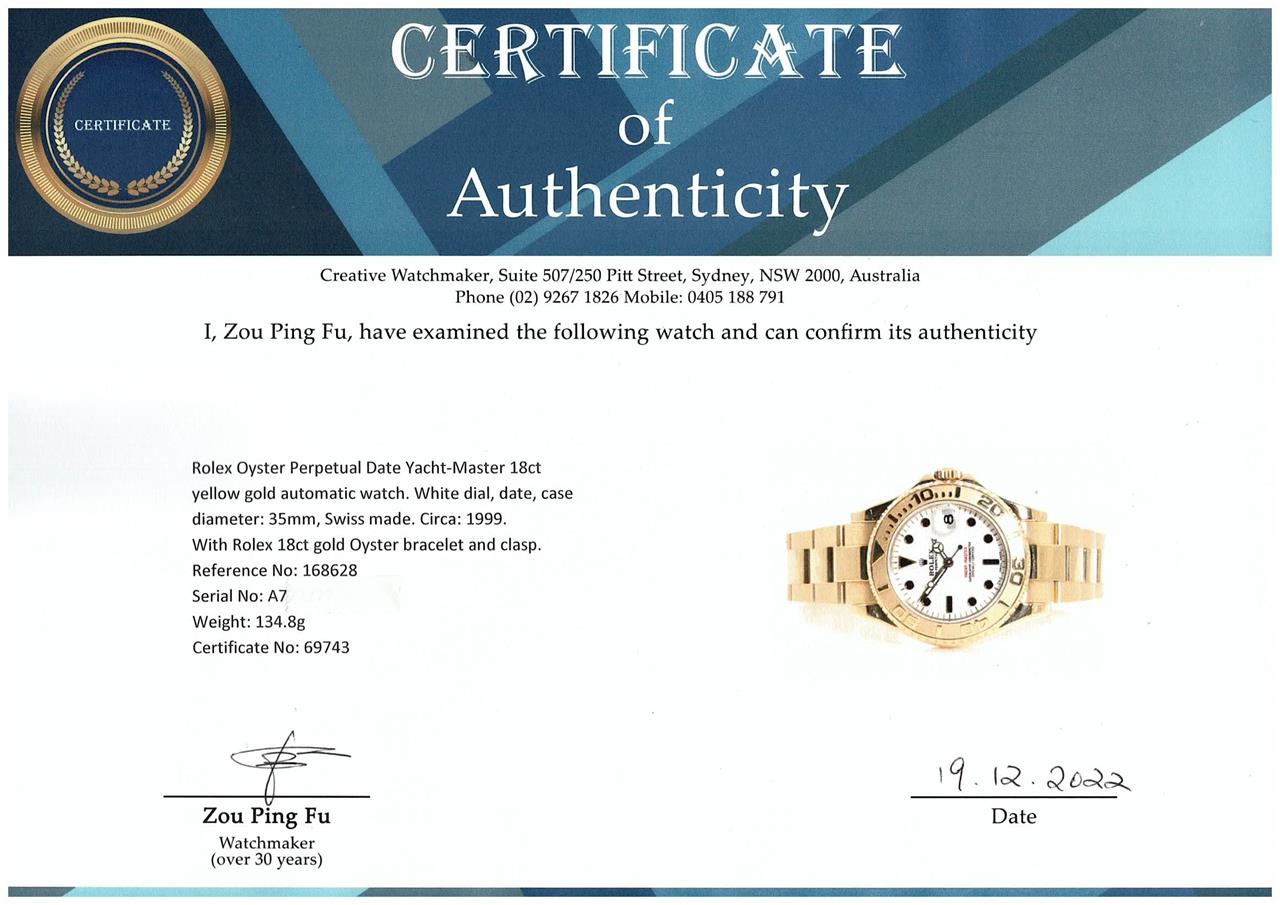 Rolex Oyster Perpetual Date Yacht-Master 18ct yellow gold automatic watch. White dial, date, case diameter: 35mm, wrist size: 18cm, Swiss made. Ref# 168628. Circa: 1999. With Rolex 18ct yellow gold Oyster bracelet and clasp. With Certificate of Authenticity, Rolex Guarantee Certificate dated 04/09/2000, Rolex International Service Guarantee Card dated 31/05/2021 and Rolex box. Balance of 2 year Rolex Service warranty. (Pre-owned)