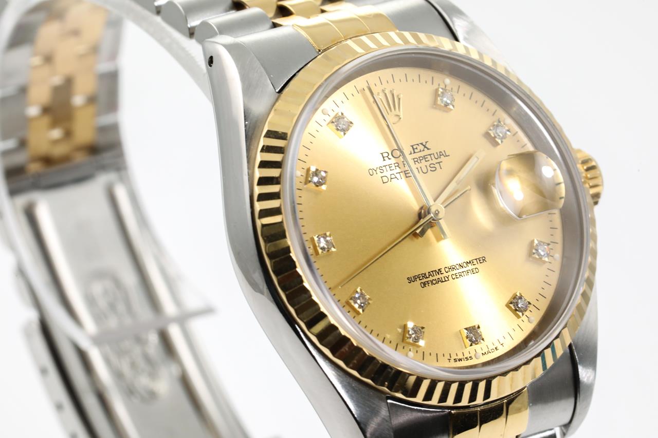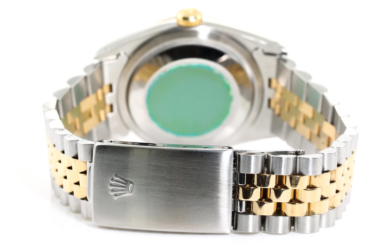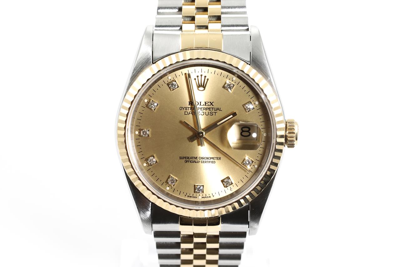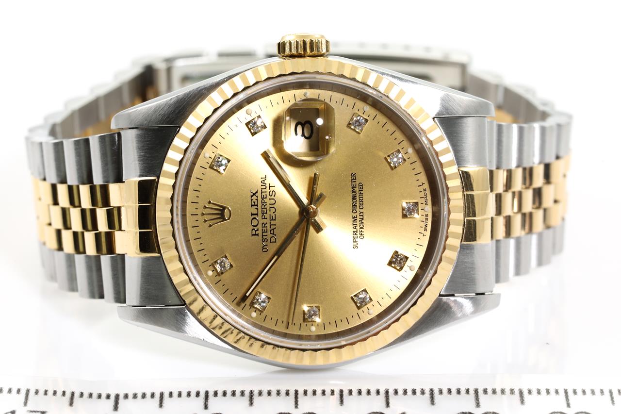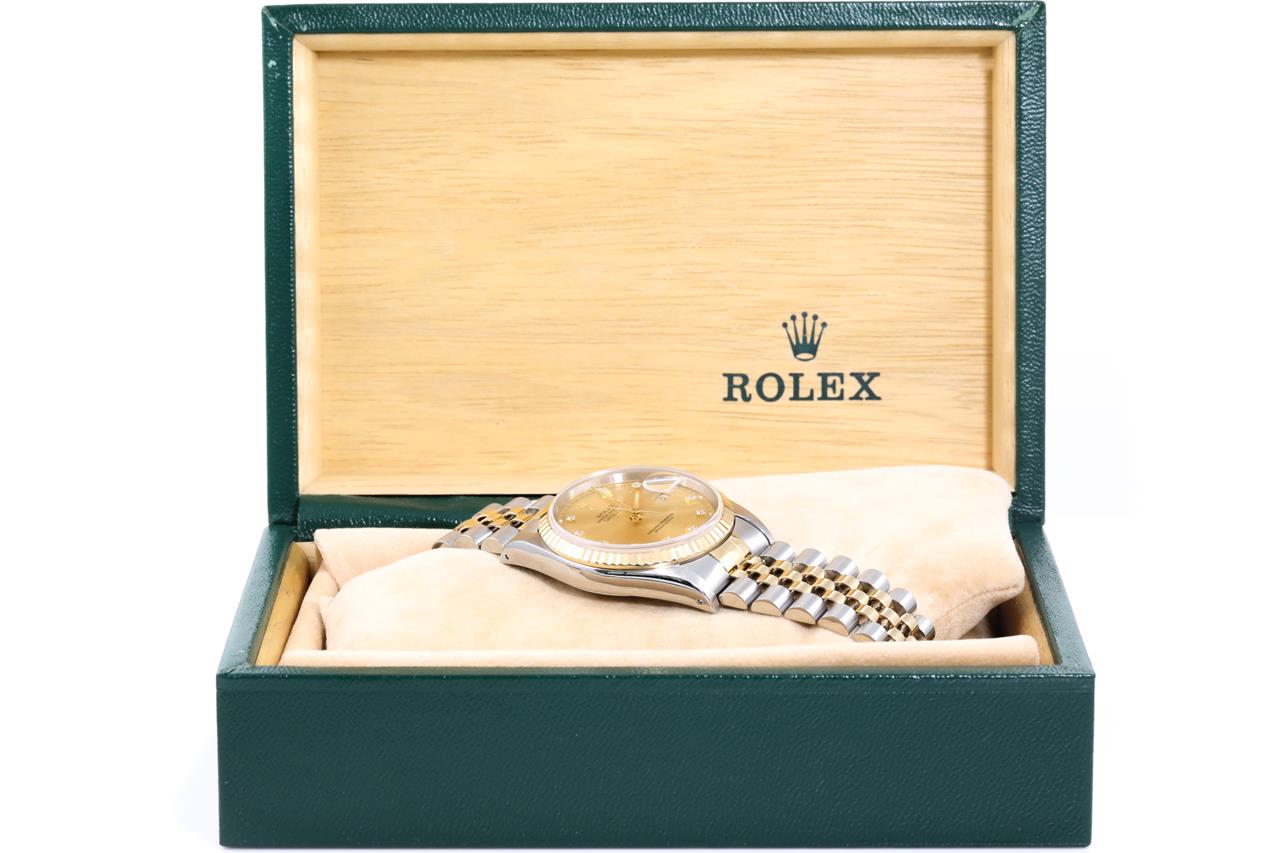 Rolex Oyster Perpetual Datejust 18ct yellow gold & stainless steel automatic mens watch. Gold dial, Diamond indicators, date, case diameter: 36mm, wrist size: 19cm, Swiss made. Ref# 16233G, Circa: 1991. With Rolex two-tone Jubilee bracelet and clasp. With Certificate of Authenticity, Rolex Guarantee Certificate, and Rolex box. 3 month FSA warranty. (Pre-owned)