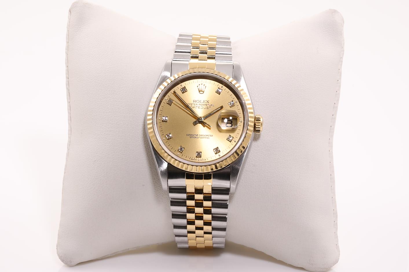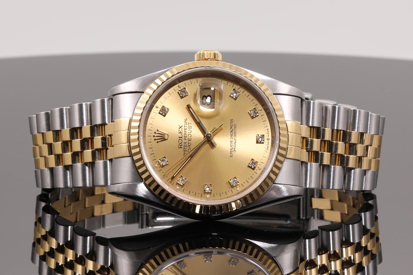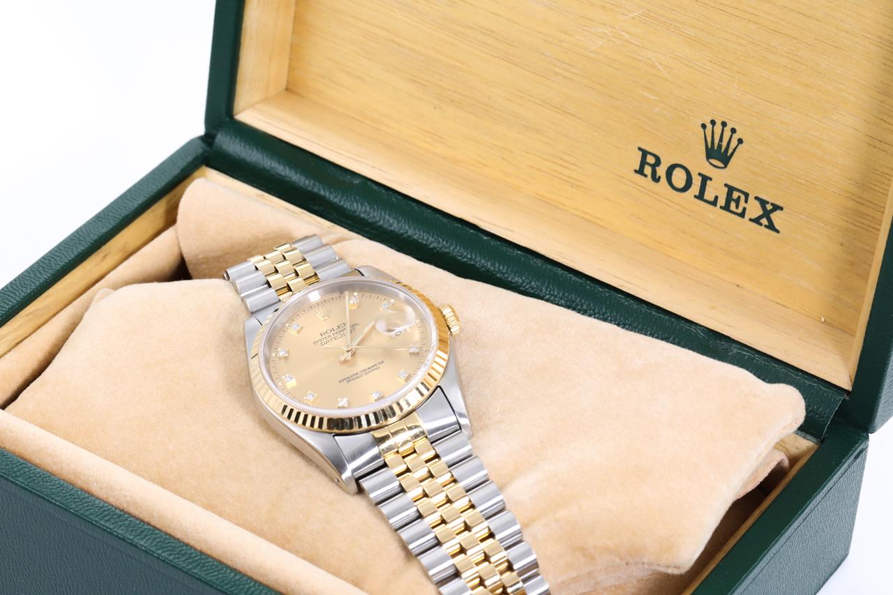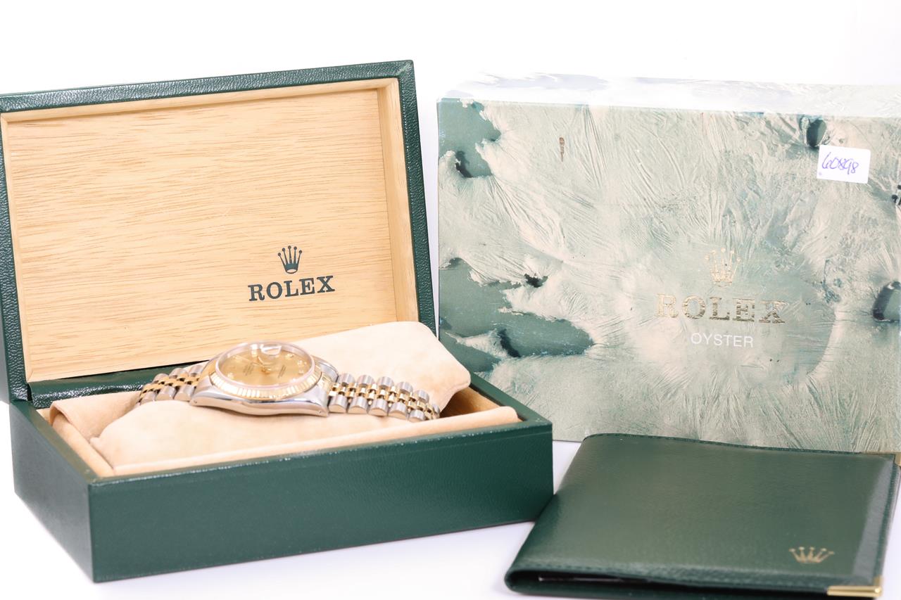 Rolex Oyster Perpetual Datejust 18ct yellow gold & stainless steel automatic mens watch. Gold dial, Diamond indicators, date, case diameter: 36mm, wrist size: 19cm, Swiss made. Ref# 16233G, Circa: 1991. With Rolex two-tone Jubilee bracelet and clasp. With Certificate of Authenticity, Rolex Guarantee Certificate, and Rolex box. 3 month FSA warranty. (Pre-owned)