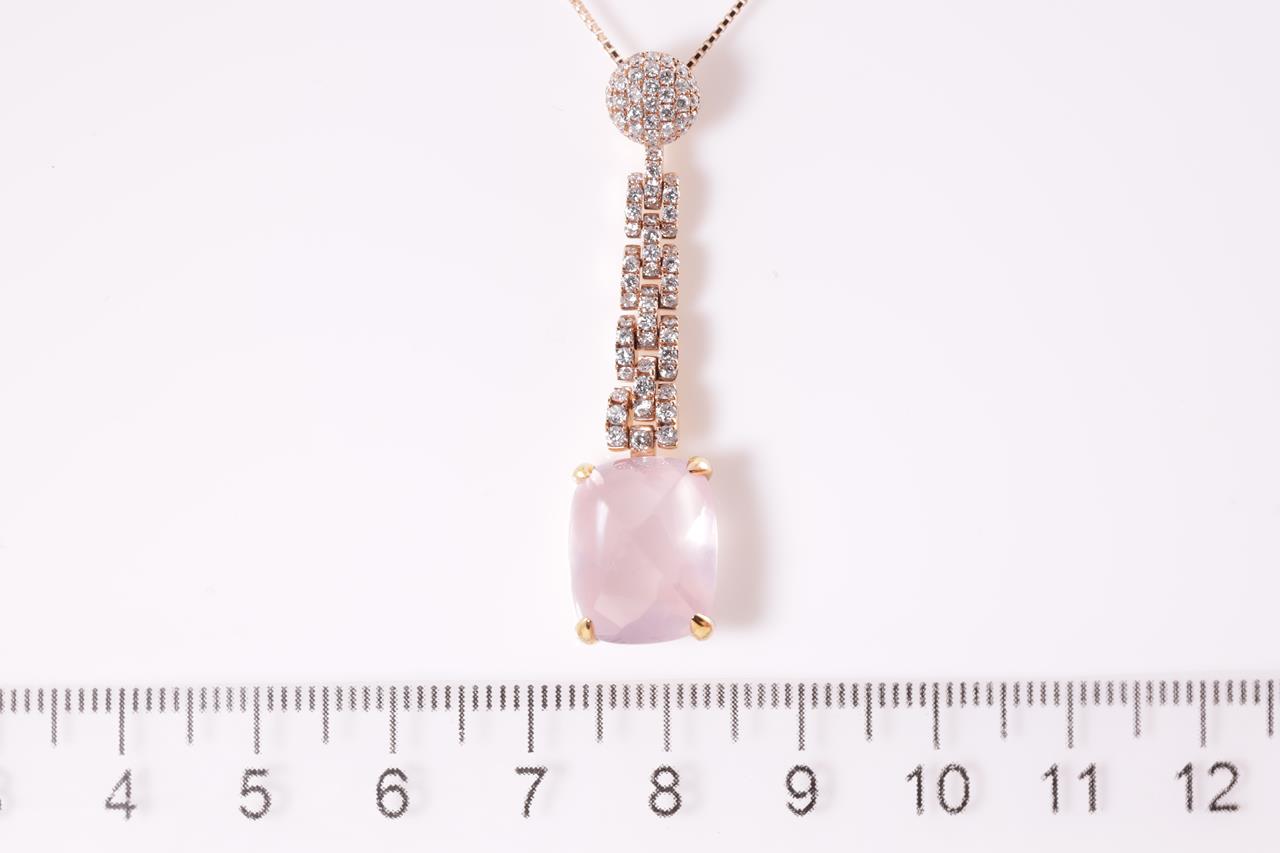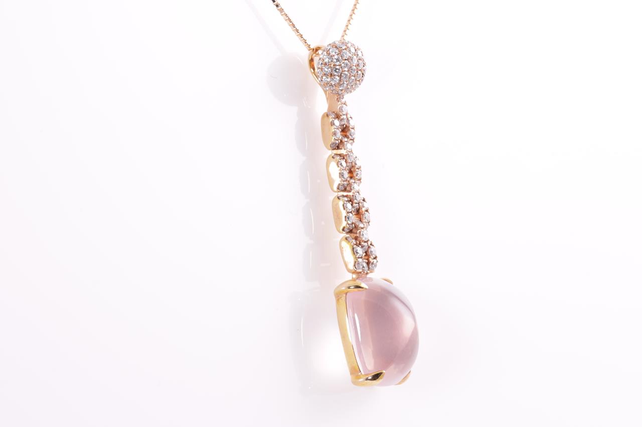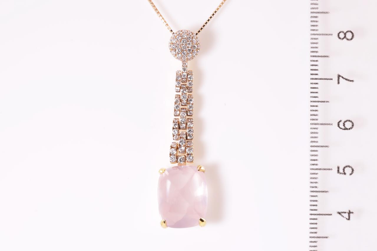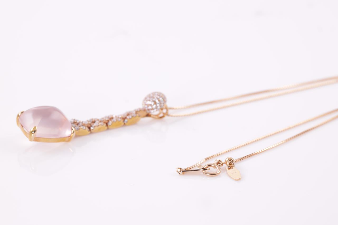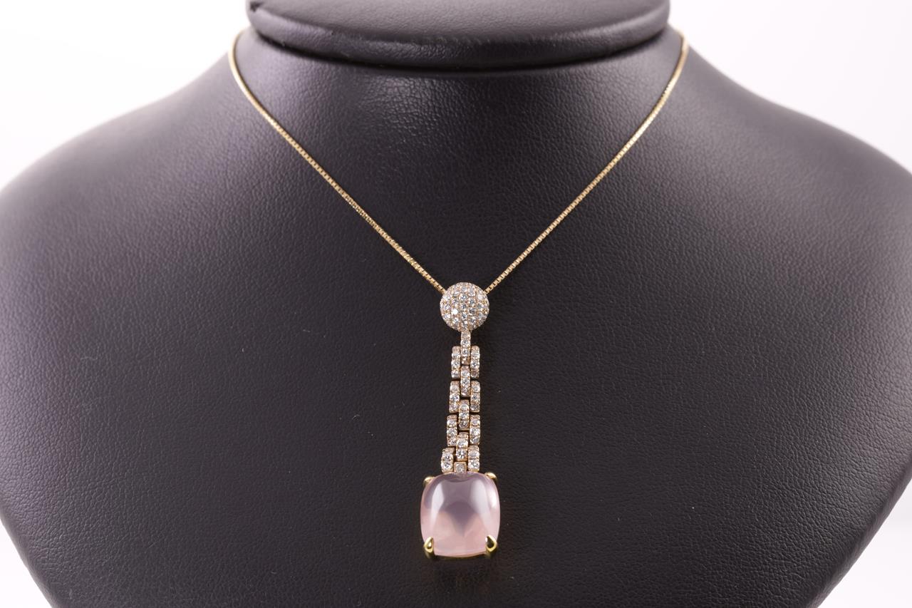Quartz and Diamond pendant with fancy cabochon cut Rose Quartz of 9.61ct and Diamonds totalling 0.76cts (Estimated grading: G SI). 18ct rose gold with adjustable 45cm chain. Weight: 7.9g (Pre-owned)