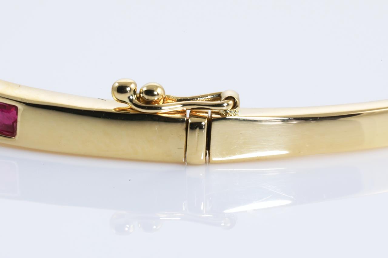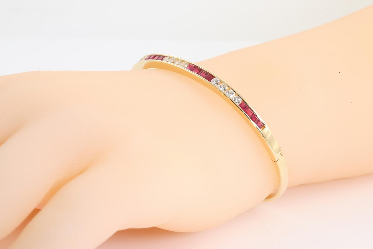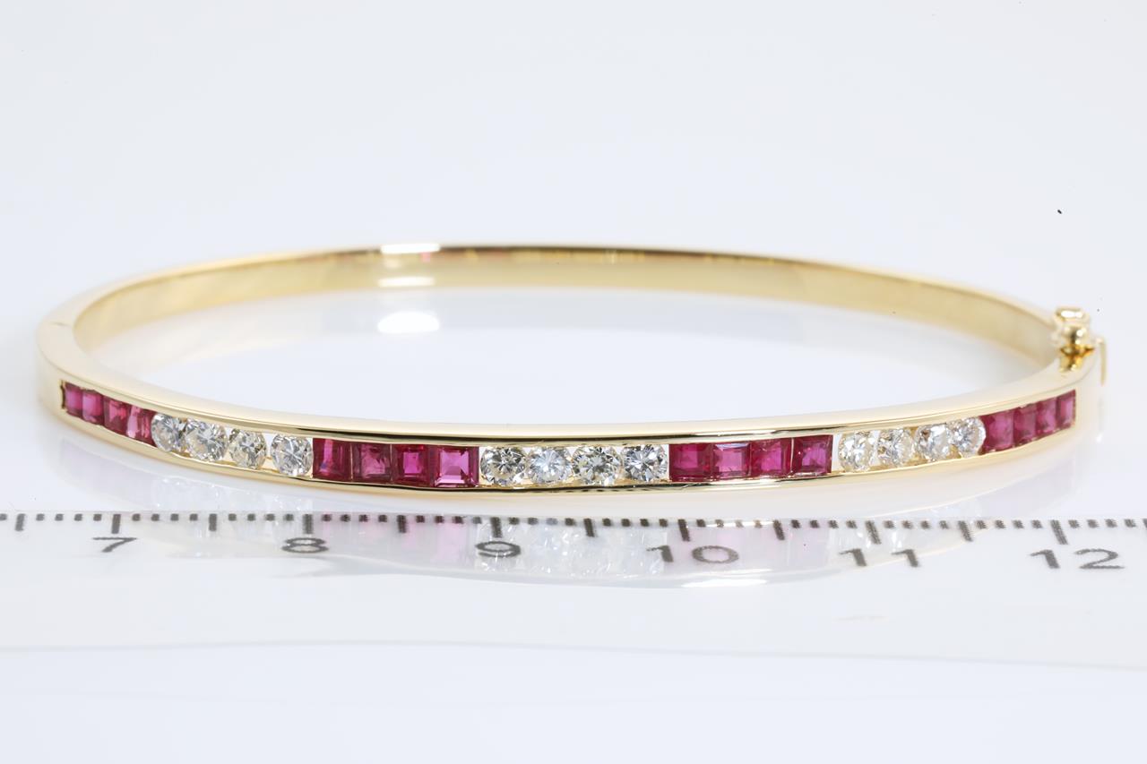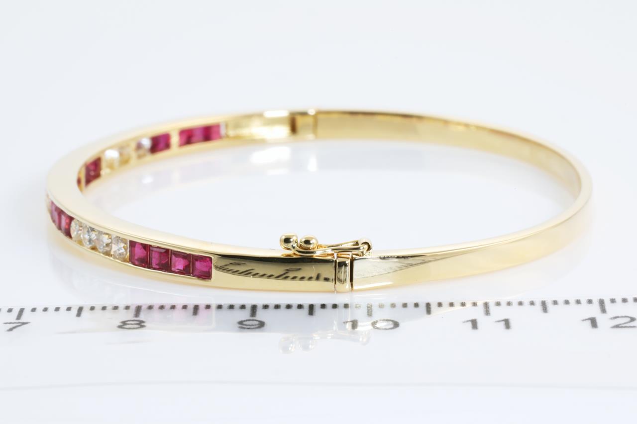 Ruby and Diamond bangle with Rubies totalling approximately 0.90cts and Diamonds totalling approximately 0.72cts (Estimated grading: J SI). 18ct yellow gold. Inner circumference 16.5cm. Weight: 11.9g (Pre-owned)
