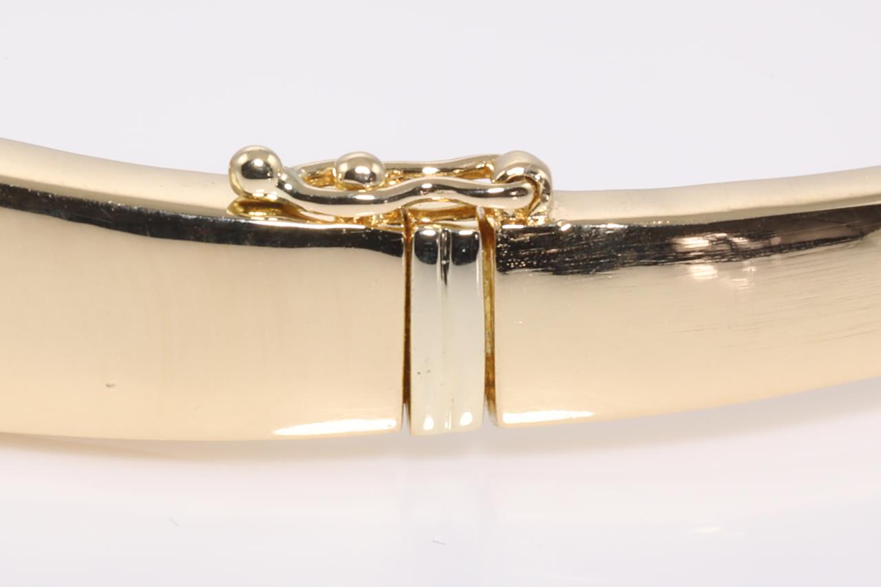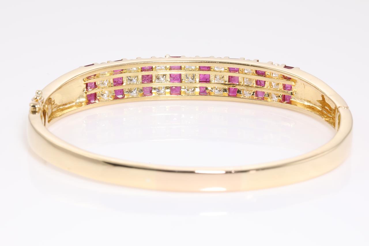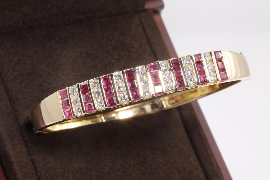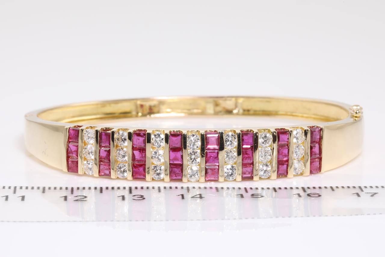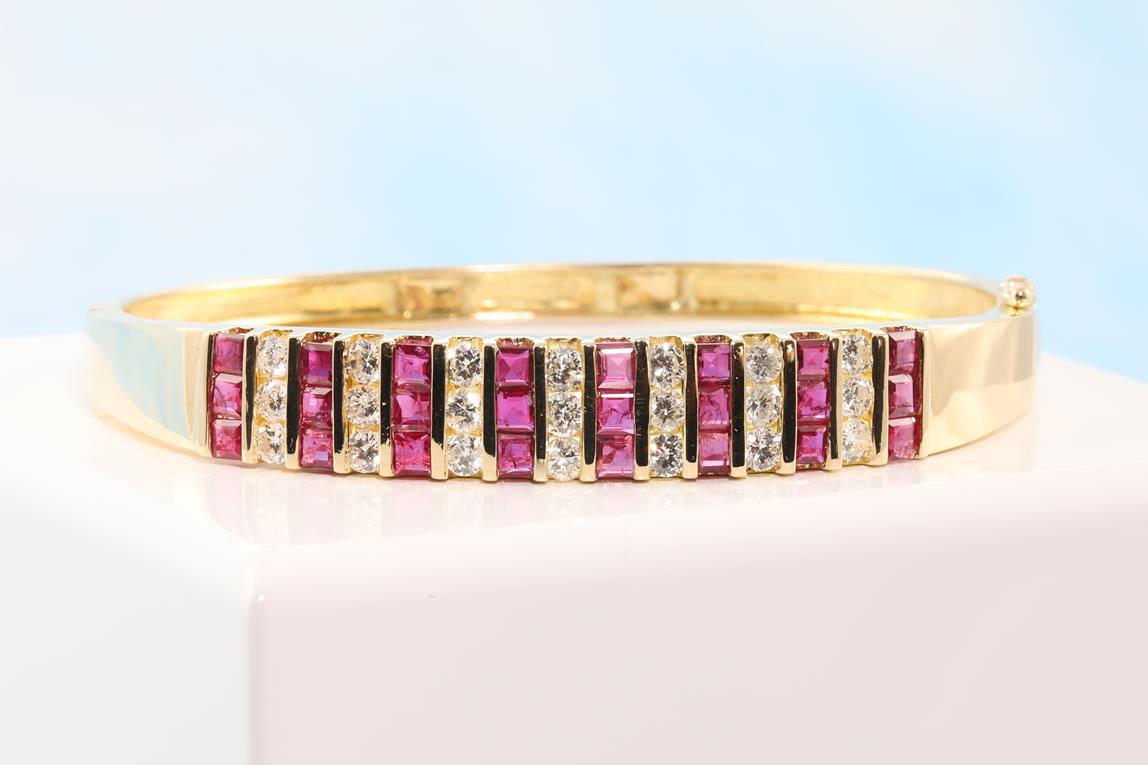 Ruby and Diamond bangle with princess cut Rubies totalling approximately 2.75cts and round cut Diamonds totalling approximately 1.75cts (Estimated grading: I-J SI-P1). 18ct yellow gold. Circumference: 17cm. Weight: 26.7g With Certificate #414590. (Pre-owned)