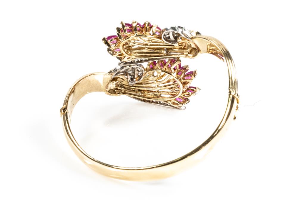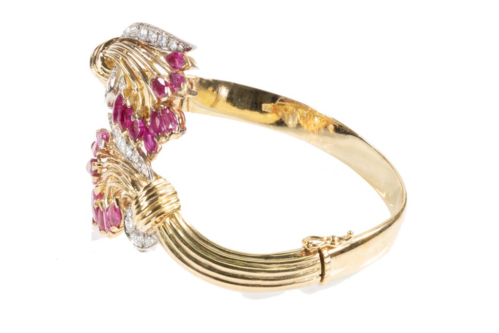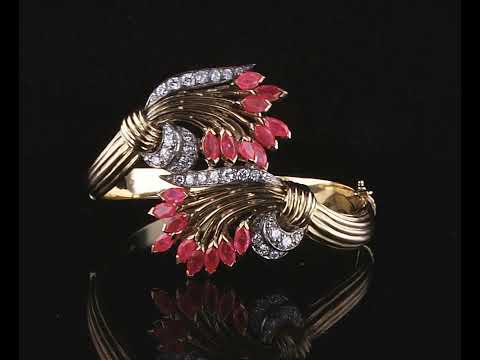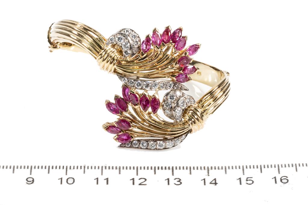 Ruby and Diamond bangle with marquise cut Rubies Totalling approximately 3.60cts and round Diamonds totalling approximately 0.85cts (estimated grading H-I SI). 18ct white and yellow gold. Circumference 14-15cm. Weight 39.5g. With certificate #415613. (Pre-owned)