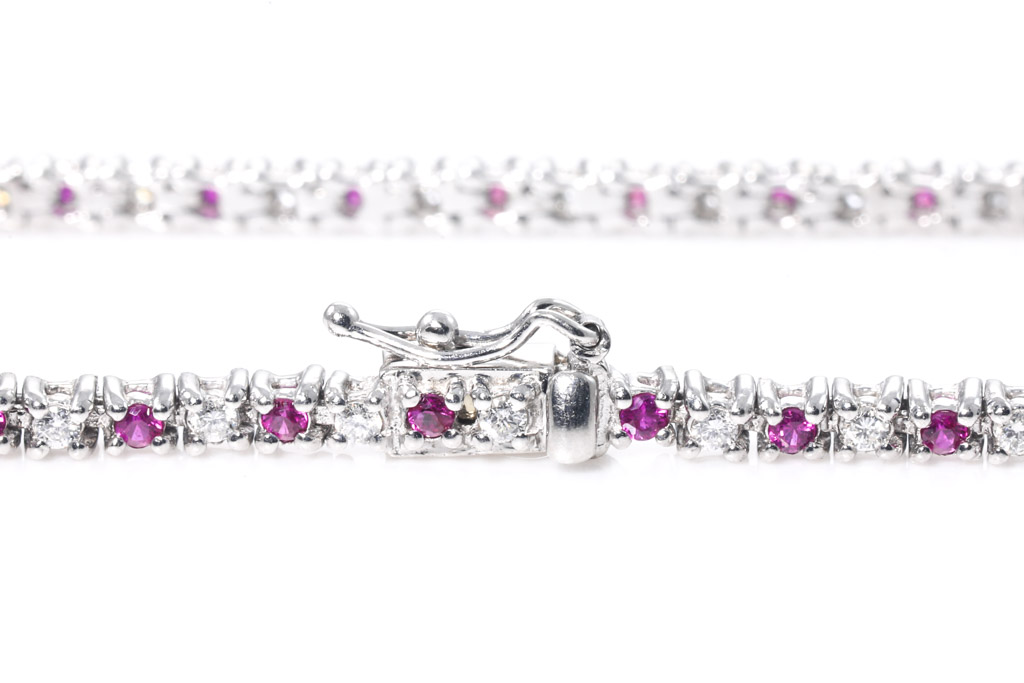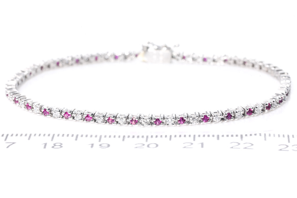 Ruby and Diamond bracelet with round Rubies totalling 0.60cts and round Diamonds totalling 0.50cts (Estimated grading: G-H SI). Platinum. Length: 17cm. Weight: 9.8g. (Pre-owned)