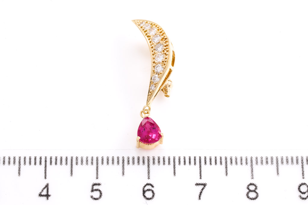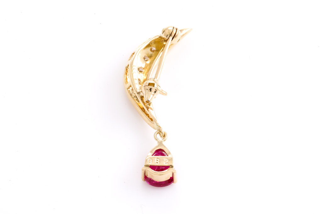 Ruby and Diamond brooch with pear shape Ruby of 0.82ct and round Diamonds totalling 0.21cts. 18ct yellow gold. Weight: 2.2g. (Pre-owned)