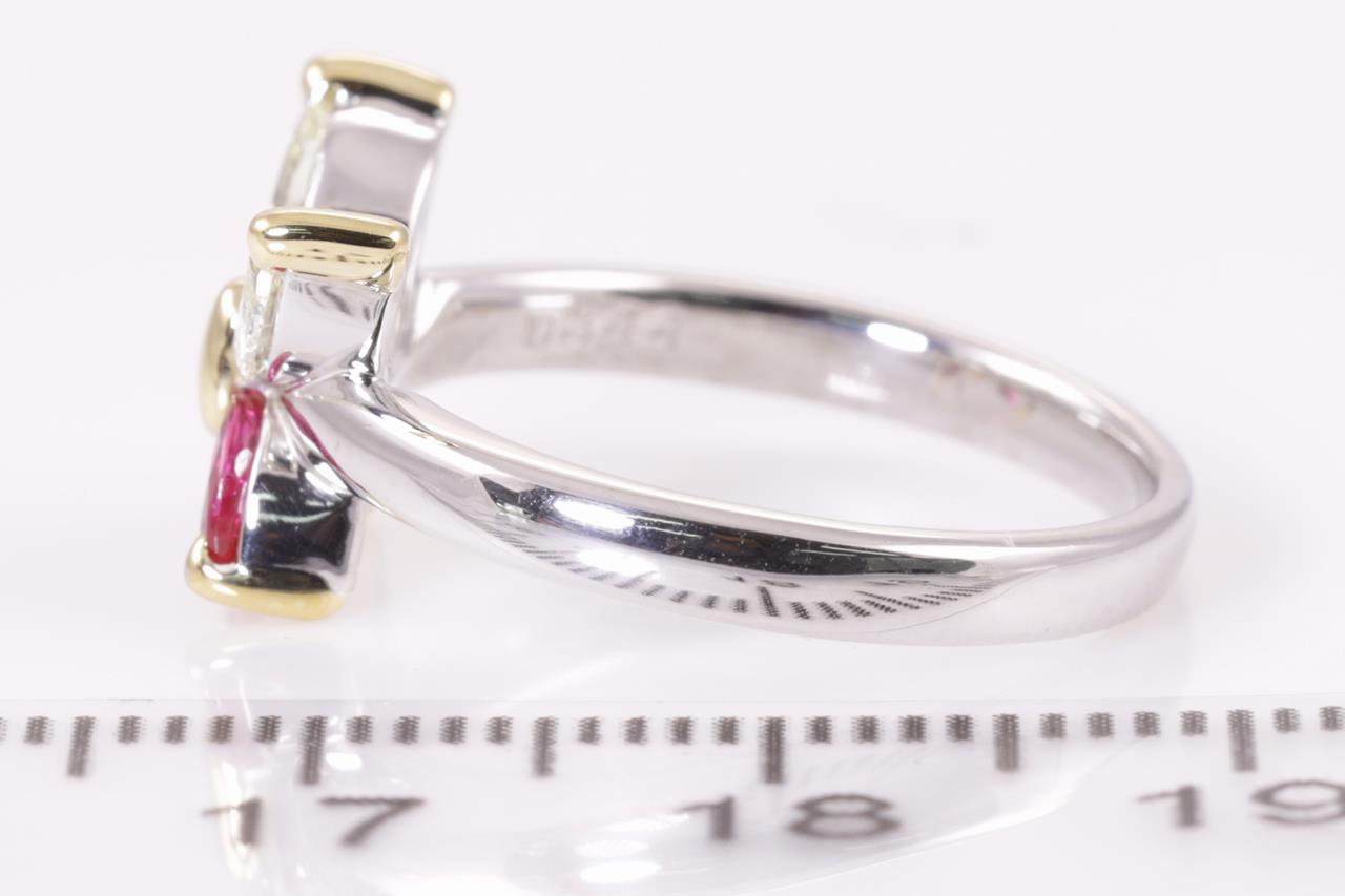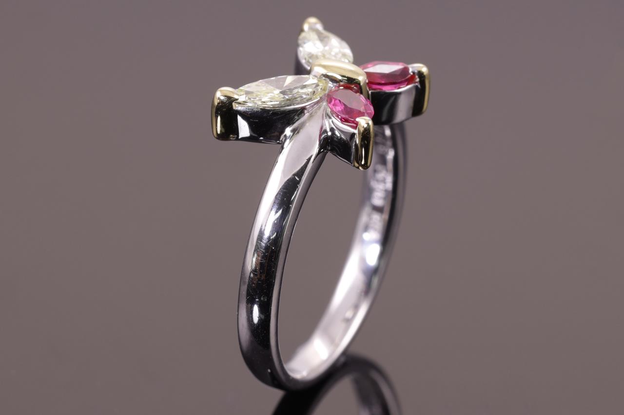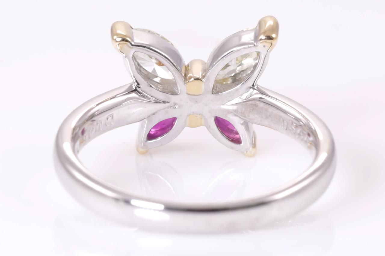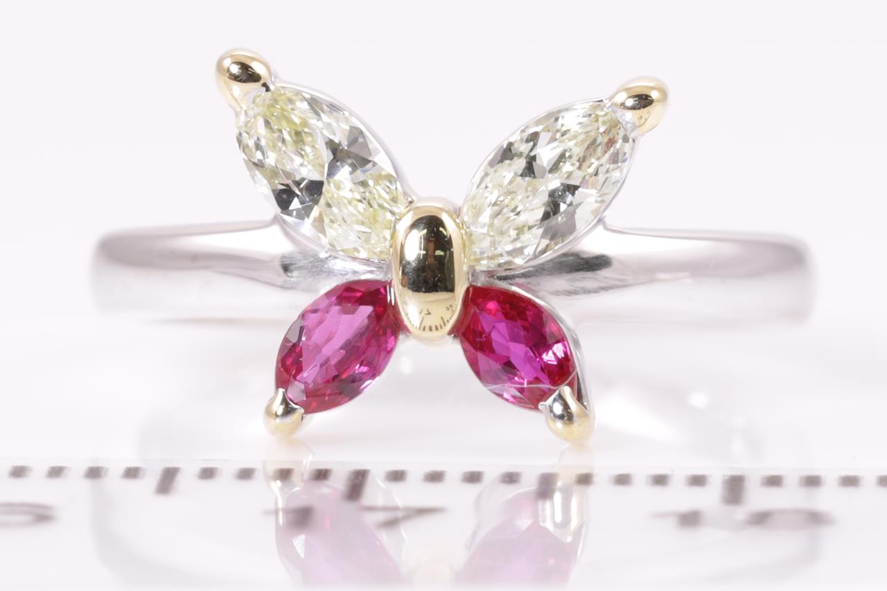 Ruby and Diamond butterfly ring with 2 marquise cut rubies of 0.34cts and 2 marquise cut Diamonds of 0.46cts (Estimated grading: light yellow VS-SI). Platinum and yellow gold. Ring size: M. Weight: 6.2g. (Pre-owned)