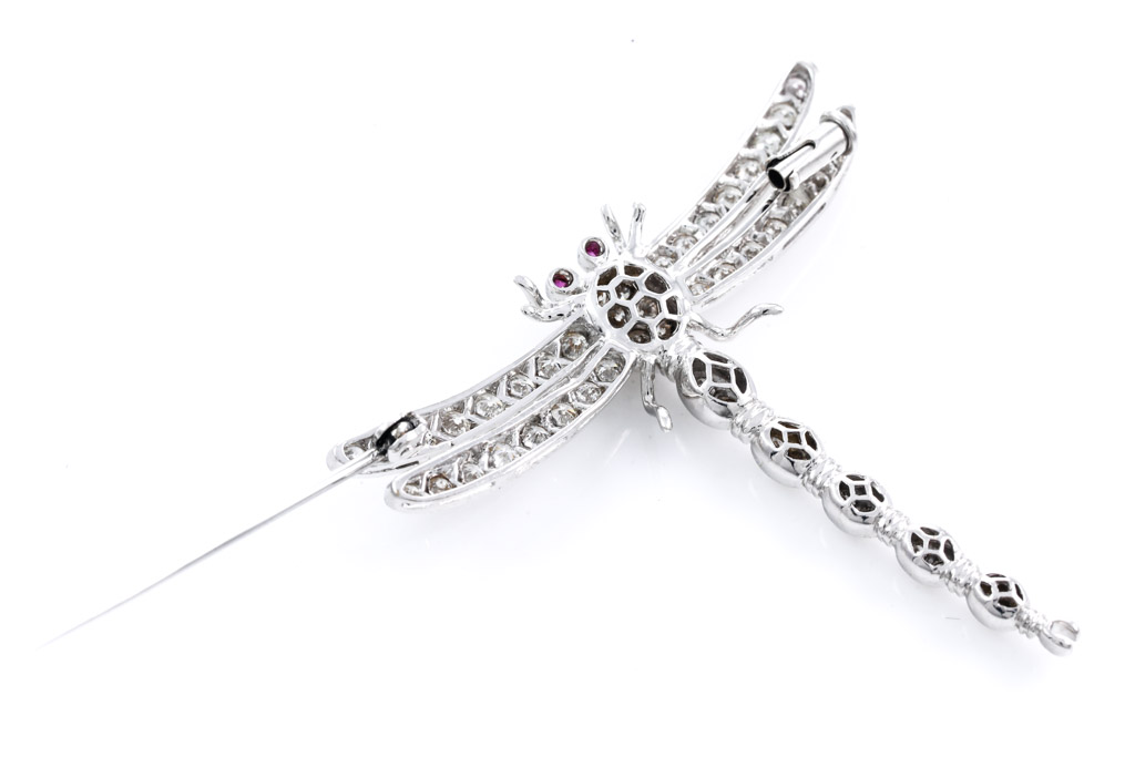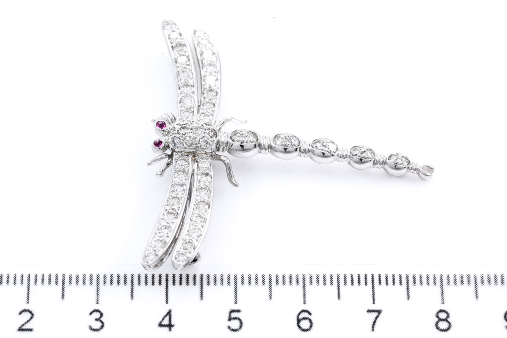 Ruby and Diamond dragonfly designed brooch with round Rubies totalling 0.04cts and round Diamonds totalling 1.79cts (Estimated grading: I-J SI). 18ct white gold. Weight: 7.3g. (Pre-owned)