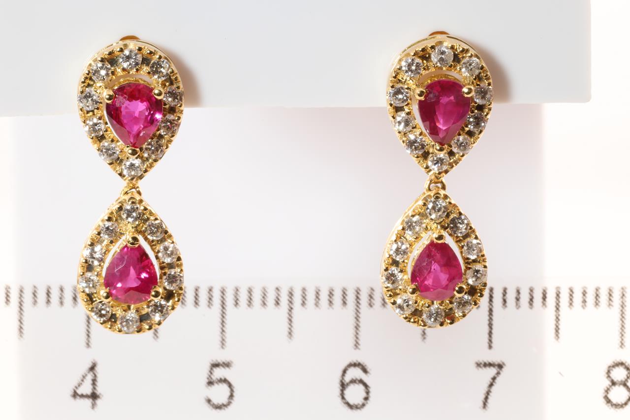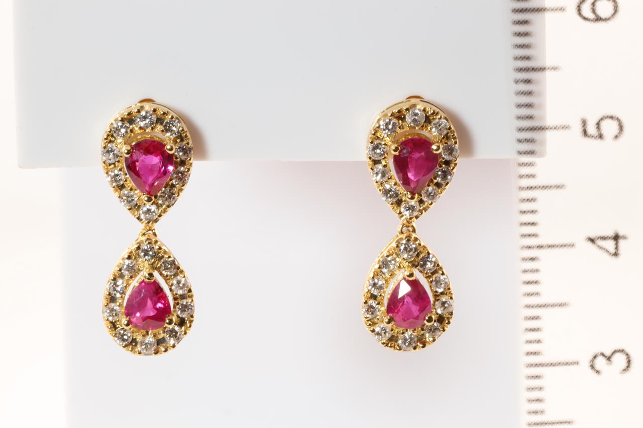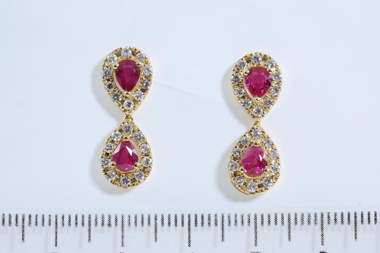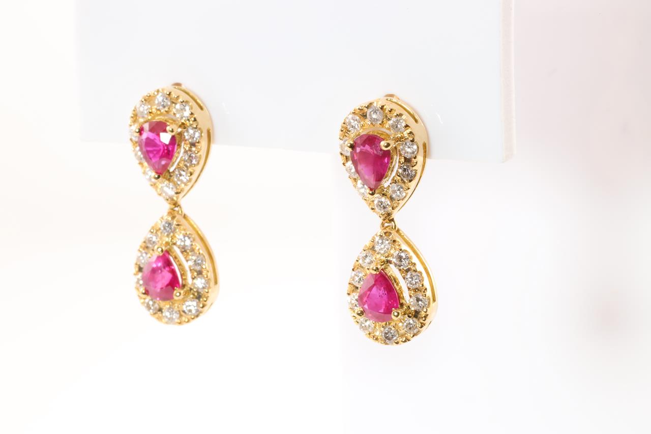 needs new pic...Ruby and Diamond earrings with 4 pear shape Rubies totalling 1.36cts and Diamonds totalling 0.64cts (Estimated grading: H SI). 18ct yellow gold with gold & silicon backs. (Pre-owned)