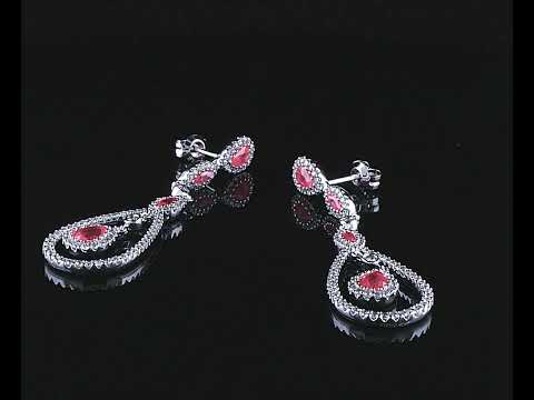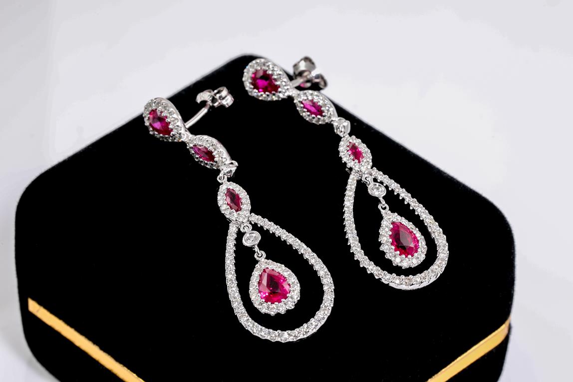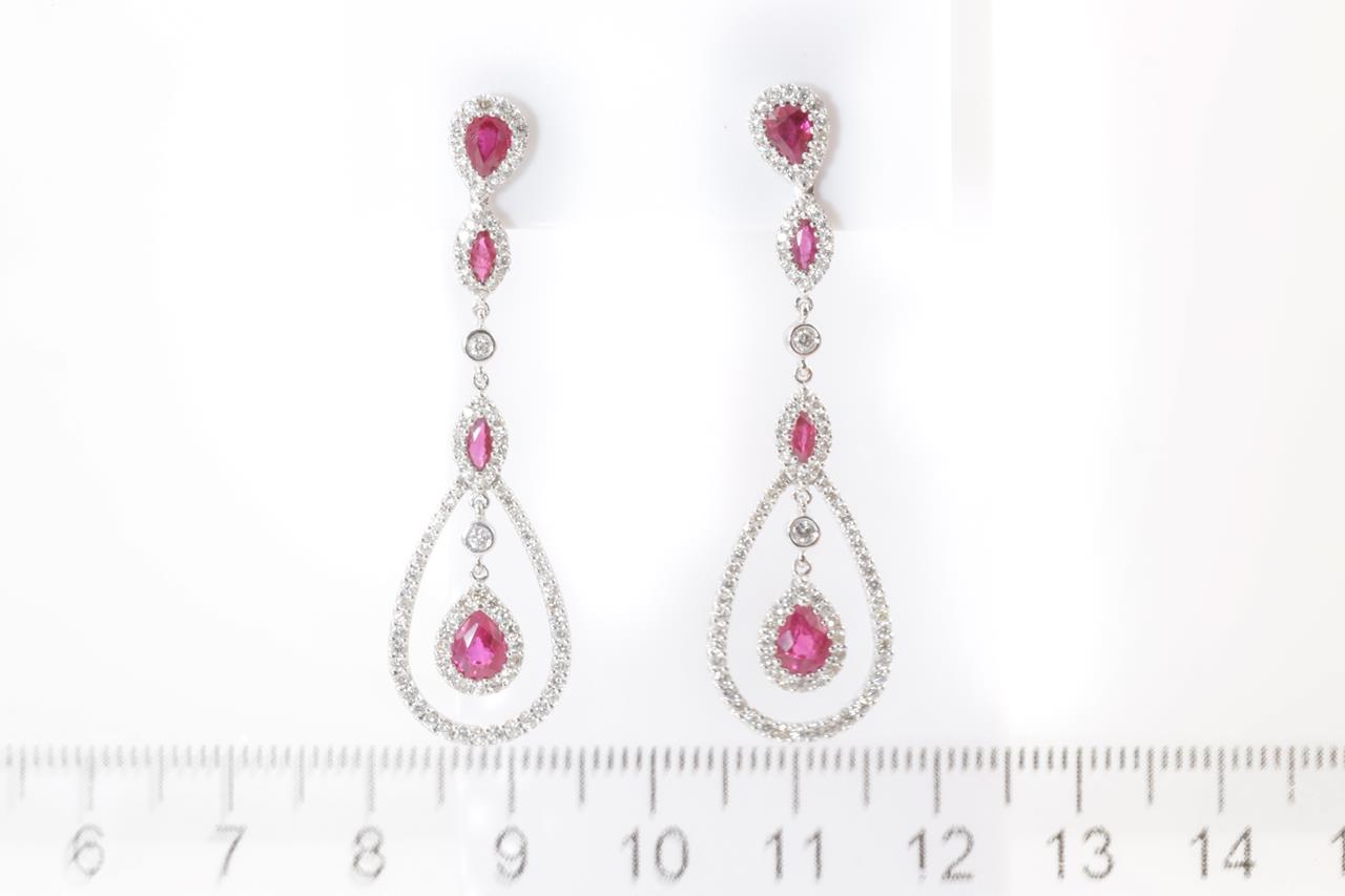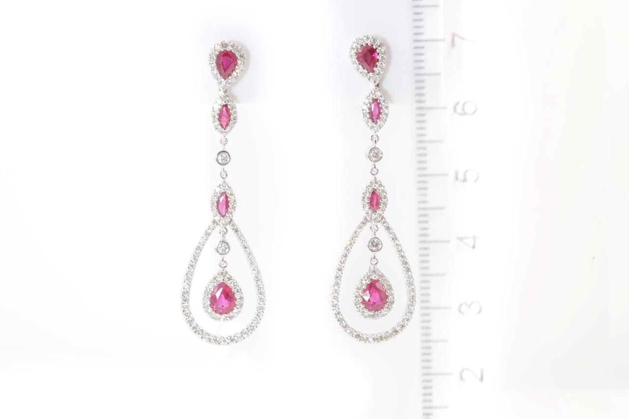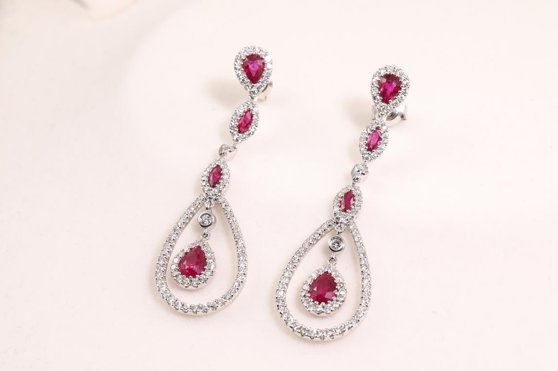 Ruby and Diamond drop earrings with pear & marquise cut Rubies totalling 1.65cts and Diamonds totalling 1.10cts (Estimated grading: H-I SI). 18ct white gold with 14ct gold backs. Weight: 7.4g (Pre-owned)