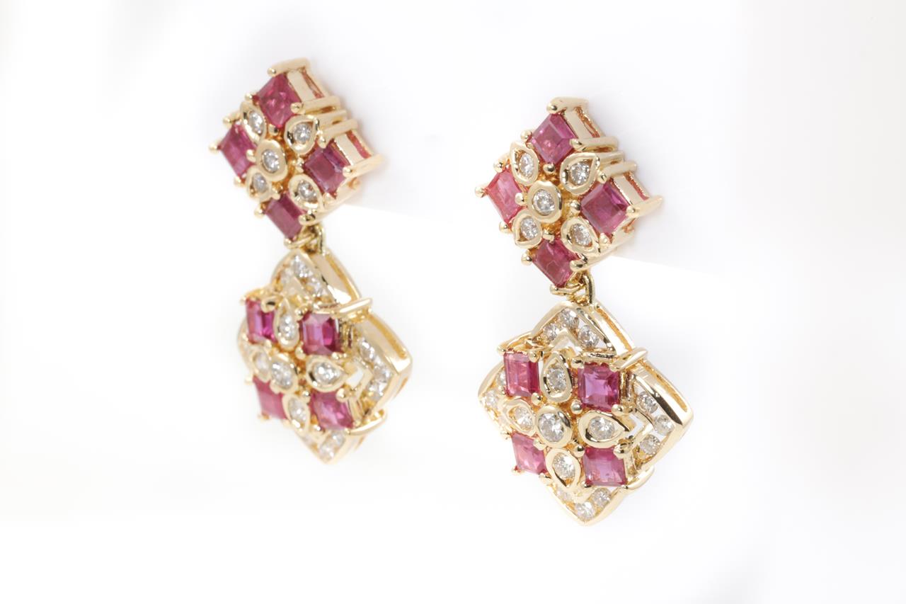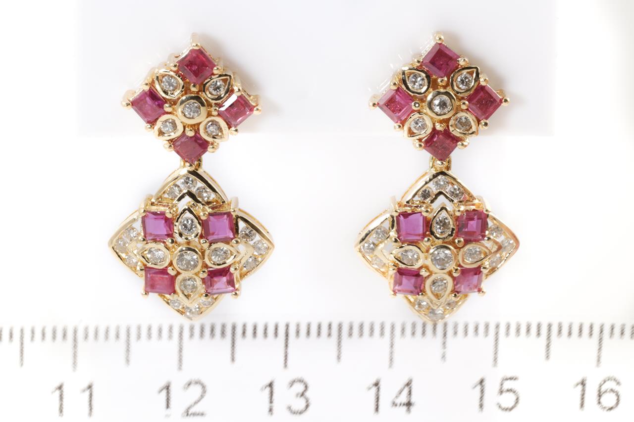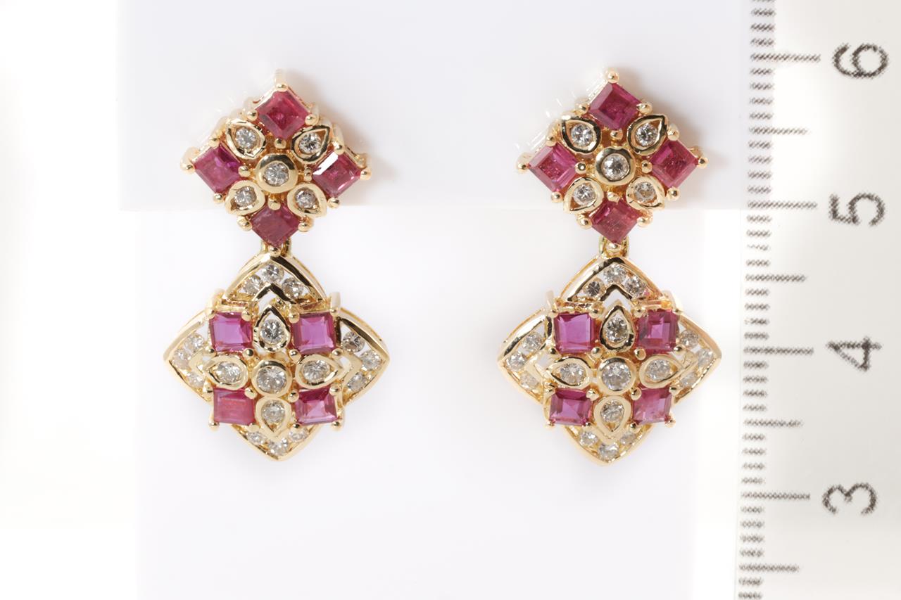 Ruby and Diamond earrings with carre cut Rubies totalling approximately 2.00cts and Diamonds totalling 0.82cts (Estimated grading: H SI). 18ct yellow gold. Weight: 9.6g (Pre-owned)