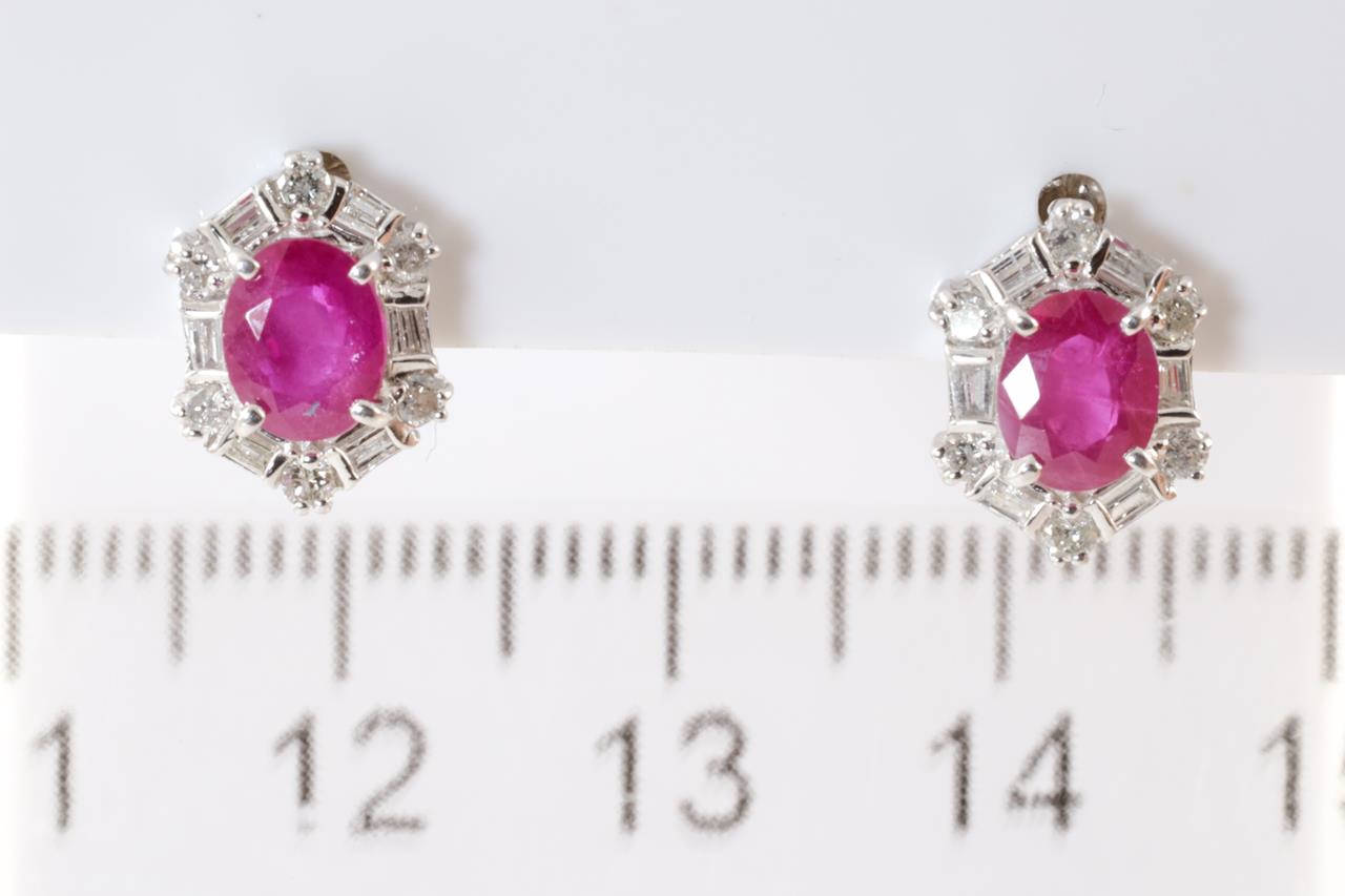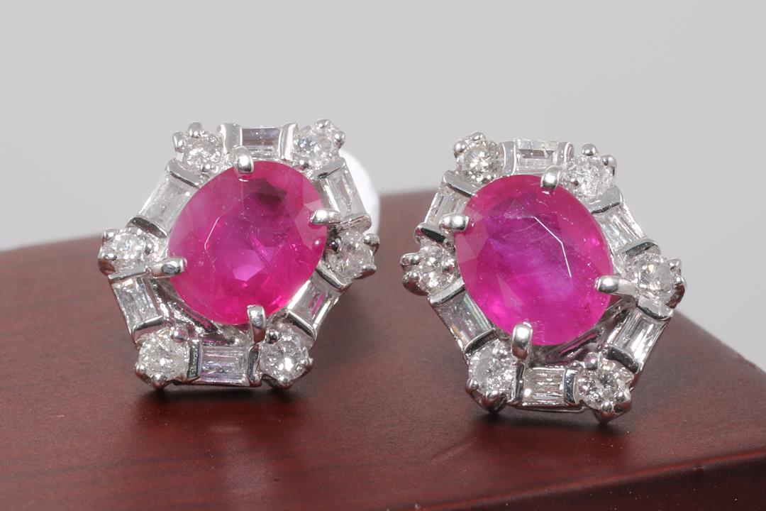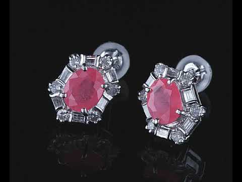 Ruby and Diamond earrings with oval Rubies totalling 1.34cts with round ad baguette cut Diamonds totalling 0.40cts (Estimated grading: H P1-2). Platinum with platinum & silicon backs. Weight: 3.0g (Pre-owned)