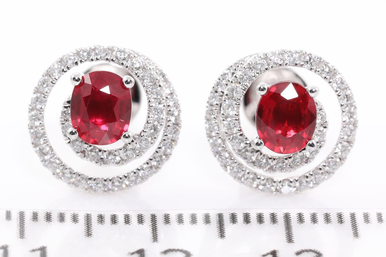 Ruby and Diamond earrings with oval Rubies totalling 1.20cts and Diamonds totalling 0.50cts (Estimated grading: G SI). 18ct white gold. Weight: 3.9g. (Pre-owned)