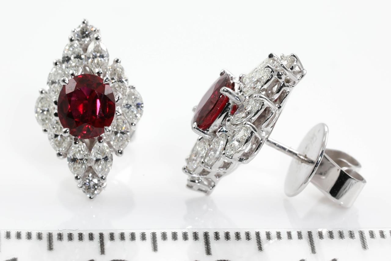 Ruby and Diamond Earrings with oval shape African Rubies totalling approximately 2.10cts in total and round and marquise cut Diamonds totalling approximately 1.56cts (Estimated grading: G-H VS-SI). 18ct white gold. Weight 5.7g. With GSL certificate #AA65548/5. (Pre-owned)